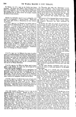 100 TE WAKA MAORI O NIU TIRANI. Te Taitei, i te 15 o nga ra, ka huihui ano taua runanga. Ka haere atu tetahi o taua runanga ki te titiro i te tupapaku ; ka hura nga kakahu, tirohia ana kua mangu kino te uma i te toto, me te kaki hoki. Ka hapainga ake te pane, tawari ke te kaki—katahi ka kitea he mea kohuru. Katahi ka tuhituhia mai ki au te pukapuka a te matua o te tupapaku:—" E hoa e Paora. Haere mai kua mate taku kotiro, a Henarieta, he mea kohuru na Nutana." I te 16 o nga ra, i te Parairei, ka huihui nga ta- ngata katoa ki Kohimarama, ki to wahi i mate ai te tupapaku. I te ata, i te 10 o nga haora, ka timata te whakawa a maua ko te Hemara; ahiahi noa ka kitea te take o te kohuru i nga kai-whaki. Ko te hara, he ngakau whakatakoto mauahara. Ko te kupu a Nutana, no mua i puta ai no te tau 1873 :—" Ki te rangona e au kua hara taku kotiro ki te tane, moe iho aku kanohi kua mate." Tae noa nei ki tenei, ki te tau 1874, ka pa nei taua wahine ki te hara, ka tuaruatia aua kupu a Nutana, apitiria mai hoki ki te kupu nei, ara:—"Ko ahau ma te ringa Pakeha." Na konei ka tino kitea e maua, e te runanga hoki, nana ano i whawhati te kaki. Mea atu ana ahau ki nga matua o te tupapaku kia kaua e tanumia; kua kitea te hara, me tuku te tupapaku kia tirohia e nga rata—ahakoa pirau. I te ahiahi tukua ana e au ma te runanga e titiro taua whakawakanga; whakataua ana e te runanga na Nutana i kohuru. I te 17 o nga ra, i te Rahoroi, ka maua te puka- puka o te whakawakanga kia kite te Komihana Keepa, kia mohio ai ia he kohuru kei Orakei, i Kohimarama, kia haere mai ratou ko nga katipa kia hopukina te kai-kohuru. Tere tonu te haere mai a te Komihana me nga Katipa; tae mai, titiro ana i te tupapaku, kua kite he mea kohuru, mau iho ki a Nutana maua atu ana ki te Whare Herehere. I te 18 o nga ra, i te Wiki, ka tikina mai te tupa- paku e nga katipa, ka maua atu ki te taone ki te whare takotoranga tupapaku. I te 19 o nga ra, i te Manei, i te 1 o nga haora, i te mutunga o te tina, ka huihui te runanga Huuri o te Korona ; haere ana kia kite i te tupapaku, me te Rata hoki; tae atu, ka kite, hoki ana ki te whakawa. Ko te Rata i noho atu ki tana mahi nui, rapu ai i nga mea i mate ai te tupapaku, ahiahi noa ka mutu. I te 20 o nga ra, i te Turei, ka tu ano te kooti, ahi- ahi noa, ka mutu nga Maori. Ka tu ko te Rata ; e rua haora i korero ai i tana mahi, po noa. Whaka- taua ana e te runanga Korona na Nutana i kohuru a Henarieta. Maua atu ana ki te Whare Herehere mo nga marama e toru kia puare te Kooti Hupirimi. I te wiki tuatahi o Hanuere, i te 4 o nga ra, ka whakawakia ano a Nutana. Katahi ka maua e te Rata nga wheua o te tupapaku ki te Kooti, ka ata korero te Rata i te kino o te mate o te tupapaku. Ko te wheua hononga atu ki te matenga kahore i pakaru, engari i motumotu i nga uaua hononga ki a raua whakawheua. Ko te wheua o te kaki i pera ano to tera i te tuara, i pera ano to te iwi tuaroa, ko te uaua roa e maro nei i waenga nui o te iwi tuararoa motu katoa tera. Tirohia ana hoki te riu o te tupa- paku, kahore rawa he mea mate o mua atu i kitea ki tona tinana—ki ana te Rata he mea whakawhati ano i te kaki. Na reira, tau tonu te whakaaro a te tekau ma rua ki nga korero a te Rata, a nga Maori hoki, On Thursday, the 15th, the "Runanga," or in- quest, again assembled. One of them uncovered the body, and it was found that the breast and neck had become quite black from extravasation of blood. On lifting up the head it was discovered that the neck was broken—the skin, &c., only holding it. They then felt convinced that murder had been com- mitted. The parents of the deceased then wrote the follow- ing letter to me :—" Friend Paora,—Come hither. My daughter Henrietta has been murdered by Newton." On Friday, the 16th, the people all assembled at Kohimarama, the place where the murder was com- mitted. The inquiry commenced at 10 o'clock a.m. before myself and Te Hemara, and was continued till the evening. From the statements of the witnesses who were examined, it appeared that jealousy and revenge were the inciting causes of the murder. Newton had said, in the year 1873, alluding to Henrietta :—" If I hear that this girl in my charge has cohabited with any man, ere I close my eyes in sleep (she) will die." Now, in the year 1874, she did so; and Newton repeated the above words, adding, " And let me die by the hand of the Pakeha." Therefore it was clear to us, and also to the other members of the inquest, that Newton had broken her neck. I then told the parents of the deceased not to bury her, as the guilt had been discovered, and it would be proper to allow the doctors to examine the body, even if decomposition were commenced. In the evening I submitted the case to the " Runanga " for their final decision, and they unanimously decided that Newton had committed the murder. On Saturday, the 17th, the written report of the examination was sent to Mr. Commissioner Kemp, that he might know that a murder had been com- mitted at Orakei, Kohimarama, and that he might come with the police and apprehend the murderer. He came immediately, accompanied by policemen, viewed the body of the deceased, saw that she had been murdered, apprehended Newton, and took him off to gaol. On the 18th, Sunday, constables came and con- veyed the body to town, and placed it in the dead- house there. On the 19th, at 1 o'clock p.m., the Coroner's inquest met. They, accompanied by the doctor, went to view the body, and then returned to proceed with the investigation. The doctor remained behind to perform his great work, viz., the examination of the body for the purpose of discovering the cause of death. On this he was engaged till the evening. On Tuesday, the 20th, the investigation was resumed and continued till evening, when the exam- ination of the Maori witnesses was concluded. The doctor then gave his evidence as to his examination of the body. His evidence occupied two hours, and it was then dark. The Coroner's jury found that Newton was guilt