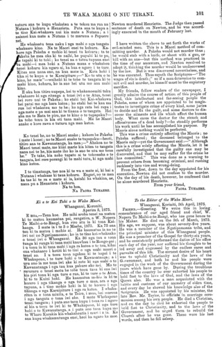 TE WAKA MAORI O NIU TIRANI. 101 tuturu ana te kupu whakatau a te tekau ma rua na Nutana i kohuru a Henarieta. Puta ana te kupu a te tino Kai-whakawa nui kia mate a Nutana ; a i naianei kua mate a Nutana i te marama o Pepuere nei. He whakaatu tena naku i nga mahi o nga tangata whakaaro kino. Na te Maori enei tu kohuru. Ka- hore nga Pakeha e mohio ki tenei tu kohuru ; ta te pakeha he mea oka ki te naihi, he pupuhi ki te pu he tapahi ki te toki; ko tenei na o tatou tupuna enei tu mahi—i mea hoki a Nutana mana e whakahou tenei kohuru kia ngaro ai, ka hua e ngaro i te ture. Kitea ana nana ano, na kua mate ia. Koia hoki i tika oi te kupu o te Karaipiture ;—" Ko to utu o te kino, he mate"—waihoki ki te tohe te tangata ki te mahi kino, kohuru, ko ia ano hei utu mo aua mahi kino. E aku hoa titiro nupepa, kei te whakamoemiti taku whakaaro ki nga ritenga a tenei iwi o te Atua, tenei iwi roro nui te Pakeha ; ko etahi hei Kai-whakawa hei patai mo nga hara katoa ; ko etahi hei te kau ma rua hei whakatau mo te he ; ko nga rata hei rapu i nga mate e pa mai ana ki te tinana o te tangata. Hei aha ma te Rata te piro, me te kino o te tupapaku?— ka tohe tonu ia kia oti tana mahi. Me he Maori snake e kore rawa e tuturu nga mea katoa. Ko tenei he, no te Maori anake ; kahore he Pakeha i mate i konei; no te Maori anake te tupapaku—heoti, titiro ana te Kawanatanga, ka mea;—" Ahakoa no te Maori tenei mate, me kimi marie kia kitea te tangata nana nei te he, kia mate iho ko ia ano te utu mo toua he." Te take, kia noho tupato ai te tokomaha o te tangata, kei rere porangi ki te mahi tutu, ki nga mahi kino katoa. I te timatanga, tae noa ki te wa e mate ai, ki hai a Nutana i whakaae ki taua kohuru. Engari, no te mea ka tae ki te ra e mate ai ia, katahi ka whakina, ae, nana pu a Henarieta i kohuru. Na to hoa, NA PAORA. TUHAERE. Ki a te Kai Tuhi o te Waka Maori. Whanganui, Koroniti, Aperira 5, 1875. E HOA.,—Tena koe. He mihi aroha tenei na matou ki to matou kaumatua pai, rangatira, a W. Nopera Te Maihi-o-te-Rangi, kua riro atu ia ki tona Kai- hanga. I mate ia i te 5 o Maehe, 1875. Ka 75 ona tau ki ta matou i mohio ai. He kaumatua ia no te iwi nei no Ngatipamoana; ko ia te tino kaiwhakaako o tenei iwi o Whanganui. Ka 36 nga tau o tona tunga ki runga ki tana mahi kauwhau i te Rongo-pai; i u tonu ia ki tana mahi i nga ra katoa o to tau, kihai ona whakaaro i kotiti ki te tini o nga mahi maori o tenei ao. I u tonu tona ngakau ki te hapai i te Whakapono, i te ture hoki o te Kawanatanga; a i uru ano ia me tona iwi ake ki roto ki nga mahi o te Kawanatanga i nga tau kua pahure ake nei. Mo te raruraru o tenei motu he tohe tonu taua ki ona iwi kia piri tonu ki nga ture e rua, ki te ture o tu Atua, ki to te Kuini hoki. He kaumatua mohio ia ki te korero i nga tikanga o nga ture o mua, ara o nga tupuna, a i tino mohio hoki ia Id to korero i nga tikanga o nga Karaipiture i nga ra katoa. I whaka- ritea ia e tona minita, e te Teira, i mua, hei marena i nga tangata o tona iwi ake. I mato Whakapono tenei, tangata; i puta ano tana kupu i tona ra i ngaro ai kia u tonu te iwi ki te Whakapono, ki nga ture hoki o to Kawanatanga, a i puta ano tana, kupu mo te Whare Karakia kia whakahoutia i muri i a ia. Ko ana kupu whakamutunga enei, heoi ka ngaro ka moe. Newton murdered Henrietta. The Judge then passed sentence of death on Newton, and he was accord- ingly executed in the month of February last. I have written the above to set forth the works of evil-minded men. This is a Maori method of com- mitting murder. A Pakeha would not murder thus ; he would stab with a knife, or shoot with a gun, or kill with au axe—but this method was practiced in the time of our ancestors, and Newton resolved to adopt it, thinking the murder would be undiscovered by the law. But it was discovered nevertheless, and he was executed. Thus sayeth the Scriptures—" The wages of sin is death ;" so if a man determine to com- mit evil and murder, he himself must bo the expiatory sacrifice. My friends, fellow readers of the newspaper, I greatly admire the course of action of this people of God, this intellectual and far-seeing people the Pakeha, some of whom are appointed to be magis- trates to investigate crime of every kind, some juries to decide and fix the guilt, and some doctors to dis- cover the ailments and ills which affect the human body. What cares the doctor for the stench and oftensiveness of a dead body ?—ho steadily performs his work until he has accomplished his purpose. By Maoris alone nothing would be perfected. This was a crime entirely affecting the Maoris ; no Pakeha suffered; the deceased belonged to the Maoris only—yet the Government said:—"Although this is a crime solely affecting the Maoris, let it be carefully investigated that the guilty one may be discovered, and that he may suffer for the crime he has committed." This was done as a warning to prevent others from becoming criminal, and rushing recklessly into vice and wrong-doing. From the first, down to the day appointed for his execution, Newton did not confess to the murder. Ou the day of his death, however, he confessed that he alone murdered Henrietta. From your friend, PAORA TUHAERE. To the Editor of the Waka Maori. Whanganui, Koriniti, 5th April, 1875. FRIEND,—Greeting. We write this in loving, remembrance of our aged friend and chief, W. Nopera Te Maihi-o-te-Rangi, who has gone hence to his Maker. He died on the 5th of March, 1875. His age, we suppose, was about seventy-five years. He was a member of the Ngati pa means tribe, and the principal minister of this Whanganui people. He was a preacher of the Gospel for thirty-six years, and he consistently performed the duties of his office each day of the year, nor suffered his thoughts to be led away and engrossed by the endless cares and pursuits of this life. The earnest desire of his heart was to uphold Christianity and the laws of the Government, and both he and his people were engaged in the work of the Government dur