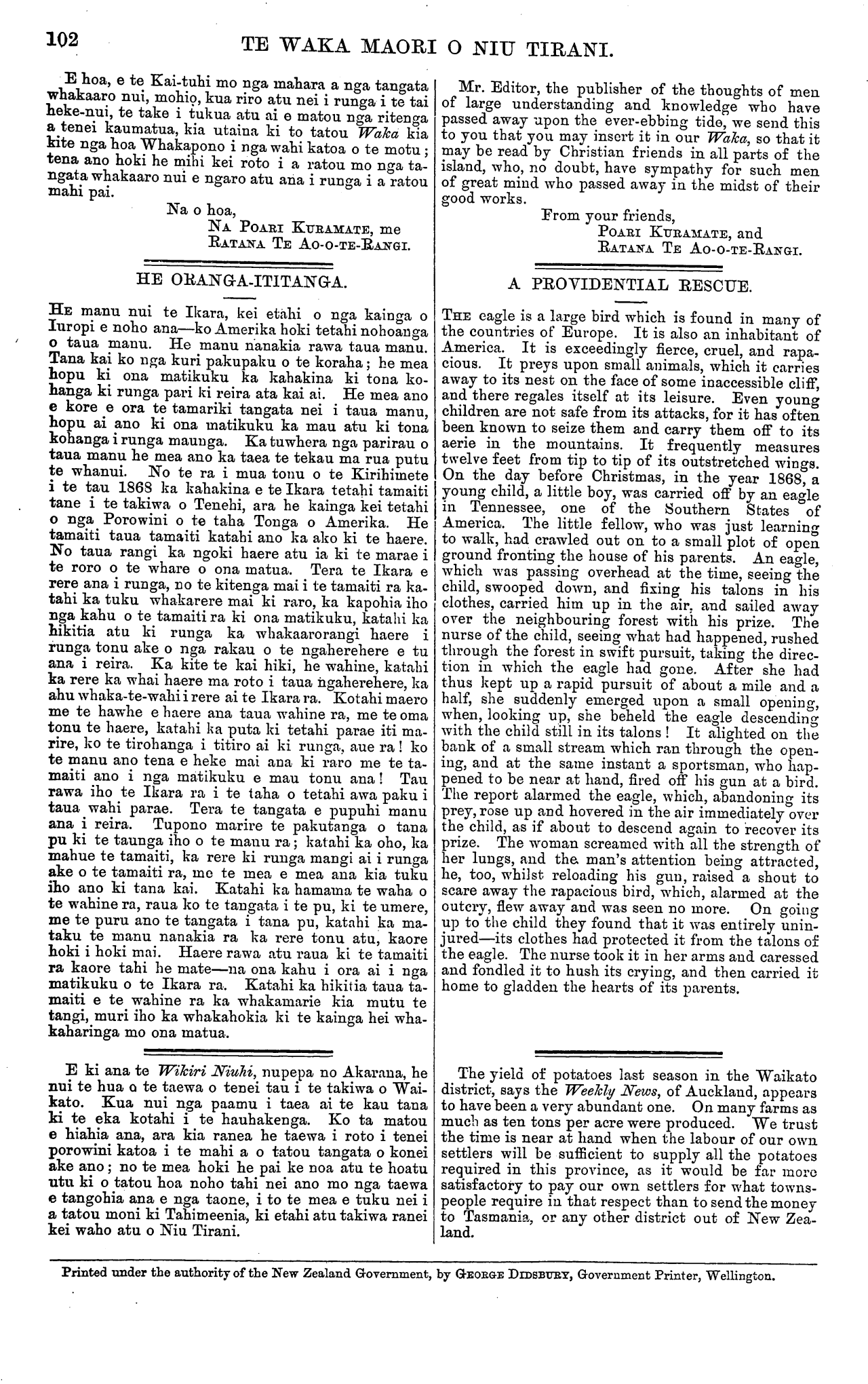 102 TE WAKA MAORI O NIU TIRANI. E hoa, e te Kai-tuhi mo nga mahara a nga tangata whakaaro nui, mohio, kua riro atu nei i runga i te tai heke-nui, te take i tukua atu ai e matou nga ritenga a tenei kaumatua, kia utaina ki to tatou Waka kia kite nga hoa Whakapono i nga wahi katoa o te motu ; tena ano hoki he mihi kei roto i a ratou mo nga ta- ngata whakaaro nui e ngaro atu ana i runga i a ratou mahi pai. Na o hoa, NA POARI KURAMATE, me RATANA TE AO-O-TE-RANGI. HE ORANGA-ITITANGA. HE manu nui te Ikara, kei etahi o nga kainga o Iuropi e noho ana—ko Amerika hoki tetahi nohoanga o taua manu. He manu nanakia rawa taua manu. Tana kai ko nga kuri pakupaku o te koraha; he mea hopu ki ona matikuku ka kahakina ki tona ko- hanga ki runga pari ki reira ata kai ai. He mea ano e kore e ora te tamariki tangata nei i taua manu, hopu ai ano ki ona matikuku ka mau atu ki tona kohanga i runga maunga. Ka tuwhera nga parirau o taua manu he mea ano ka taea te tekau ma rua putu te whanui. No te ra i mua tonu o te Kirihimete i te tau 1868 ka kahakina e te Ikara tetahi tamaiti tane i te takiwa o Tenehi, ara he kainga kei tetahi o nga Porowini o te taha Tonga o Amerika. He tamaiti taua tamaiti katahi ano ka ako ki te haere. No taua rangi ka ngoki haere atu ia ki te marae i te roro o te whare o ona matua. Tera te Ikara e rere ana i runga, no te kitenga mai i te tamaiti ra ka- tahi ka tuku whakarere mai ki raro, ka kapohia iho nga kahu o te tamaiti ra ki ona matikuku, katahi ka hikitia atu ki runga ka whakaarorangi haere i runga tonu ake o nga rakau o te ngaherehere e tu ana i reira. Ka kite te kai hiki, he wahine, katahi ka rere ka whai haere ma roto i taua ngaherehere, ka ahu whaka-te-wahi i rere ai te Ikara ra. Kotahi maero me te hawhe e haere ana taua wahine ra, me te oma tonu te haere, katahi ka puta ki tetahi parae iti ma- rire, ko te tirohanga i titiro ai ki runga, aue ra i ko te manu ano tena e heke mai ana ki raro me te ta- maiti ano i nga matikuku e mau tonu ana i Tau rawa iho te Ikara ra i te taha o tetahi awa paku i taua wahi parae. Tera te tangata e pupuhi manu ana i reira. Tupono marire te pakutanga o tana pu ki te taunga iho o te manu ra; katahi ka oho, ka mahue te tamaiti, ka rere ki runga mangi ai i runga ake o te tamaiti ra, mo te mea e mea ana kia tuku iho ano ki tana kai. Katahi ka hamama te waha o te wahine ra, raua ko te tangata i te pu, ki te umere, me te puru ano te tangata i tana pu, katahi ka ma- taku te manu nanakia ra ka rere tonu atu, kaore hoki i hoki mai. Haere rawa atu raua ki te tamaiti ra kaore tahi he mate—na ona kahu i ora ai i nga matikuku o te Ikara ra. Katahi ka hikitia taua ta- maiti e te wahine ra ka whakamarie kia mutu te tangi, muri iho ka whakahokia ki te kainga hei wha- kaharinga mo ona matua. E ki ana te Wikiri Niuhi, nupepa no Akarana, he nui te hua o te taewa o tenei tau i te takiwa o Wai- kato. Kua nui nga paamu i taea ai te kau tana ki te eka kotahi i te hauhakenga. Ko ta matou e hiahia ana, ara kia ranea he taewa i roto i tenei porowini katoa i te mahi a o tatou tangata o konei ake ano; no te mea hoki he pai ke noa atu te hoatu utu ki o tatou hoa noho tahi nei ano mo nga taewa e tangohia ana e nga taone, i to te mea e tuku nei i a tatou moni ki Tahimeenia, ki etahi atu takiwa ranei kei waho atu o Niu Tirani. Mr. Editor, the publisher of the thoughts of men of large understanding and knowledge who have passed away upon the ever-ebbing tide, we send this to you that you may insert it in our Waka, so that it may be read by Christian friends in all parts of the island, who, no doubt, have sympathy for such men of great mind who passed away in the midst of their good works. From your friends, POARI KURAMATE, and RATANA. TE AO-O-TE-RANGI. A PROVIDENTIAL RESCUE. THE eagle is a large bird which is found in many of the countries of Europe. It is also an inhabitant of America. It is exceedingly fierce, cruel, and rapa- cious. It preys upon small animals, which it carries away to its nest on the face of some inaccessible cliff, and there regales itself at its leisure. Even young children are not safe from its attacks, for it has often been known to seize them and carry them off to its aerie in the mountains. It frequently measures twelve feet from tip to tip of its outstretched wings. On the day before Christmas, in the year 1868, a young child, a little boy, was carried off by an eagle in Tennessee, one of the Southern States of America. The little fellow, who was just learning to walk, had crawled out on to a small plot of open ground fronting the house of his parents. An eagle, which was passing overhead at the time, seeing the child, swooped down, and fixing his talons in his clothes, carried him up in the air; and sailed away over the neighbouring forest with his prize. The nurse of the child, seeing what had happened, rushed through the forest in swift pursuit, taking the direc- tion in which the eagle had gone. After she had thus kept up a rapid pursuit of about a mile and a half, she suddenly emerged upon a small opening, when, looking up, she beheld the eagle descending with the child still in its talons ! It alighted on the bank of a small stream which ran through the open- ing, and at the same instant a sportsman, who hap- pened to be near at hand, fired off his gun at a bird. The report alarmed the eagle, which, abandoning its prey, rose up and hovered in the air immediately over the child, as if about to descend again to recover its prize. The woman screamed with all the strength of her lungs, and the man's attention being attracted, he, too, whilst reloading his gun, raised a shout to scare away the rapacious bird, which, alarmed at the outcry, flew away and was seen no more. On going up to the child they found that it was entirely unin- jured—its clothes had protected it from the talons of the eagle. The nurse took it in her arms and caressed and fondled it to hush its crying, and then carried it home to gladden the hearts of its parents. The yield of potat