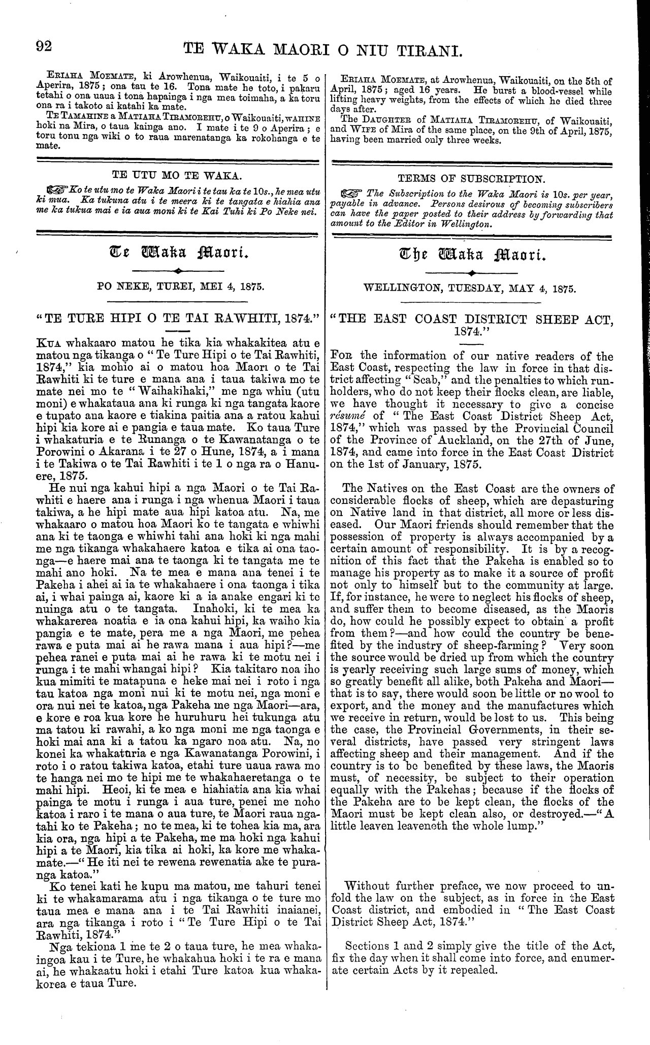 92 TE WAKA MAORI O NIU TIRANI. ERIAHA MOEMATE, ki Arowhenua, Waikouaiti, i te 5 o 1 Aperira, 1875 ; ona tau te 16. Tona mate he toto, i pakaru tetahi o ona uaua i tona hapainga i nga mea toimaha a ka toru ona ra i takoto ai katahi ka mate. TE TAMAHINE a MATIAHA TIRAMOREHU, o Waikouaiti, WAHINE hoki na Mira, o taua kainga ano. I mate i te 9 o Aperira ; e toru tonu nga wiki o to raua marenatanga ka rokohanga e te mate. TE UTU MO TE WAKA. Ko te utu mo te Waka Maori i te tau ka te 10s., he mea utu ki mua. Ka tukuna atu i te meera ki te tangata e hiahia ana me ka tukua mai e ia aua moni ki te Kai Tuhi ki Po Neke nei. PO NEKE. TUREI, MEI 4, 1875. " TE TURE HIPI O TE TAI RAWHITI, 1874." KUA whakaaro matou he tika kia whakakitea atu e matou nga tikanga o " Te Ture Hipi o te Tai Rawhiti, 1874," kia mohio ai o matou hoa Maori o te Tai Rawhiti ki te ture e mana ana i taua takiwa mo te mate nei mo te " Waihakihaki," me nga whiu (utu moni) e whakataua ana ki runga ki nga tangata kaore e tupato aua kaore e tiakina paitia ana a ratou kahui hipi kia kore ai e pangia e taua mate. Ko taua Ture i whakaturia e te Runanga o te Kawanatanga o te Porowini o Akarana i te 27 o Hune, 1874, a i mana i te Takiwa o te Tai Rawhiti i te 1 o nga ra o Hanu- ere, 1875. He nui nga kahui hipi a nga Maori o te Tai Ra- whiti e haere ana i runga i nga whenua Maori i taua takiwa, a he hipi mate aua hipi katoa atu. Na, me whakaaro o matou hoa Maori ko te tangata e whiwhi ana ki te taonga e whiwhi tahi ana hoki ki nga mahi me nga tikanga whakahaere katoa e tika ai ona tao- nga—e haere mai ana te taonga ki te tangata me te mahi ano hoki. Na te mea e mana aua tenei i te Pakeha i ahei ai ia te whakahaere i ona taonga i tika ai, i whai painga ai, kaore ki a ia anake engari ki te nuinga atu o te tangata. Inahoki, ki te mea ka whakarerea noatia e ia ona kahui hipi, ka waiho kia pangia e te mate, pera me a nga Maori, me pehea rawa e puta mai ai he rawa mana i aua hipi ?—me pehea ranei e puta mai ai he rawa ki te motu nei i runga i te mahi whangai hipi ? Kia takitaro noa iho kua mimiti te matapuna e heke mai nei i roto i nga tau katoa nga moni nui ki te motu nei, nga moni e ora nui nei te katoa, nga Pakeha me nga Maori—ara, e kore e roa kua kore he huruhuru hei tukunga atu ma tatou ki rawahi, a ko nga moni me nga taonga e hoki mai ana ki a tatou ka ngaro noa atu. Na, no konei ka whakaturia e nga Kawanatanga Porowini, i roto i o ratou takiwa katoa, etahi ture uaua rawa mo te hanga nei mo te hipi me te whakahaeretanga o te mahi hipi. Heoi, ki te mea e hiahiatia ana kia whai painga te motu i runga i aua ture, penei me noho katoa i raro i te mana o aua ture, te Maori raua nga- tahi ko te Pakeha; no te mea, ki te tohea kia ma, ara kia ora, nga hipi a te Pakeha, me ma hoki nga kahui hipi a te Maori, kia tika ai hoki, ka kore me whaka- mate.—" He iti nei te rewena rewenatia ake te pura- nga katoa." Ko tenei kati he kupu ma matou, me tahuri tenei ki te whakamarama atu i nga tikanga o te ture mo taua mea e mana ana i te Tai Rawhiti inaianei, ara nga tikanga i roto i "Te Ture Hipi o te Tai Rawhiti, 1874." Nga tekiona 1 me te 2 o taua ture, he mea whaka- ingoa kau i te Ture, he whakahua hoki i te ra e mana ai, he whakaatu hoki i etahi Ture katoa kua whaka- korea e taua Ture. ERIAHA MOEMATE, at Arowhenua, Waikouaiti, on the 5th of April, 1875 ; aged 16 years. He burst a blood-vessel while lifting heavy weights, from the effects of which ho died three days after. The DAUGHTER of MATIAHA TIRAMOREHU, of Waikouaiti, and WIFE of Mira of the same place, on the 9th of April, 1875, having been married only three weeks. TERMS OF SUBSCRIPTION. The Subscription to the Waka Maori is 10s. per year, payable in advance. Persons desirous of becoming subscribers can have the paper posted to their address by forwarding that amount to the Editor in Wellington. WELLING TON, TUESDAY, MAY 4, 1875. "THE EAST COAST DISTRICT SHEEP ACT, 1874." FOR the information of our native readers of the East Coast, respecting the law in force in that dis- trict affecting " Scab," and the penalties to which run- holders, who do not keep their flocks clean, are liable, we have thought it necessary to give a concise resume of " The East Coast District Sheep Act, 1874," which was passed by the Provincial Council of the Province of Auckland, on the 27th of June, 1874, and came into force in the East Coast District on the 1st of January, 1875. The Natives on the East Coast are the owners of considerable flocks of sheep, which are depasturing on Native land in that district, all more or less dis- eased. Our Maori friends should remember that the possession of property is always accompanied by a certain amount of responsibility. It is by a recog- nition of this fact that the Pakeha is enabled so to manage his property as to make it a source of profit not only to himself but to the community at large. If, for instance, he were to neglect his flocks of sheep, and suffer them to become diseased, as the Maoris do, how could he possibly expect to obtain a profit from them?—and how could the country be bene- fited by the industry of sheep-farming ? Very soon the source would be dried up from which the country is yearly receiving such large sums of money, which so greatly benefit all alike, both Pakeha and Maori— that is to say, there would soon be little or no wool to export, and the money and the manufactures which we receive in return, would be lost to us. This being the case, the Provincial Governments, in their se- veral districts, have passed very stringent laws affecting sheep and their management. And if the country is to bo benefited by these laws, the Maoris must, of necessity, be subject to their operation equally with the Pakehas; because if the flocks of the Pakeha are to be kept clean, the flocks of the Maori must be kept clean also, or destroyed.—"A little leaven leaveneth the whole lump." Without further preface, we now proceed to un- fold the law on the subject, as in fo