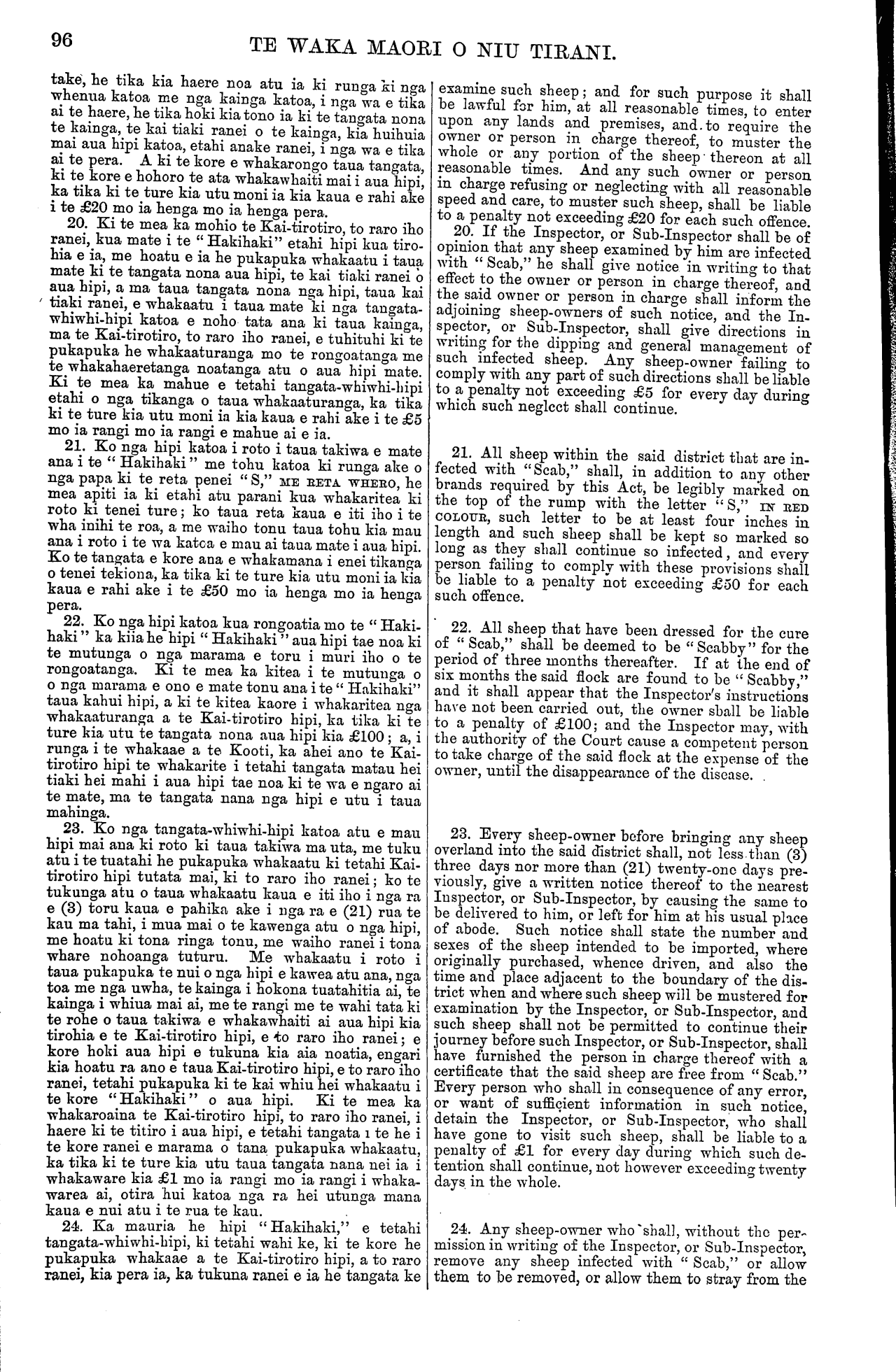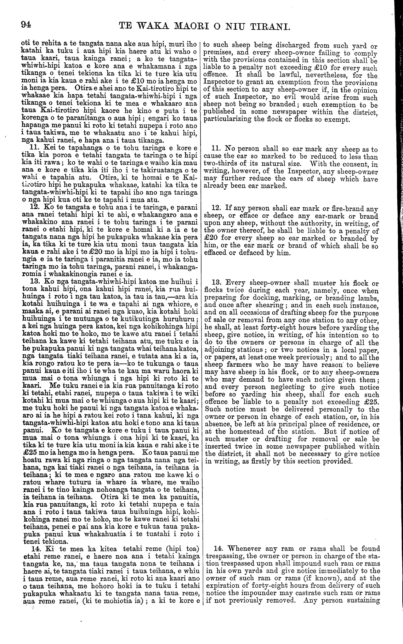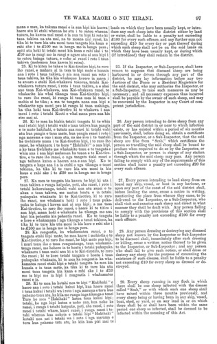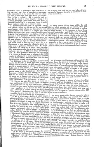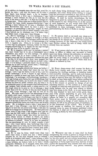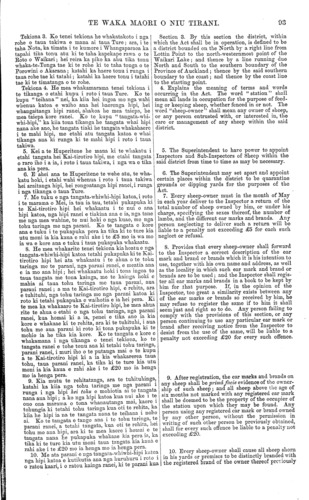 TE WAKA MAORI O NIU TIRANI. 93 Tekiona 3. Ko tenei tekiona he whakatakoto i nga rohe o taua takiwa e mana ai taua Ture ; ara, i te taha Nota, ka timata i te kumore i Whangaparaoa ka tapahi tika tonu atu ki te taha kapekape rawa o te Roto o Waikari; hei reira ka piko ka ahu tika tonu whaka-te-Tonga tae ki te rohe ki to taha tonga o te Porowini o Akarana; katahi ka haere tonu i runga i taua rohe tae ki tatahi; katahi ka haere tonu i tatahi tae ki te timatanga o te rohe. Tekiona 4. He mea whakamarama tenei tekiona i te tikanga o etahi kupu i roto i taua Ture. Ko te kupu " teihana " nei, ka kiia hei ingoa mo nga wahi whenua katoa e waiho ana hei haerenga hipi, hei whangaitanga hipi ranei, ahakoa he mea taiepa, he mea taiepa kore ranei. Ko te kupu " tangata-whi- whi-hipi," ka kiia tona tikanga he tangata whai hipi nana ake ano, ho tangata tiaki he tangata whakahaere i te mahi hipi, me etahi atu tangata katoa e whai tikanga ana ki runga ki te mahi hipi i roto i taua takiwa. 5. Kei a te Huperitene he mana ki to whakatu i etahi tangata hei Kai-tirotiro hipi; me etahi tangata o raro iho i a ia, i roto i taua takiwa, i nga wa e tika ana kia pera. 6. E ahei ana te Huperitene te wehe atu, te wha- katu hoki, i etahi wahi whenua i roto i taua takiwa hei araitanga hipi, hei rongoatanga hipi ranei, i runga i nga tikanga o taua Ture. 7. Me tuku e nga tangata-whiwhi-hipi katoa, i roto i te marama o Mei, ia tau ia tau, tetahi pukapuka ki te Kai-tirotiro hipi hei whakaatu i to nui o ana hipi katoa, nga hipi ranei e tiakina ana e ia, nga tane me nga mea wahine, te nui hoki o nga. kuao, me nga tohu taringa me nga parani. Ko te tangata o kore ana e tuku i te pukapuka pera ka tika ki to ture kia utu moni ia kia kaua e rahi ake i te £5 mo ia wa mo ia wa e kore ana e tuku i taua pukapuka whakaatu. 8. He mea whakarite tenei tekiona kia hoatu e nga tangata-whiwhi-hipi k.atoa tetahi pukapuka ki te Kai- tirotiro hipi hei ata whakaatu i te ahua o te tohu taringa me te parani, nga parani ranei, e meatia ana e ia mo ana hipi; hei whakaatu hoki i tona ingoa to taua tangata me tona kainga, me te kainga hold e mahia ai taua tohu taringa mo taua parani, aua parani ranei; a ma te Kai-tirotiro hipi, o rehita, ara e tuhituhi, nga tohu taringa mo nga parani katoa ki roto ki tetahi pukapuka e waihotia e ia hei pera. Ki te mea ka whakaaro te Kai-tirotiro hipi, he mea ahua rite te ahua o etahi o nga tohu taringa, nga parani ranei, kua homai ki a ia, penei e tika ano ia kia kore e whakaae ki te rehita, ara ki te tuhituhi, i aua tohu me aua parani ki roto ki tona pukapuka ki te mohio ia he tika kia kore. Ko te tangata o kore e whakamana i nga tikanga o tenei tekiona, ko te tangata ranei e tohe tonu ana ki tetahi tohu taringa, parani ranei, i muri iho o te putanga mai o te kupu a te Kai-tirotiro hipi ki a ia kia whakarerea taua tohu, taua parani ranei, ka tika ki te ture kia utu moni ia kia kaua e rahi ake i te £20 mo ia henga mo ia henga pera. 9. Kia mutu te rehitatanga, ara te tuhituhinga, katahi ka kiia nga tohu taringa me nga parani i runga i nga hipi hei tohu e mohiotia ai te tangata nana aua hipi; a ko nga hipi katoa kua nui ake te ono ona marama o tona whanautanga mai, kaore tohungia ki totahi tohu taringa kua oti te rehita, ka kiia he hipi ia na te tangata nana te teihana i noho ai. Ko te tangata e tango aua i te tohu taringa, te parani ranei, a tetahi tangata, kua oti te rehita, hei tohu mo ana hipi, ara ki to mea kaore i homai te tangata nana he pukapuka whakaae kia pera ia, ka tika ki te ture kia utu moni taua tangata kia kaua e rahi ake i te £20 mo ia henga mo ia henga pera. 10. Me ata parani e nga tangata-whiwhi-hipi katoa nga hipi katoa e kutikutia ana nga huruhuru i roto i o ratou kaari, i o ratou kainga ranei, ki te parani kua Section 3. By this section the district, within which the Act shall be in operation, is defined to be a district bounded on the North by a right line from Lottin Point to the north-westernmost point of the Waikari Lake ; and thence by a line running due North and South to the southern boundary of the Province of Auckland ; thence by the said southern boundary to the coast; and thence by the coast line to the starting point. 4. Explains the meaning of terms and words occurring in the Act. The word "station" shall mean all lands in occupation for the purpose of feed- ing or keeping sheep, whether fenced in or not. The word "sheep-owner" shall mean any owner of sheep, or any person entrusted with, or interested in, the care or management of any sheep within the said district. 5. The Superintendent to have power to appoint Inspectors and Sub-Inspectors of Sheep within the said district from time to time as may be necessary. 6. The Superintendent may set apart and appoint certain places within the district to be quarantine grounds or dipping yards for the purposes of the Act. 7. Every sheep-owner must in the month of May in each year deliver to the Inspector a return of the total number of sheep owned by him, or under his charge, specifying the sexes thereof, the number of lambs, and the different oar marks and brands. Any person neglecting to deliver such a return will bo liable to a penalty not exceeding £5 for each such neglect or refusal. 8. Provides that every sheep-owner shall forward to the Inspector a correct description of the ear mark and brand or brands which it is his intention to use, together with his own name and address, as well as the locality in which such ear mark and brand or brands are to be used ; and the Inspector shall regis- ter all ear marks and brands in a book to be kept by him for that purpose. If, in the opinion of the Inspector, too great a similarity exists between any of the ear marks or brands so received by him, he may refuse to register the same if to him it shall seem just and right so to do. Any person failing to comply with the provisions of this section, or any person continuing to use any particular ear mark or brand after receiving notice from the Inspect