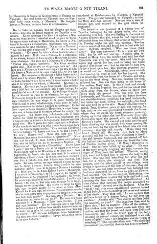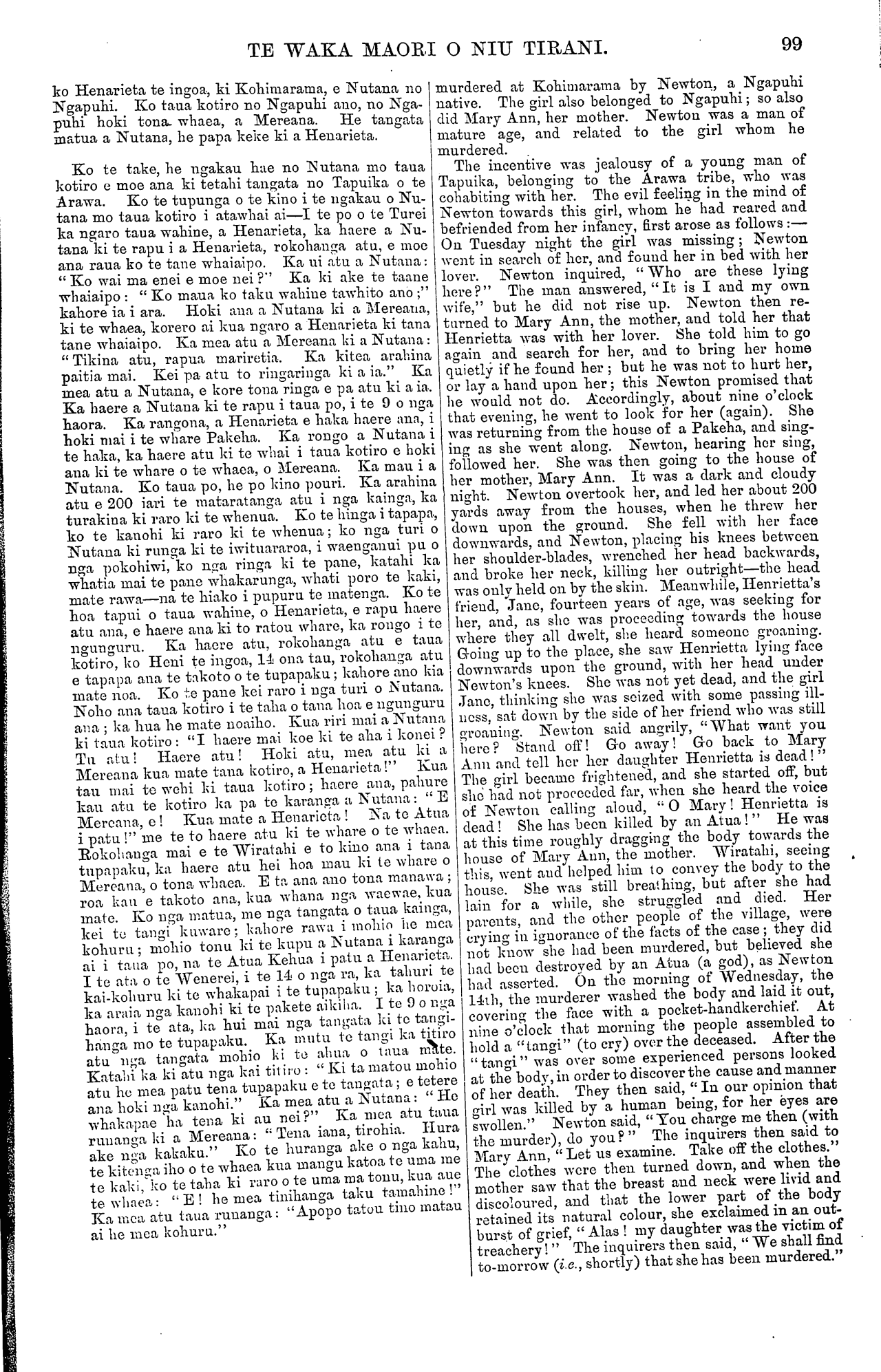 TE WAKA MAORI O NIU TIRANI. 99 ko Henarieta te ingoa, ki Kohimarama, e Nutana no Ngapuhi. Ko taua kotiro no Ngapuhi ano, no Nga- puhi hoki tona whaea, a Mereana. He tangata matua a Nutana, he papa keke ki a Henarieta. Ko te take, he ngakau hae no Nutana mo taua kotiro e moe ana ki tetahi tangata no Tapuika o te Arawa. Ko te tupunga o te kino i te ngakau o Nu- tana mo taua kotiro i atawhai ai—I te po o te Turei ka ngaro taua wahine, a Henarieta, ka haere a Nu- tana ki te rapu i a Heuarieta, rokohanga atu, e moe ana raua ko te tane whaiaipo. Ka ui atu a, Nutana: " Ko wai ma enei e moe nei ?'' Ka ki ake te taane whaiaipo : " Ko maua ko ta.ku wahine tawhito ano ;" kahore ia i ara. Hoki ana a Nutana ki a Mereana, ki te whaea, korero ai kua ngaro a Henarieta ki tana tane whaiaipo. Ka mea atu a Mereana ki a Nutaua: "Tikina atu, rapua mariretia. Ka kitea arahina paitia mai. Kei pa atu to ringaringa ki a ia." Ka mea atu a Nutana, e kore tona ringa e pa atu ki a ia. Ka haere a Nutaua ki te rapu i taua po, i te 9 o nga haora. Ka rangona, a Heuarieta e haka haere ana, i hoki mai i te whare Pakeha. Ka rongo a Nutana i te haka, ka haere atu ki te whai i taua kotiro e hoki ana ki te whare o te whaea, o Mereana. Ka mau i a Nutana. Ko taua po, he po kino pouri. Ka arahina atu e 200 iari te mataratanga atu i nga kainga, ka turakina ki raro ki te whenua. Ko te hinga i tapapa., ko te kanohi ki raro ki te whenua ; ko nga turi o Nutaua ki runga ki te iwituararoa, i waenganui pu o nga pokohiwi, ko nga ringa ki te pane, katahi ka whatia mai te pane whakarunga, whati poro te kaki, mate rawa—na te hiako i pupuru to matenga. Ko te hoa tapui o taua wahine, o Henarieta, e rapu haere atu ana, e haere aua ki to ratou wharo, ka rongo i to ngunguru. Ka haere atu, rokohanga atu e taua kotiro, ko Heni te ingoa, 14 ona tau, rokohanga atu e tapapa aua te takoto o te tupapaku; kahore ano kia mate noa. Ko te pane kei raro i nga turi o Nutana. Noho ana taua kotiro i te taha o tana hoa e ngunguru ar.a ; ka hua he mate noaiho. Kua riri mai a Nutana ki taua kotiro : "I haere ma.i koe ki te aha i konei ? Tu atu! Haere atu! Hoki atu, mea, atu Id a Mereana kua mate tana kotiro, a Heuarieta!" Kua tau mai te wehi Id taua kot.iro ; haere aua, pahure kau at.u te kotiro ka pa to karanga a Nutaua: " E Mereana, e! Kua mate a Henarieta ! Na to Atua i patu !" me te to haere atu ki te whare o te whaea. Rokohanga mai e te Wiratahi e to kino ana i tana tupapaku, ka haere atu hei hoa mau ki te whare o Mereana, o tona whaea. E ta ana ano toua ma.nawa ; roa kau e takoto ana, kua whana nga waewae, kua ma.te. Ko nga matua., me nga tangata o taua kainga, kei tu tangi kuware : kahore rawa i mohio he mea kohuru ; mohio tonu ki te kupu a Nutaua i karanga ai i taua po, na te Atua Kehua i patu a Henarieta. I te ata o te Wenerei, i te 14 o nga ra, ka tahuri te kai-kohuru ki te whakapai i te tupapaku ; ka horoia, ka araia nga kanohi ki te pakete aikiha. I te 9 o nga haora, i te ata, ka hui mai nga tangata Id te tangi- hanga mo te tupapaku. Ka mutu te tangi ka titiro atu nga tangata mohio ki to ahua o taua mate. Katahi ka. ki atu nga kai titiro : " Ki ta matou mohio atu hu mea patu tena tupapaku e te tangata; e tetere ana hoki nga kanohi." Ka mea atu a Nutaua: " He whakapae ha tena ki au nei?" Ka mea atu taua runanga ki a Mereana: "Tena iana, tirohia. Hura ake nga kakaku." Ko te huranga ake o nga kahu, te kitenga iho o te whaea kua mangu katoa to uma me te kaki, ko te taha ki raro o te uma ma tonu, kua aue te. whaea: "E! he mea tinihanga taku tamahine !" Ka mea atu taua runanga: "Apopo tatou tino mat.au ai he mea kohuru." murdered at Kohimarama by Newton, a Ngapuhi native. The girl also belonged to Ngapuhi; so also did Mary Ann, her mother. Newton was a man of mature age, and related to the girl whom he murdered. The incentive was jealousy of a young man of Tapuika, belonging to the Arawa tribe, who was cohabiting with her. The evil feeling in the mind of Newton towards this girl, whom he had reared and befriended from her infancy, first arose as follows :— Ou Tuesday night the girl was missing ; Newton went in search of her, and found her in bed with her lover. Newton inquired, " Who are these lying here?" The mau answered, "It is I and my own wife," but he did not rise up. Newton then re- turned to Mary Ann, the mother, and told her that Henrietta was with her lover. She told him to go again and search for her, and to bring her home quietly if he found her ; but he was not to hurt her, or lay a hand upon her; this Newton promised that he would not do. Accordingly, about nine o'clock that evening, he went to look for her (again). She was returning from the house of a Pakeha, and sing- ing as she went along. Newton, hearing her sing, followed her. She was then going to the house of her mother, Mary Ann. It was a dark and cloudy night. Newton overtook her, and led her about 200 yards away from the houses, when he threw her down upon the ground. She fell with her face downwards, and Newton, placing his knees between her shoulder-blades, wrenched her head backwards, and broke her neck, killing her outright—the head was only held on by the skin. Meanwhile, Henrietta's friend, Jane, fourteen years of age, was seeking for her, and, as she was proceeding towards the house where they all dwelt, she heard someone groaning. Going up to the place, she saw Henrietta lying face downwards upon the ground, with her head under Newton's knees. She was not yet dead, and the girl Jane, thinking she was seized with some passing ill- ness, sat down by the side other friend who was still groaning. Newton said angrily, "What want you here? Stand off! Go away! Go back to Mary Anu and toll her her daughter Henrietta is dead! " The girl became frightened, and she started off, but she had not proceeded far, when she heard the voice of Newton calling aloud, " O Mary! Henrietta is dead! She has been killed by au Atua ! " He was at this time roughly dragging the body towards the 