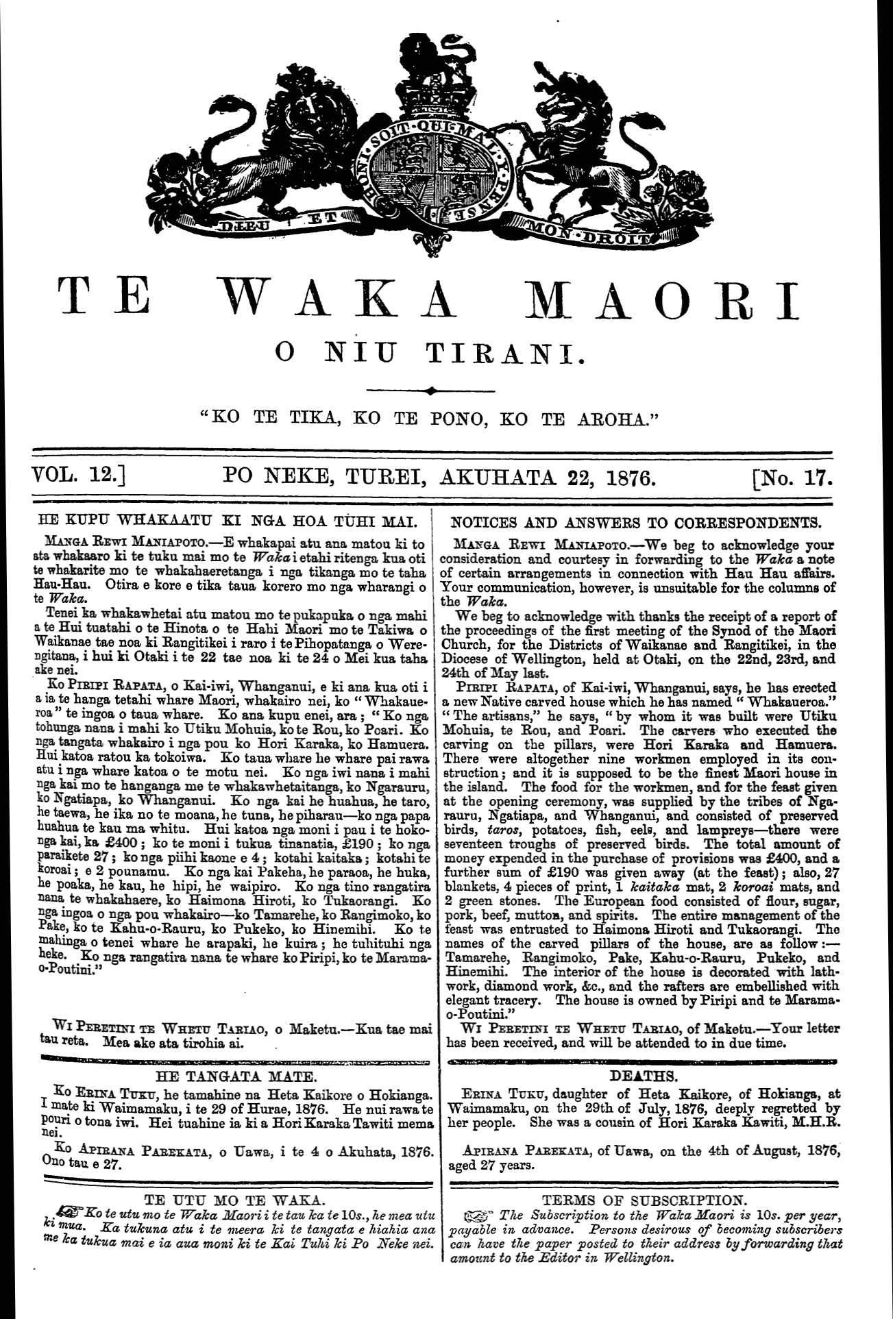 Te Waka Maori o Niu Tirani 1871-1877: Volume 12b, Number 17. 22 August 1876