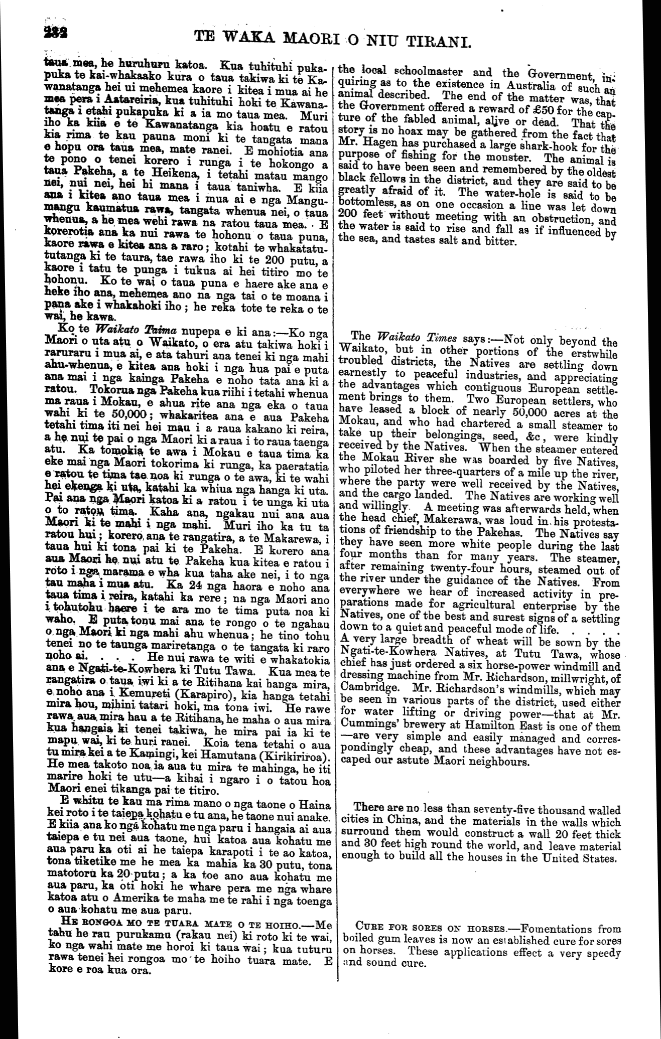TE WAKA MAORI O NIU TIRANI. taua mea, he huruhuru katoa. Kua tuhituhi puka- puka te kai-whakaako kura o taua takiwa ki te Ka- wanatanga hei ui mehemea kaore i kitea i mua ai he mea pera i Aatareiria, kua tuhituhi hoki te Kawana- tanga i etahi pukapuka ki a ia mo taua mea. Muri iho ka kiia e te Kawanatanga kia hoatu e ratou kia rima te kau pauna moni ki te tangata mana e hopu ora taua mea, mate ranei. E mohiotia ana te pono o tenei korero i runga i te hokongo a taua Pakeha, a te Heikena, i tetahi matau mango nei, nui nei, hei hi mana i taua taniwha. E kiia ana i kitea ano taua mea i mua ai e nga Mangu- mangu kaumatua rawa, tangata whenua nei, o taua whenua, a he mea wehi rawa na ratou taua mea. • E korerotia ana ka nui rawa te hohonu o taua puna, kaore rawa e kitea ana a raro; kotahi te whakatatu- tutanga ki te taura, tae rawa iho ki te 200 putu, a kaore i tatu te punga i tukua ai hei titiro mo te hohonu. Ko te wai o taua puna e haere ake ana e heke iho ana, mehemea ano na nga tai o te moana i pana ake i whakahoki iho ; he reka tote te reka o te wai, he kawa. Ko te Waikato Taima nupepa e ki ana:—Ko nga Maori o uta atu o Waikato, o era atu takiwa hoki i raruraru i mua ai, e ata tahuri ana tenei ki nga mahi ahu-whenua, e kitea ana hoki i nga hua pai e puta ana mai i nga kainga Pakeha e noho tata ana ki a ratou. Tokorua nga Pakeha kua riihi i tetahi whenua ma raua i Mokau, e ahua rite ana nga eka o taua wahi ki te 50,000; whakaritea ana e aua Pakeha tetahi tima iti nei hei mau i a raua kakano ki reira, a he. nui te pai o nga Maori ki a raua i to raua taenga atu. Ka tomokia te awa i Mokau e taua tima ka eke mai nga Maori tokorima ki runga, ka paeratatia e ratou te tima tae noa ki runga o te awa, ki te wahi hei ekenga ki uta, katahi ka whiua nga hanga ki uta. Pai ana nga Maori katoa ki a ratou i te unga ki uta o to ratou tima. Kaha ana, ngakau nui ana aua Maori ki te maihi i nga mahi. Muri iho ka tu ta ratou hui; korero, ana te rangatira, a te Makarewa, i taua hui ki tona pai ki te Pakeha. E korero ana aua Maori he, nui atu te Pakeha kua kitea e ratou i roto i nga marama e wha kua taha ake nei, i to nga tau maha i mua, atu. Ka 24 nga haora e noho ana taua tima i reira, katahi ka rere ; na nga Maori ano i tohutohu haere i te ara mo te tima puta noa ki waho, E puta tonu mai ana te rongo o te ngahau o nga Maori ki nga mahi ahu whenua; he tino tohu tenei no te taunga mariretanga o te tangata ki raro noho ai. ... He nui rawa te witi e whakatokia ana. e Ngati-te-Kowhera ki Tutu Tawa. Kua mea te rangatira o, taua iwi ki a te Ritihana kai hanga mira, e noho ana i. Kemureti (Karapiro), kia hanga tetahi mira hou, mihini tatari hoki, ma tona iwi. He rawe rawa aua, mira hau a te Ritihana, he maha o aua mira kua hangaia ki tenei takiwa, he mira pai ia ki te mapu, wai, ki te huri ranei. Koia tena tetahi o aua tu mira kei a te Kamingi, kei Hamutana (Kirikiriroa). He mea takoto noa ia aua tu mira te mahinga, he iti marire hoki te utu—a kihai i ngaro i o tatou hoa Maori enei tikanga pai te titiro. E whitu te kau ma rima mano o nga taone o Haina kei roto i te taiepa kohatu e tu ana, he taone nui anake. E kiia ana ko nga kohatu me nga paru i hangaia ai aua taiepa e tu nei aua taone, hui katoa aua kohatu me aua paru ka oti ai he taiepa karapoti i te ao katoa, tona tiketike me he mea ka mahia ka 30 putu, tona matotoru ka 20 putu; a ka toe ano aua kohatu me aua paru, ka oti hoki he whare pera me nga whare katoa atu o Amerika te maha me te rahi i nga toenga o aua kohatu me aua paru. HE RONGOA MO TE TUARA MATE O TE HOIHO.——Me tahu he rau purukamu (rakau nei) ki roto ki te wai, ko nga wahi mate me horoi ki taua wai; kua tuturu rawa tenei hei rongoa mo te hoiho tuara mate. E kore e roa kua ora. the local schoolmaster and the Government, in quiring as to the existence in Australia of such an animal described. The end of the matter was, that the Government offered a reward of £50 for the cap. ture of the fabled animal, alive or dead. That the story is no hoax may be gathered from the fact that Mr. Hagen has purchased a large shark-hook for the purpose of fishing for the monster. The animal is said to have been seen and remembered by the oldest black fellows in the district, and they are said to be greatly afraid of it. The water-hole is said to be bottomless, as on one occasion a line was let down 200 feet without meeting with an obstruction, and the water is said to rise and fall as if influenced by the sea, and tastes salt and bitter. The Waikato Times says:—Not only beyond the Waikato, but in other portions of the erstwhile troubled districts, the Natives are settling down earnestly to peaceful industries, and appreciating the advantages which contiguous European settle- ment brings to them. Two European settlers, who have leased a block of nearly 50,000 acres at the Mokau, and who had chartered a small steamer to take up their belongings, seed, &c, were kindly received by the Natives. When the steamer entered the Mokau River she was boarded by five Natives, who piloted her three-quarters of a mile up the river, where the party were well received by the Natives, and the cargo landed. The Natives are working well and willingly. A meeting was afterwards held, when the head chief, Makerawa, was loud in his protesta- tions of friendship to the Pakehas. The Natives say they have seen more white people during the last four months than for many years. The steamer, after remaining twenty-four hours, steamed out of the river under the guidance of the Natives. From everywhere we hear of increased activity in pre- parations made for agricultural enterprise by the Natives, one of the best and surest signs of a settling down to a quiet and peaceful mode of life. A very large breadth of wheat will be sown by the Ngati-te-Kowhera Natives, at Tutu Tawa, whose chief has just ordered a six horse-power windmill and dressing machine from Mr. Richardson, millwright, of Cambridge. Mr. Richardson's windmills, which may be seen 