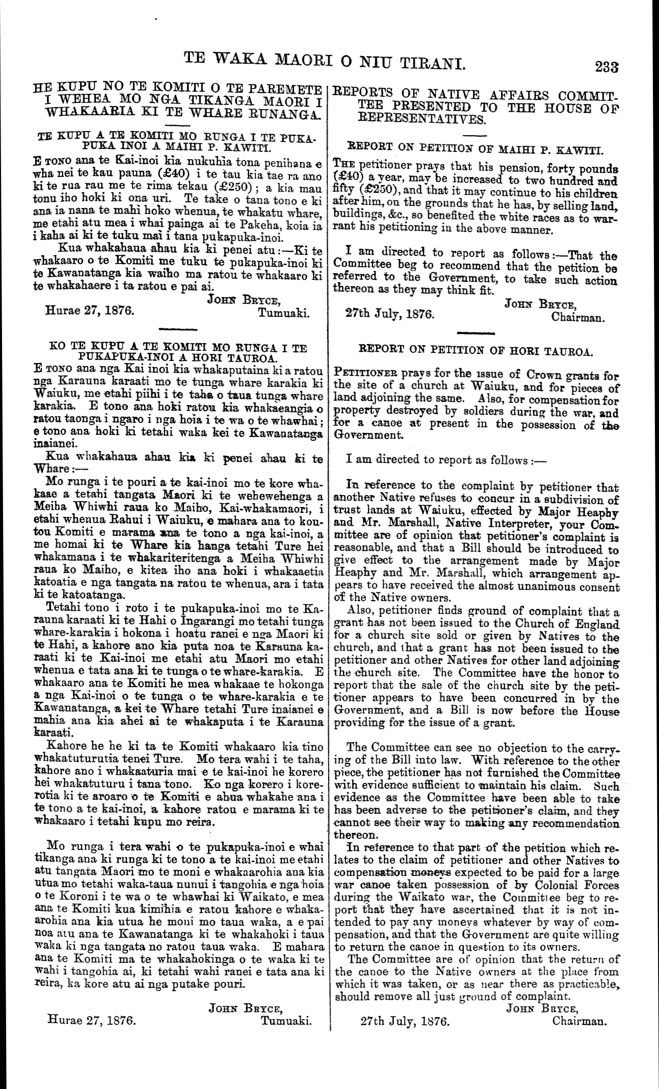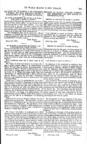 TE WAKA MAORI O NIU TIRANI. 233 HE KUPU NO TE KOMITI O TE PAREMETE I WEHEA MO NGA TIKANGA MAORI I WHAKAARIA KI TE WHARE RUNANGA TE KUPU A TE KOMITI MO RUNGA I TE PUKA- PUKA INOI A MAIHI P. KAWITI. E TONO ana te Kai-inoi kia nukuhia tona penihana e wha nei te kau pauna (£40) i te tau kia tae ra ano ti te rua rau me te rima tekau (£250) ; a kia mau tonu iho hoki ki ona uri. Te take o tana tono e ki ana ia nana te mahi hoko whenua, te whakatu whare, me etahi atu mea i whai painga ai te Pakeha, koia ia i kaha ai ki te tuku mai i tana pukapuka-inoi. Kua whakahaua ahau kia ki penei atu:—Kite whakaaro o te Komiti me tuku te pukapuka-inoi ki te Kawanatanga kia waiho ma ratou te whakaaro ki te whakahaere i ta ratou e pai ai. JOHN BRYCE, Hurae 27, 1876.Tumuaki. KO TE KUPU A TE KOMITI MO RUNGA I TE PUKAPUKA-INOI A HORI TAUROA. E TONO ana nga Kai inoi kia whakaputaina ki a ratou nga Karauna karaati mo te tunga whare karakia ki Waiuku, me etahi piihi i te taha o taua tunga whare karakia. E tono ana hoki ratou kia whakaeangia o ratou taonga i ngaro i nga hoia i te wa o te whawhai; e tono ana hoki ki tetahi waka kei te Kawanatanga inaianei. Kua whakahaua, ahau kia ki penei ahau ki te Whare:— Mo runga i te pouri a te kai-inoi mo te kore wha- kaae a tetahi tangata Maori ki te wehewehenga a Meiha Whiwhi raua ko Maiho, Kai-whakamaori, i etahi whenua Rahui i Waiuku, e mahara ana to kou- tou Komiti e marama ana te tono a nga kai-inoi, a me homai ki te Whare kia hanga tetahi Ture hei whakamana i te whakariteritenga a Meiha Whiwhi raua ko Maiho, e kitea iho ana hoki i whakaaetia katoatia e nga tangata na ratou te whenua, ara i tata ki te katoatanga. Tetahi tono i roto i te pukapuka-inoi mo te Ka- rauna karaati ki te Hahi o Ingarangi mo tetahi tunga whare-karakia i hokona i hoatu ranei e nga Maori ki te Hahi, a kahore ano kia puta noa te Karauna ka- raati ki te Kai-inoi me etahi atu Maori mo «tahi whenua e tata ana ki te tunga o te whare-karakia. E whakaaro ana te Komiti he mea whakaae te hokonga a nga Kai-inoi o te tunga o te whare-karakia e te Kawanatanga, a kei te Whare tetahi Ture inaianei e mahia ana kia ahei ai te whakaputa i te Karauna karaati. Kahore he he ki ta te Komiti whakaaro kia tino whakatuturutia tenei Ture. Mo tera wahi i te taha, kahore ano i whakaaturia mai e te kai-inoi he korero hei whakatuturu i tana tono. Ko nga korero i kore- rotia ki te aroaro o te Komiti e ahua whakahe ana i te tono a te kai-inoi, a kahore ratou e marama ki te whakaaro i tetahi kupu mo reira. Mo runga i tera wahi o te pukapuka-inoi e whai tikanga ana ki runga ki te tono a te kai-inoi me etahi atu tangata Maori mo te moni e whakaarohia aua kia utua mo tetahi waka-taua nunui i tangohia e nga hoia o te Koroni i te wa o te whawhai ki Waikato, e mea ana te Komiti kua "kimihia e ratou kahore e whaka- arohia ana kia utua he moni mo taua waka, a e pai noa atu ana te Kawanatanga ki te whakahoki i taua waka ki nga tangata no ratou taua waka. E mahara ana te Komiti ma te whakahokinga o te waka ki te wahi i tangohia ai, ki tetahi wahi ranei e tata ana ki reira, ka kore atu ai nga putake pouri. Hurae 27, 1876. JOHN BRYCE, Tumuaki. REPORTS OF NATIVE AFFAIRS COMMIT- TEE PRESENTED TO THE HOUSE OP REPRESENTATIVES. REPORT ON PETITION OF MAIHI P. KAWITI. THE petitioner prays that his pension, forty pounds (£40) a year, may be increased to two hundred and fifty (£250), and that it may continue to his children, after him, ou the grounds that he has, by selling land, buildings, &c., so benefited the white races as to war- rant his petitioning in the above manner. I am directed to report as follows:—That the Committee beg to recommend that the petition be referred to the Government, to take such action thereon as they may think fit. JOHN BRYCE, 27th July, 1876.Chairman. REPORT ON PETITION OF HORI TAUROA. PETITIONER prays for the issue of Crown grants for the site of a church at Waiuku, and for pieces of land adjoining the same. Also, for compensation for property destroyed by soldiers during the war, and for a canoe at present in the possession of the Government. I am directed to report as follows :— In reference to the complaint by petitioner that another Native refuses to concur in a subdivision of trust lands at Waiuku, effected by Major Heaphy and Mr. Marshall, Native Interpreter, your Com- mittee are of opinion that petitioner's complaint is reasonable, and that a Bill should be introduced to give effect to the arrangement made by Major Heaphy and Mr. Marshall, which arrangement ap- pears to have received the almost unanimous consent of the Native owners. Also, petitioner finds ground of complaint that a grant has not been issued to the Church of England for a church site sold or given by Natives to the church, and that a grant has not been issued to the petitioner and other Natives for other land adjoining- the church site. The Committee have the honor to report that the sale of the church site by the peti- tioner appears to have been concurred in by the Government, and a Bill is now before the House providing for the issue of a grant. The Committee can see no objection to the carry- ing of the Bill into law. With reference to the other piece, the petitioner has not furnished the Committee with evidence sufficient to maintain his claim. Such evidence -as the Committee have been able to take has been adverse to the petitioner's claim, and they cannot see their way to making any recommendation thereon. In reference to that part of the petition which re- lates to the claim of petitioner and other Natives to compensation moneys expected to be paid for a large war canoe taken possession of by Colonial Forces during the Waikato war, the Committee beg to re- port that they have ascertained that it is not in- tended to pay any moneys whatever by way of com- pensation, and that the Government are quite willing to return the canoe in question to its owners. The Committee are of opinion that the return of the canoe to the Native owne