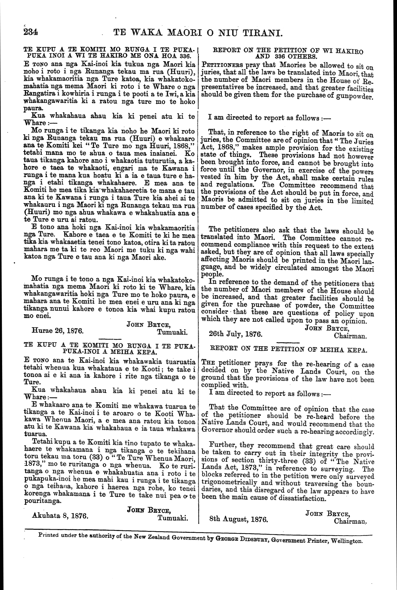 234 TE WAKA MAORI O NIU TIRANI. TE KUPU A TE KOMITI MO RUNGA I TE PUKA- PUKA INOI A WI TE HAKIRO ME ONA HOA 336. E TONO ana nga Kai-inoi kia tukua nga Maori kia noho i roto i nga Runanga tekau ma rua (Huuri), kia whakamaoritia nga Ture katoa, kia whakatoko- mahatia nga mema Maori ki roto i te Whare o nga Rangatira i kowhiria i runga i te pooti a te Iwi, a kia whakangawaritia ki a ratou nga ture mo te hoko paura. Kua whakahaua ahau kia ki penei atu ki te Whare:— Mo runga i te tikanga kia noho he Maori ki roto ki nga Runanga tekau ma rua (Huuri) e whakaaro ana te Komiti kei "Te Ture mo nga Huuri, 1868," tetahi mana mo te ahua o taua mea inaianei. Ko taua tikanga kahore ano i whakaotia tuturutia, a ka- hore e taea te whakaoti, engari ma te Kawana i runga i te mana kua hoatu ki a ia e taua ture e ha- nga i etahi tikanga whakahaere. E mea ana te Komiti he mea tika kia whakahaeretia te mana e tau ana ki te Kawana i runga i taua Ture kia ahei ai te whakauru i nga Maori ki nga Runanga tekau ma rua (Huuri) mo nga ahua whakawa e whakahuatia ana e te Ture e uru ai ratou. E tono ana hoki nga Kai-inoi kia whakamaoritia nga Ture. Kahore e taea e te Komiti te ki he mea tika kia whakaaetia tenei tono katoa, otira ki ta ratou mahara me ta ki te reo Maori me tuku ki nga wahi katoa nga Ture e tau ana ki nga Maori ake. Mo runga i te tono a nga Kai-inoi kia whakatoko- mahatia nga mema Maori ki roto ki te Whare, kia whakangawaritia hoki nga Ture mo te hoko paura, e mahara ana te Komiti he mea enei e uru ana ki nga tikanga nunui kahore e tonoa kia whai kupu ratou mo enei. JOHN BRYCE, Hurae 26,1876.Tumuaki. TE KUPU A TE KOMITI MO RUNGA I TE PUKA- PUKA-INOI A MEIHA KEPA. E TONO ana te Kai-inoi kia whakawakia tuaruatia tetahi whenua kua whakataua e te Kooti; te take i tonoa ai e ki ana ia kahore i rite nga tikanga o te Ture. Kua whakahaua ahau kia ki penei atu ki te Whare:— E whakaaro ana te Komiti me whakawa tuarua te tikanga a te Kai-inoi i te aroaro o te Kooti Wha- kawa Whenua Maori, a e mea ana ratou kia tonoa atu ki te Kawana kia whakahaua e ia taua whakawa tuarua. Tetahi kupu a te Komiti kia tino tupato te whaka- haere te whakamana i nga tikanga o te tekihana toru tekau ma toru (33) o " Te Ture Whenua Maori, 1873," mo te ruritanga o nga whenua. Ko te ruri- tanga o nga whenua e whakahuatia ana i roto i te pukapuka-inoi he mea mahi kau i runga i te tikanga o nga teihana, kahore i haerea nga rohe, ko tenei korenga whakamana i te Ture te take nui pea o te pouritanga. JOHN BRYCE, Akuhata 8, 1876.Tumuaki. REPORT ON THE PETITION OF WI HAKIRO AND 336 OTHERS. PETITIONERS pray that Maories be allowed to sit on juries, that all the laws be translated into Maori, that the number of Maori members in the House of Re- presentatives be increased, and that greater facilities should be given them for the purchase of gunpowder. I am directed to report as follows :— That, in reference to the right of Maoris to sit on juries, the Committee are of opinion that" The Juries Act, 1868," makes ample provision for the existing state of things. These provisions had not however been brought into force, and cannot be brought into force until the Governor, in exercise of the powers vested in him by the Act, shall make certain rules and regulations. The Committee recommend that the provisions of the Act should be put in force, and Maoris be admitted to sit on juries in the limited number of cases specified by the Act. The petitioners also ask that the laws should be translated into Maori. The Committee cannot re- commend compliance with this request to the extent asked, but they are of opinion that all laws specially affecting Maoris should be printed in the Maori lan- guage, and be widely circulated amongst the Maori people. In reference to the demand of the petitioners that the number of Maori members of the House should be increased, and that greater facilities should he given for the purchase of powder, the Committee consider that these are questions of policy upon which they are not called upon to pass an opinion. JOHN BRYCE, 26th July, 1876.Chairman. REPORT ON THE PETITION OF MEIHA KEPA. THE petitioner prays for the re-hearing of a case decided on by the Native Lands Court, on the ground that the provisions of the law have not been complied with. I am directed to report as follows:— That the Committee are of opinion that the case of the petitioner should be re-heard before the Native Lands Court, and would recommend that the Governor should order such a re-hearing accordingly. Further, they recommend that great care should be taken to carry out in their integrity the provi- sions of section thirty-three (33) of " The Native Lands Act, 1873," in reference to surveying. The blocks referred to in the petition were only surveyed trigonometrically and without traversing the boun- daries, and this disregard of the law appears to have been the main cause of dissatisfaction. 8th August, 1876. JOHN BRYCE, Chairman, Printed under the authority of the New Zealand Government by GEORGE DIDSBURY, Government Printer, Wellington.