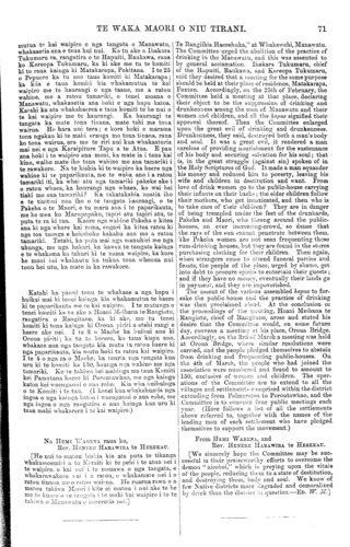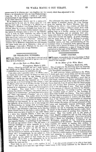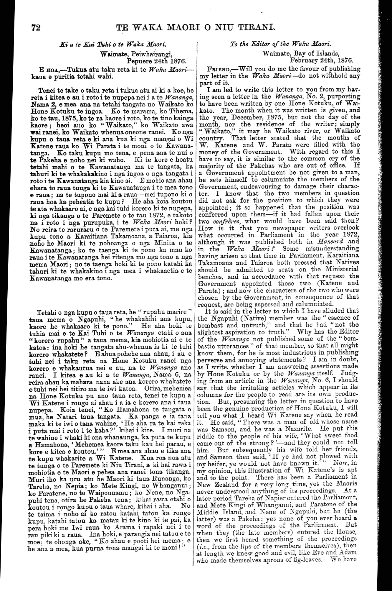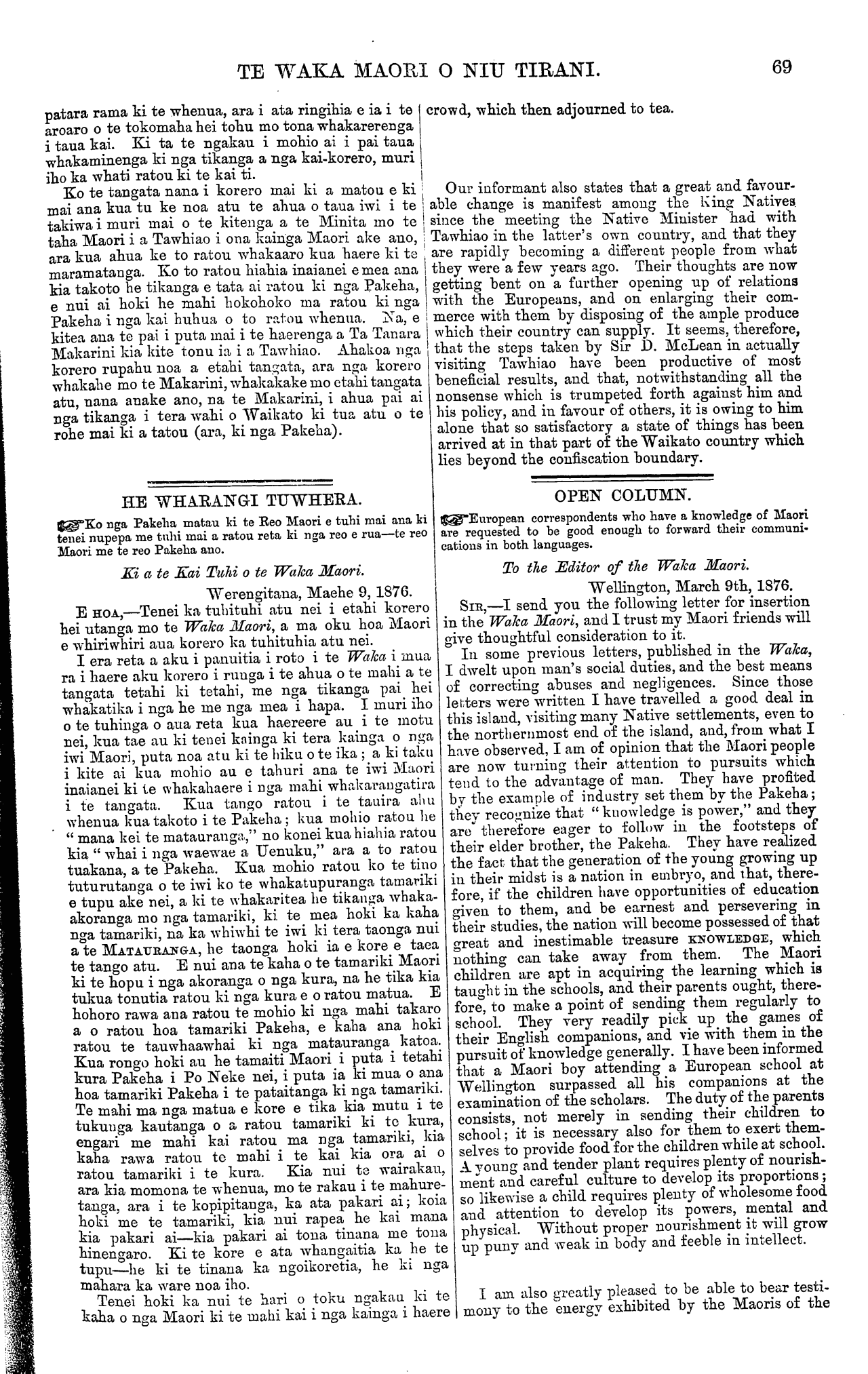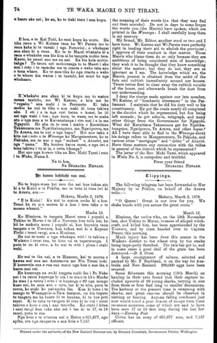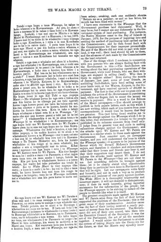 TE WAKA MAORI O NIU TIRANI. 73 Tetahi o nga kupu o taua Wananga, he tahae te hoko whenua a te Kawanatanga. Ae pea, ko ahau e kore e marama ki te tahae o taua hoko a te Kawana- tanga. Inahoki, i tae mai ano te Minita o te taha Maori ki Pewhairangi nei i a Hanuere, i te tau 1875. I haere mai ki te titiro ki te whakarite i taua tikanga hoko a nga Komihana, a i riria e ia aua Komihana mo te he o ta ratou mahi. I puta tana kupu ki te kore nga Maori e pai kia hokoa o ratou whenua, e pai ana, me waiho ki a ratou a ratou whenua, ko nga moni a te Kawanatanga me whakahoki, ara nga moni i tukua e aua Komihana hei taunaha mo nga whenua. Tetahi o nga mea e whakahe nei ahau ki a koutou, e nga kai-whakahe i te Kawanatanga, ara, e mahi ana nga kai-whakahe ki te panui i te hoko whenua a te Kawanatanga, e hoko ana o koutou hoa titiro i a koutou panui. Kei hea ra he kai-whakamana mo a a etahi? I tenei Hanuere kei te hoko ano enei hoa o koutou, e nga kai-panui whakahe, i enei o a koutou whenua i te Wairoa, Kaipara, ki te Kawanatanga, neke ake i te £6,000 nga moni i riro. Ko to tatou ahua e penei ana, ko te whakahe ki te hoko a te Kawanatanga kei te arero kau, ko nga ringaringa e hiahia noa ana ki te kauta i nga moni mo tona whenua. He kupu tenei ki nga Kai Tuhi o nga nupepa Maori:—Me whakaae korua ko nga reta e tukua atu ana kia korua ko te tikanga pai me tuhi ngatahi korua i nga korero penei me taku ka tukua atu nei, kia rua nupepa e puta ai te korero, katahi ka mo- hiotia he korero tika tera. Koia te take o tetahi kupu whakapae o tenei reta ki a te Wananga, " E! nana ake ano ana korero panui e tuhi nei ki te iwi katoa!" I whakaarohia e au ki te ahua tonu o te Wananga ki te whakakino i te Kawanatanga; me nga kupu hoki mo Wi Katene raua ko Wi Parata e haere pera tonu ana me nga kupu mo te tino Kawa- natanga. Whakaaroa iho hoki e koutou, e nga kai- titiro nupepa, a ka mohio koutou ki te ahua o te whakahaere korero a te Wananga—me te mea nei ano e hae ana ki te whakaihi kua riro nei i te Kawana- tanga o Ta Tanara Makarini ma, koia ka korero whakakino ai kia rongo ai ta.raua whakaihi, kia mahue e era e taupuhipuhi mai ra ratou. Kiha rawa i marama i au nga kupu i roto i te Wananga mo Wi Katene raua ko Wi Parata. Kia tino hangai te mea he i mahia e raua i te Paremete, a whai ingoa rawa taua mea na raua anake i hanga, katahi ka tika. Kia pai koia te whakahaere korero o a tatou nupepa, kei waiho hei take puhaehae ma totahi ki tetahi. Ko te Waka Maori te tino nupepa tika rawa ; e kore ia e mahi i te he ; ka nui te tika o tana mahi, he kawe korero kau mai tana kia rongo te taringa o te tangata ; tena ko te Wananga mehemea nei e whakahau mai ana kia pera katoa te motu nei me ia. Ko nga kupu nui mo Wi Katene mo Wi Parata e ahua mai ana i to raua rerenga ki te turaki i nga Porowini, no reira rawa te nuinga o nga whakahe mo raua. Tetahi putake, mo te moni, a te Runanga i whakaritea ma raua mo te tau. E hara nei hoki i te Kawanatanga i pokanoa te whakanoho i a raua i roto i te Runanga whiriwhiri a te Kawana, na te Paremete, tonu, na te tokomaha o nga mema. Ko taku kupu mo tena, rae whakamutu e te Paremete te tango i te Maori ki tera nohoanga, kia wawe te mohiotia e te Maori ana kupu. Kei wareware koia pea koutou ki a koutou kupu, e mau nei i te Wananga, mo nga ra been asleep ; awaking, each one suddenly shouts, ' Return me as a member ; so and so has fallen, his mouth has been filled with money!" I have seen statements in the Wananga that the Government purchase land dishonestly. Well, it may be so, but I cannot see any dishonesty in the Go- vernment system of land purchasing. For instance, the Native Minister came to the Bay of Islands in January, 1875, for the purpose of inquiring into and settling the method of purchasing land carried on by the Commissioners; and he then found fault with the Commissioners for their improper proceedings. He said if the Maoris did not wish to part with their land, it was well; their land should be left to them, and the advances of cash made by the Commissioners on the land returned. One of the things which I condemn in connection with you persons who are always finding fault with the Government is this:—The fault-finders are writing about the land purchasing operations of the Government, while their friends, who see their writ- ings, are engaged in selling (land). Who then is there to support either? Even during the month of January, just past, some of your friends, ye scribbling fault-finders, have been selling some of your lands here, at the Wairoa, Kaipara, to the Go- vernment, and have received upwards of £6,000 in payment. The fact is that with our tongues only we condemn the action of the Government in purchasing land, while our fingers itch to count the money we receive in payment. This is a word to the Editors of the Maori newspapers:—You should arrange to publish in both papers letters, such as this which I am now writing, which each of you receive from your correspondents; it would then be known that they are genuine. This (not being done) enables me to make the charge against the Wananga which I do in this letter, that statements (i.e. letters) to the people published in its columns emanate from itself only. I judge from, its general tone and style in making calumnious charges against the Government; and the attacks upon Wi Katene and Wi Parata are written in a similar strain to those made against the Government. Just consider now, ye newspaper readers, and you will understand the tone in which, the Wananga speaks—it appears to be jealous of the favour which Sir Donald McLean's Government enjoys, and therefore it slanders and calumniates in order that their lovers and friends may hear it, and that their supporters may desert them. I do not indorse the attacks made against Wi Katene and Wi Parata in the Wananga—they are not clear to me. Let something definite be brought against them; let it be clearly stated what objectionable thing they in particular have done i