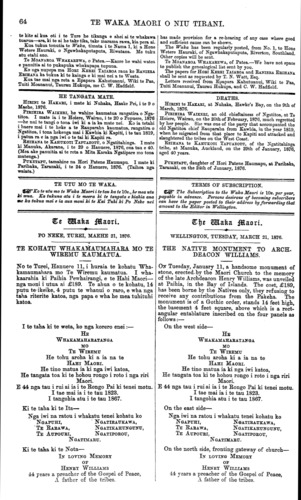 TE WAKA MAORI O NIU TIRANI. te kite ai kua oti i te Ture he tikanga e ahei ai te whakawa tuarua—ara, ki te ai he take tika, take marama rawa, kia pera ai. Kua tukua tonutia te Waka, timata i te Nama 1, ki a Hone Wetere Hauraki, o Ngawhakaputaputa, Riwatana. Me tuku atu etahi ano. Te MOANAROA WHAKAREWA, o Patea.—Kaore he wahi watea e panuitia ai to pukapuka whakapapa tupuna. Ko nga nupepa ma HORI KEREI TAIAROA raua ko RANIERA. ERIHANA ka tukua ki te kainga e ki mai nei a te Waata. Kua tae mai nga reta a Epapara Kahutuanui, Wiki te Paa, Tuiti Moananui, Taurau Hukupa, me C. W. Hadfield. HE TANGATA MATE. HIRINI te HAKARI, i mate ki Nuhaka, Haake Pei, i te 9 o Maehe, 1876. PIRIHIRA WAIKERI, he wahine kaumatua rangatira o Nga- titoa. I mate ia i te Hoiere, Wairau, i te 20 o Pepuere, 1876 —he nui te tangi o tona iwi ki a ia ka mate nei. Ko ia tetahi i haere mai i te heke a te Rauparaha kaumatua, rangatira o Ngatitoa, i tona hekenga mai i Kawhia ki Kapiti, i te tau 1819, i patua ra e ia nga iwi o te tai ki Kapiti ra. REIHANA te KAHUKOTI TAPUAEOTU, o Ngatitahinga. I mate ki Manuka, Akarana, i te 29 o Hanuere, 1876, ona tau e 40. (Mea ake panuitia ai te reta a Mita Karaka Ngatipare mo tona matenga.) PUKETAPU, tamahine na Hori Patene Haumapu. I mate ki Parihaka, Taranaki, i te 24 o Hanuere, 1876. (Taihoa nga waiata.) TE UTU MO TE WAKA. Ko te utu mo te Waka Maori i te tau ka te 10s., he mea utu ki mua. Ka tukuna atu i te meera ki te tangata e hiahia ana me ka tukua mai e ia aua moni ki te Kai Tuhi ki Po Neke nei Te Waka Maori. PO NEKE, TUREI, MAEHE 21, 1876. TE KOHATU WHAKAMAUMAHARA MO TE WIREMU KAUMATUA. No te Turei, Hanuere 11, i huraia te kohatu Wha- kamaumahara mo Te Wiremu kaumatua. I wha- kaarahia ki Paihia Pewhairangi, e te Hahi Maori— nga moni i utua ai £189. Te ahua o te kohatu, 14 putu te ikeike, 4 putu te whanui o raro, e wha nga taha riterite katoa, nga papa e wha he mea tuhituhi katoa. I te taha ki te weta, ko nga korero enei:— HE WHAKAMAHARATANGA. MO TE WlREMU He tohu aroha ki a ia na te HAHI MAORI. He tino matua ia ki nga iwi katoa, He tangata toa ki te hohou rongo i roto i nga riri Maori. E 44 nga tau i rui ai ia i te Rongo Pai ki tenei motu. I tae mai ia i te tau 1823. I tangohia atu i te tau 1867. Ki te taha ki te Ita— Nga iwi na ratou i whakatu tenei kohatu ko NGAPUHI,NGATIRAUKAWA, TE RARAWA, NGATIKAHUNGUNU, TE AUPOURI, NGATIPOROU, NGATIMARU. Ki te taha ki te Nota— IN LOVING MEMORY OF HENRY WILLIAMS 44 years a preacher of the Gospel of Peace, A father of the tribes. has made provision for a re-hearing of any case where good and sufficient cause can be shown. The Waka has been regularly posted, from No. 1, to Hone Wetere Hauraki, of Ngawhakaputaputa, Riverton, Southland. Other copies will be sent. Te MOANAROA WHAKAREWA, of Patea.—We have not space to publish the genealogical list sent by you. The papers for HORI KEREI TAIAROA and RANIERA ERIHANA shall be sent as requested by T. N. Watt, Esq. Letters received from Epapara Kahutuanui, Wiki te Paa, Tuiti Moananui, Taurau Hukupa, and C. W. Hadfield. DEATHS. HIRINI te HAKARI, at Nuhaka, Hawke's Bay, on the 9th of March, 1876. PIRIHIRA WAIKERI, an old chieftainess of Ngatitoa, at Te Hoiere, Wairau, on the 20th of February, 1876, much regretted by her people. She was one of the. party that accompanied the old Ngatitoa chief Rauparaha from Kawhia, in the year 1819, when he migrated from that place to Kapiti and attacked and slaughtered the tribes on the West Coast. REIHANA te KAHUKOTI TAPUAEOTU, of the Ngatitahinga tribe, at Manuka, Auckland, on the 29th of January, 1876, aged 40 years. PUKETAPU, daughter of Hori Patene Haumapu, at Parihaka, Taranaki, on the 24th of January, 1876. TERMS OF SUBSCRIPTION. The Subscription to the Waka Maori is 10s. per year, payable in advance. Persons desirous of becoming subscribers can have the paper posted to their address by forwarding that amount to the Editor in Wellington. The Waka Maori. WELLINGTON, TUESDAY, MARCH 21, 1876. THE NATIVE MONUMENT TO ARCH- DEACON WILLIAMS. ON Tuesday, January 11, a handsome monument of stone, erected.by the Maori Church to the memory of the late Archdeacon Henry Williams, was unveiled at Paihia, in the Bay of Islands. The cost, £189, has been borne by the Natives only, they refusing to receive any contributions from the Pakeha. The monument is of a Gothic order, stands 14 feet high, the basement 4 feet square, above which is a rect- angular entablature inscribed on the four panels as follows:— On the west side— HE WHAKAMAHARATANGA MO TE WIREMU He tohu aroha ki a ia na te HAHI MAOEI. He tino matua ia ki nga iwi katoa, He tangata toa ki te hohou rongo i roto i nga riri Maori. E 44 nga tau i rui ai ia i te Rongo Pai ki tenei motu. I tae mai ia i te tau 1823. I tangohia atu i te tau 1867. On the east side— Nga iwi na ratou i whakatu tenei kohatu ko NGAPUHI,NGATIRAUKAWA, TE RARAWA, NGATIKAHUNGUNU, TE AUPOURI, NGATIPOROU, NGATIMARU. On the north side, fronting gateway of church— IN LOVING MEMORY OP HENRY WILLIAMS 44 years a preacher of the Gospel of Peace, A. father of the tribes.