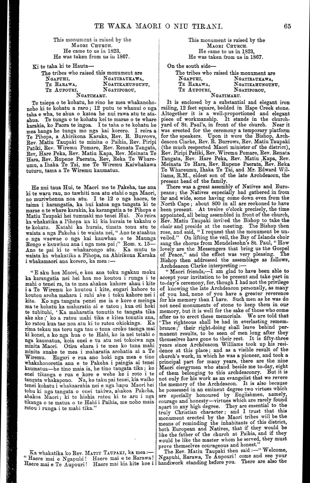 TE WAKA MAORI O NIU TIRANI. This monument is raised by the MAORI CHURCH. He came to us in 1823, He was taken from us ia 1867. Ki te taha ki te Hauta— The tribes who raised this monument are NGAPUHI,NGATIRAUKAWA, TE RARAWA, NGATIKAHUNGUNU, TE AUPOURI, NGATIPOROU, NGATIMARU. Te taiepa o te kohatu, he rino he mea whakanoho- noho ki te kohatu a raro ; 12 putu te whanui o nga taha e wha, te ahua o katoa he nui rawa atu te ata- ahua. Te tunga o te kohatu kei te marae o te whare karakia, ko Paora te ingoa. I te taha o te kohatu he mea hanga he tunga mo nga kai korero. I reira a Te Pihopa, a Ahirikona Karaka, Rev. R. Burrows, Rev. Matiu Taupaki te minita o Paihia, Rev. Piripi Patiki, Rev. Wiremu Pomare, Rev. Renata Tangata, Rev, Hare Peka, Rev. Matiu Kapa, Rev. Meinata Te Hara, Rev. Rupene Paerata, Rev, Reka Te Whare- umu, a Ihaka Te Tai, me Te Wiremu Kaiwhakawa tuturu, tama a Te Wiremu kaumatua. He nui taua Hui, te Maori me te Pakeha, tae ana ki te waru rau, no tawhiti noa atu etahi o nga Maori, no muriwhenua noa atu. I te 12 o nga haora, te taima i karangatia, ka hui katoa nga tangata ki te marae o te whare karakia, ka karangatia a te Pihopa e Matiu Taupaki hei tumuaki mo tenei Hui. No reira ka whakatika a Pihopa ka ki kia huraia te kakahu o te kohatu. Katahi ka huraia, timata tonu atu te waiata a nga Pakeha i te waiata nei, " Ano te ataahua o nga waewae o nga kai kauwhau o te Maunga Rongo e kauwhau ana i nga mea pai;" Rom. x. 15— Ano te pai ki te whakarongo atu. Ka mutu te waiata ka whakatika a Pihopa, na Ahirikona Karaka i whakamaori aua korero, ka mea:— " E aku hoa Maori, e koa ana toku ngakau moku ka karangatia nei hei hoa mo koutou i runga i te mahi o tenei ra, ta te mea ahakoa kahore ahau i kite i a Te Wiremu ko koutou i kite, engari kahore to koutou aroha mahara i rahi ake i toku kahore nei i kite. Ko nga tangata penei me ia e kore e meinga ma te kohatu ka maharatia ai e tatou ; kua oti hoki te tuhituhi, ' Ka maharatia tonutia te tangata tika ake ake ;' ko a ratou mahi tika e kitea tonutia ana, ko ratou kua tae noa atu ki to ratou okiokinga. Ka rima tekau ma toru nga tau o tona oroko taenga mai ki konei, a ko nga hua o te Hahi, ko ia nei tetahi o nga kaumatua, koia enei e tu atu nei tokoiwa nga minita Maori. Otira ehara i te mea ko tana mahi minita anake te mea i maharatia arohatia ai a Te Wiremu. Engari e rua ano hoki nga mea e tino whakahonoretia ana e te Pakeha i paingia ai tenei kaumatua—he tino maia ia, he tino tangata tika; ko enei tikanga e rua e kore e wehe ke i roto i te tangata whakapono. Na, ko taku pai tenei, kia waiho tenei kohatu i whakaarahia nei e nga hapu Maori hei tohu ki nga tangata o enei takiwa, ahakoa Pakeha, ahakoa Maori; ki te hiahia ratou ki te aru i nga tikanga o te matua o te Hahi i Paihia, me noho maia ratou i runga i te mahi tika." Ka whakatika ko Rev. MATIU TAUPAKI, ka mea:— " Haere mai e Ngapuhi! Haere mai e te Rarawa! Haere mai e Te Aupouri! Haere mai kia kite koe i This monument is raised by the MAORI CHURCH. He came to us in 1823, He was taken from us in 1867. On the south side— The tribes who raised this monument are NGAPUHI,NGATIRAUKAWA, TE RARAWA, NGATIKAHUNGUNU, TE AUPOURI, NGATIPOROU, NGATIMARU. It is enclosed by a substantial and elegant iron railing, 12 feet square, bedded in Hape Creek stone. Altogether it is a well-proportioned and elegant piece of workmanship. It stands in the church- yard of St. Paul's, in front of the church. Near it was erected for the ceremony a temporary platform for the speakers. Upon it were the Bishop, Arch- deacon Clarke, Rev. R. Burrows, Rev. Matiu Taupaki (the much respected Maori minister of the district), Rev. Piripi Patiki, Rev. Wiremu Pomare, Rev. Renata Tangata, Rev. Hare Peka, Rev. Matiu .Kapa, Rev. Meinata Te Hara, Rev. Rupene Paerata, Rev. Reka Te Whareumu, Ihaka Te Tai, and Mr. Edward Wil- liams, R.M., eldest son of the late Archdeacon, the present head of the family. There was a great assembly of Natives and Euro- peans ; the Natives especially had gathered in from far and wide, some having come down even from the North Cape; about 800 in all are reckoned to have been present. At twelve o'clock precisely, the time appointed, all being assembled in front of the church, Rev. Matiu Taupaki invited the Bishop to take the chair and preside at the meeting. The Bishop then rose, and said, " I request that the monument be un- veiled." On lifting the veil, the Bay of Islands choir sang the chorus from Mendelssohn's St. Paul, " How lovely are the Messengers that bring us the Gospel of Peace," and the effect was very pleasing. The Bishop then addressed the assemblage as follows, Archdeacon Clarke interpreting:— " Maori friends,—I am glad to have been able to accept your invitation to be present and take part in to-day's ceremony, for, though I had not the privilege of knowing the late Archdeacon personally, as many of you had, none of you have a greater reverence for his memory than I have. Such men as he was do not need monuments of stone to keep them in our memory, but it is well for the sake of those who come after us to erect these memorials. We are told that ' The righteous shall be had in everlasting remem- brance;' their right-doing shall leave behind per- manent results, to be seen of men long after they themselves have gone to their rest. It is fifty-three years since Archdeacon Williams took up his resi- dence at this place; and as a visible result of the church's work, in which he was a pioneer, and took a principal part for many years, there are the nine Maori clergymen who stand beside me to-day, eight of them belonging to this archdeaconry. But it is not only for his work as an evangelist that we revere the memory of the Archdeacon. It is also because he possessed in an eminent degree two virtues which are specially honoured by Englishmen, namely, courage and honesty—virtues which are rarely found apart in any high degree. They are essential to the truly Christian character; and I trus