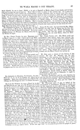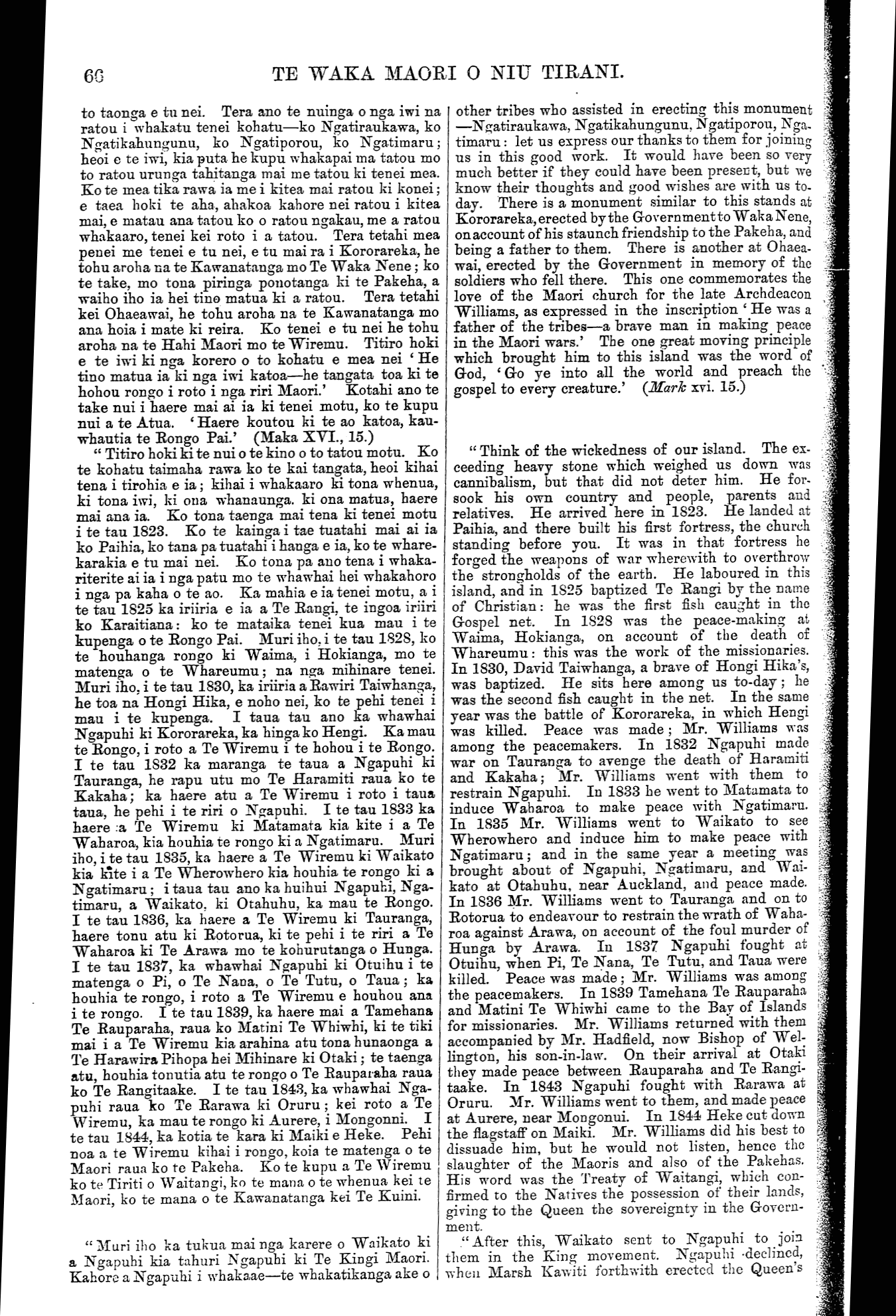 TE WAKA MAORI O NIU TIRANI. to taonga e tu nei. Tera ano te nuinga o nga iwi na ratou i whakatu tenei kohatu—ko Ngatiraukawa, ko Ngatikahungunu, ko Ngatiporou, ko Ngatimaru; heoi e te iwi, kia puta he kupu whakapai ma tatou mo to ratou urunga tahitanga mai me tatou ki tenei mea. Ko te mea tika rawa ia me i kitea mai ratou ki konei; e taea hoki te aha, ahakoa kahore nei ratou i kitea mai, e matau ana tatou ko o ratou ngakau, me a ratou whakaaro, tenei kei roto i a tatou. Tera tetahi mea penei me tenei e tu nei, e tu mai ra i Kororareka, he tohu aroha na te Kawanatanga mo Te Waka Nene; ko te take, mo tona piringa ponotanga ki te Pakeha, a waiho iho ia hei tino matua ki a ratou. Tera tetahi kei Ohaeawai, he tohu aroha na te Kawanatanga mo ana hoia i mate ki reira. Ko tenei e tu nei he tohu aroha na te Hahi Maori mo te Wiremu. Titiro hoki e te iwi ki nga korero o to kohatu e mea nei ' He tino matua ia ki nga iwi katoa—he tangata toa ki te hohou rongo i roto i nga riri Maori.' Kotahi ano te take nui i haere mai ai ia ki tenei motu, ko te kupu nui a te Atua. ' Haere koutou ki te ao katoa, kau- whautia te Rongo Pai.' (Maka XVI., 15.) " Titiro hoki ki te nui o te kino o to tatou motu. Ko te kohatu taimaha rawa ko te kai tangata, heoi kihai tena i tirohia e ia; kihai i whakaaro ki tona whenua, ki tona iwi, ki ona whanaunga, ki ona matua, haere mai ana ia. Ko tona taenga mai tena ki tenei motu i te tau 1823. Ko te kainga i tae tuatahi mai ai ia ko Paihia, ko tana pa tuatahi i hanga e ia, ko te whare- karakia e tu mai nei. Ko tona pa ano tena i whaka- riterite ai ia i nga patu mo te whawhai hei whakahoro i nga pa kaha o te ao. Ka mahia e ia tenei motu, a i te tau 1825 ka iriiria e ia a Te Rangi, te ingoa iriiri ko Karaitiana: ko te mataika tenei kua mau i te kupenga o te Rongo Pai. Muri iho. i te tau 1828, ko te houhanga rongo ki Waima, i Hokianga, mo te matenga o te Whareumu; na nga mihinare tenei. Muri iho. i te tau 1830, ka iriiria a Rawiri Taiwhanga, he toa na Hongi Hika, e noho nei, ko te pehi tenei i mau i te kupenga. I taua tau ano ka whawhai Ngapuhi ki Kororareka, ka hinga ko Hengi. Ka mau te Rongo, i roto a Te Wiremu i te hohou i te Rongo. I te tau 1832 ka maranga te taua a Ngapuhi ki Tauranga, he rapu utu mo Te Haramiti raua ko te Kakaha; ka haere atu a Te Wiremu i roto i taua taua, he pehi i te riri o Ngapuhi. I te tau 1833 ka haere a Te Wiremu ki Matamata kia kite i a Te Waharoa, kia houhia te rongo ki a Ngatimaru. Muri iho, i te tau 1835, ka haere a Te Wiremu ki Waikato kia kite i a Te Wherowhero kia houhia te rongo ki a Ngatimaru; i taua tau ano ka huihui Ngapuhi, Nga- timaru, a Waikato, ki Otahuhu, ka mau te Rongo. I te tau 1836, ka haere a Te Wiremu ki Tauranga, haere tonu atu ki Rotorua, ki te pehi i te riri a Te Waharoa ki Te Arawa mo te kohurutanga o Hunga. I te tau 1837, ka whawhai Ngapuhi ki Otuihu i te matenga o Pi, o Te Nana, o Te Tutu, o Taua ; ka houhia te rongo, i roto a Te Wiremu e houhou ana i te rongo. I te tau 1839, ka haere mai a Tamehana Te Rauparaha, raua ko Matini Te Whiwhi, ki te tiki mai i a Te Wiremu kia arahina atu tona hunaonga a Te Harawira Pihopa hei Mihinare ki Otaki; te taenga atu, houhia tonutia atu te rongo o Te Rauparaha raua ko Te Rangitaake. I te tau 1843, ka whawhai Nga- puhi raua ko Te Rarawa ki Oruru; kei roto a Te Wiremu, ka mau te rongo ki Aurere, i Mongonui. I te tau 1844, ka kotia te kara ki Maiki e Heke. Pehi noa a te Wiremu kihai i rongo, koia te matenga o te Maori raua ko te Pakeha. Ko te kupu a Te Wiremu ko te Tiriti o Waitangi, ko te mana o te whenua kei te Maori, ko te mana o te Kawanatanga kei Te Kuini. " Muri iho ka tukua mai nga karere o Waikato ki a Ngapuhi kia tahuri Ngapuhi ki Te Kingi Maori. Kahore a Ngapuhi i whakaae—te whakatikanga ake o other tribes who assisted in erecting this monument —Ngatiraukawa, Ngatikahungunu, Ngatiporou, Nga. timaru: let us express our thanks to them for joining us in this good work. It would have been so very much better if they could have been present, but we know their thoughts and good wishes are with us to- day. There is a monument similar to this stands at Kororareka, erected by the Government to Waka Nene, on account of his staunch friendship to the Pakeha, and being a father to them. There is another at Ohaea- wai, erected by the Government in memory of the soldiers who fell there. This one commemorates the love of the Maori church for the late Archdeacon Williams, as expressed in the inscription ' He was a father of the tribes—a brave man in making peace in the Maori wars.' The one great moving principle which brought him to this island was the word of God, ' Go ye into all the world and preach the gospel to every creature.' (Mark xvi. 15.) " Think of the wickedness of our island. The ex- ceeding heavy stone which weighed us down was cannibalism, but that did not deter him. He for- sook his own country and people, parents and relatives. He arrived here in 1823. He landed at Paihia, and there built his first fortress, the church standing before you. It was in that fortress he forged the weapons of war wherewith to overthrow the strongholds of the earth. He laboured in this island, and in 1825 baptized Te Rangi by the name of Christian: he was the first fish caught in the Gospel net. In 1828 was the peace-making at Waima, Hokianga, on account of the death of Whareumu: this was the work of the missionaries. In 1830, David Taiwhanga, a brave of Hongi Hika's, was baptized. He sits here among us to-day ; he was the second fish caught in the net. In the same year was the battle of Kororareka, in which Hengi was killed. Peace was made ; Mr. Williams was among the peacemakers. In 1832 Ngapuhi made war on Tauranga to avenge the death of Haramiti and Kakaha; Mr. Williams went with them to restrain Ngapuhi. In 1833 he went to Matamata to induce Waharoa to make peace with Ngatimaru. In 1835 Mr. Williams went to Waikato to see Wherowhero and induce him to make peace with Ngatimaru; and in the same 
