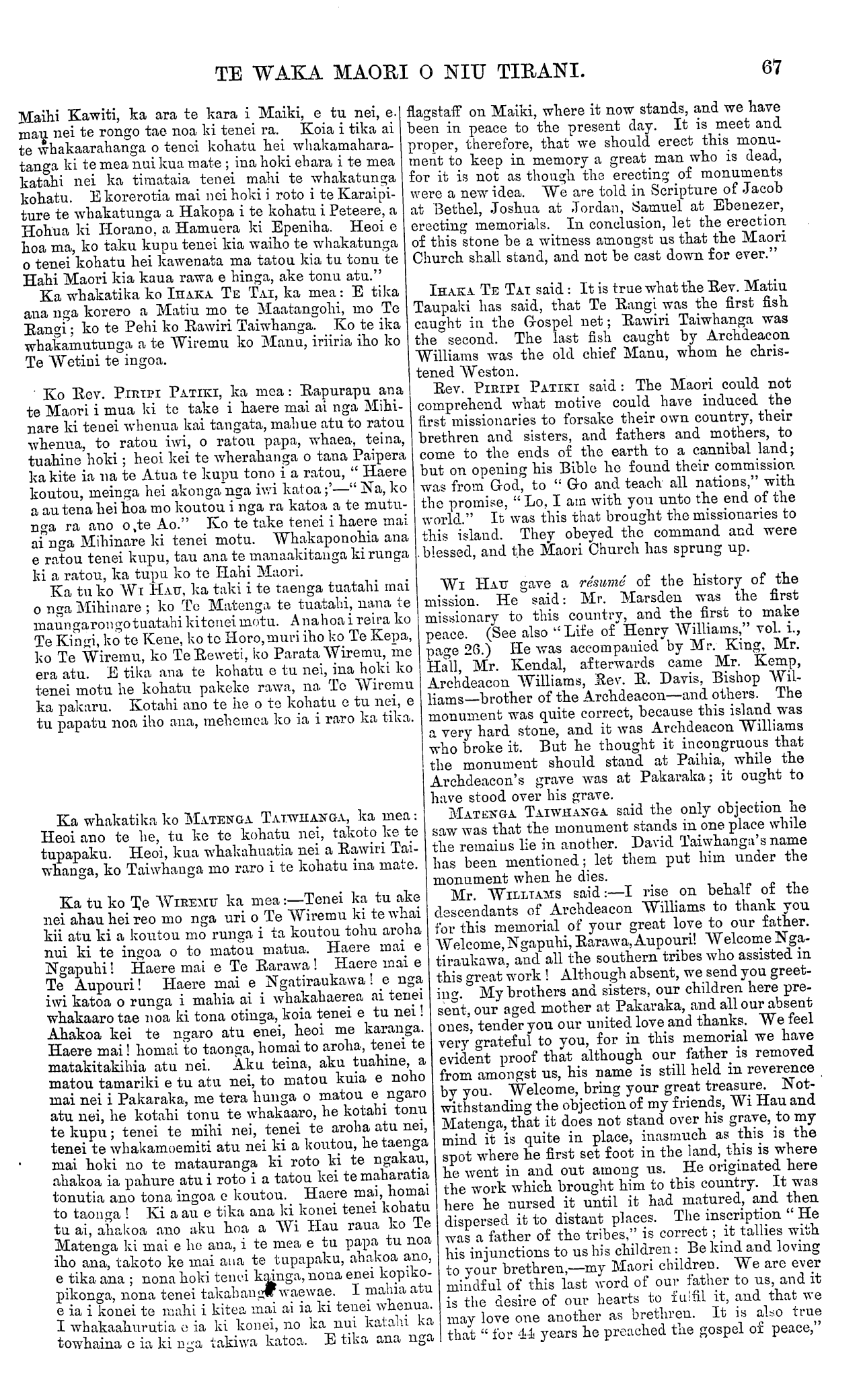 TE WAKA MAORI O NIU TIRANI. Maihi Kawiti, ka ara te kara i Maiki, e tu nei, e. mau nei te rongo tae noa ki tenei ra. Koia i tika ai te whakaarahanga o tenei kohatu hei whakamahara- tanga ki te mea nui kua mate ; ma hoki ehara i te mea katahi nei ka timataia tenei mahi te whakatunga kohatu. E korerotia mai nei hoki i roto i te Karaipi- ture te whakatunga a Hakopa i te kohatu i Peteere, a Hohua ki Horano, a Hamuera ki Epeniha. Heoi e hoa ma, ko taku kupu tenei kia waiho te whakatunga o tenei kohatu hei kawenata ma tatou kia tu tonu te Hahi Maori kia kaua rawa e hinga, ake tonu atu." Ka whakatika ko IHAKA TE TAI, ka mea: E tika ana nga korero a Matiu mo te Maatangohi, mo Te Rangi; ko te Pehi ko Rawiri Taiwhanga. Ko te ika whakamutunga a te Wiremu ko Manu, iriiria iho ko Te Wetini te ingoa. Ko Rev. PIRIPI PATIKI, ka mea: Rapurapu ana te Maori i mua ki te take i haere mai ai nga Mihi- nare ki tenei whenua kai tangata, mahue atu to ratou whenua, to ratou iwi, o ratou papa, whaea, teina, tuahine hoki; heoi kei te wherahanga o tana Paipera ka kite ia na te Atua te kupu tono i a ratou, " Haere koutou, meinga hei akonga nga iwi katoa;'—" Na, ko a au tena hei hoa mo koutou i nga ra katoa a te mutu- nga ra ano o te Ao." Ko te take tenei i haere mai ai nga Mihinare ki tenei motu. Whakaponohia ana e ratou tenei kupu, tau ana te manaakitanga ki runga ki a ratou, ka tupa ko te Hahi Maori. Ka tu ko WI HAU, ka tuki i te taenga tuatahi mai o nga Mihinare ; ko To Matenga te tuatahi, nana te maungarongo tuatahi ki tenei motu. Anahoa i reira ko Te Kingi, ko te Kene, ko to Horo,muri iho ko Te Kepa, ko Te Wiremu, ko Te Reweti, ko Parata Wiremu, me era atu. E tika ana te kohatu e tu nei, ina hoki ko tenei motu he kohatu pakeke rawa, na. To Wiremu ka pakaru. Kotahi ano te he o to kohatu e tu nei, e tu papatu noa iho ana, mehemea ko ia i raro ka tika. Ka whakatika ko MA.TENGA TAIWHANGA, ka mea: Heoi ano te he, tu ke te kohatu nei, takoto ke te tupapaku. Heoi, kua whakahuatia nei a Rawiri Tai- whanga, ko Taiwhanga mo raro i te kohatu ina mate. Ka tu ko Te WIREMU ka mea:—Tenei ka tu ake nei ahau hei reo mo nga uri o Te Wiremu ki te whai kii atu ki a koutou mo runga i ta koutou tohu aroha nui ki te ingoa o to matou matua. Haere mai e Ngapuhi 1 Haere mai e Te Rarawa! Haere mai e Te Aupouri! Haere mai e Ngatiraukawa! e nga iwi katoa o runga i mahia ai i whakahaerea ai tenei whakaaro tae noa ki tona otinga, koia tenei e tu nei ! Ahakoa kei te ngaro atu enei, heoi me karanga. Haere mai! homai to taonga, homai to aroha, tenei te matakitakihia atu nei. Aku teina, aku tuahine, a matou tamariki e tu atu nei, to matou kuia e noho mai nei i Pakarara, me tera hunga o matou e ngaro atu nei, he kotahi tonu te whakaaro, he kotahi tonu te kupu; tenei te mihi nei, tenei te aroha atu nei, tenei te whakamoemiti atu nei ki a koutou, he taenga mai hoki no te matauranga ki roto ki te ngakau, ahakoa ia pahure atu i roto i a tatou kei te maharatia tonutia ano tona ingoa e koutou. Haere mai, homai to taonga ! Ki a au e tika ana ki konei tenei kohatu tu ai, ahakoa ano aku hoa a Wi Hau raua ko Te Matenga ki mai e he ana, i te mea e tu papa tu noa iho ana, takoto ke mai aua te tupapaku, ahakoa ano, e tika ana ; nona hold tenei kainga, nona enei kopiko- pikonga, nona tenei takahanga waewae. I mahia atu e ia i konei te mahi i kitea mai ai ia ki tenei whenua. I whakaahurutia e ia ki konei, no ka nui katahi ka towhaina e ia ki nga takiwa katoa. E tika ana nga flagstaff on Maiki, where it now stands, and we have been in peace to the present clay. It is meet and proper, therefore, that we should erect this monu- ment to keep in memory a great man who is dead, for it is not as though, the erecting of monuments were a new idea. We are told in Scripture of Jacob at Bethel, Joshua at Jordan, Samuel at Ebenezer, erecting memorials. In conclusion, let the erection of this stone be a witness amongst us that the Maori Church shall stand, and not be cast down for ever." IHAKA TE TAT said: It is true what the Rev. Matiu Taupaki has said, that Te Rangi was the first fish caught in the Gospel net; Rawiri Taiwhanga was the second. The last fish caught by Archdeacon Williams was the old chief Manu, whom he chris- tened Weston. Rev. PIRIPI PATIKI said: The Maori could not comprehend what motive could have induced the first missionaries to forsake their own country, their brethren and sisters, and fathers and mothers, to come to the ends of the earth to a cannibal land; but on opening his Bible he found their commission was from God, to " Go and teach all nations," with the promise, " Lo, I am with you unto the end of the world." It was this that brought the missionaries to this island. They obeyed the command and were .blessed, and the Maori Church, has sprung up. WI HAU gave a resume of the history of the mission. He said: Mr. Marsden was the first missionary to this country, and the first to make peace. (See also " Life of Henry Williams," vol. i., page 26.) He was accompanied by Mr. King, Mr. Hall, Mr. Kendal, afterwards came Mr. Kemp, Archdeacon Williams, Rev. R. Davis, Bishop Wil- liams—brother of the Archdeacon—and others. The monument was quite correct, because this island was a very hard stone, and it was Archdeacon Williams who broke it. But he thought it incongruous that the monument should stand at Paihia, while the Archdeacon's grave was at Pakaraka; it ought to have stood over his grave. MATENGA TAIWHANGA said the only objection he saw was that the monument stands in one place while the remains lie in another. David Taiwhanga's name has been mentioned; let them put him under the monument when he dies. Mr. WILLIAMS said:—I rise on behalf of the descendants of Archdeacon Williams to thank you for this memorial of your great love to our father. Welcome, Ngapuhi, Rarawa, Aupouri! Welcome Nga- tiraukawa, and all the southern tribes who assisted in this great work ! Although absent, we send you greet- ing. My brothers and sisters, our children her