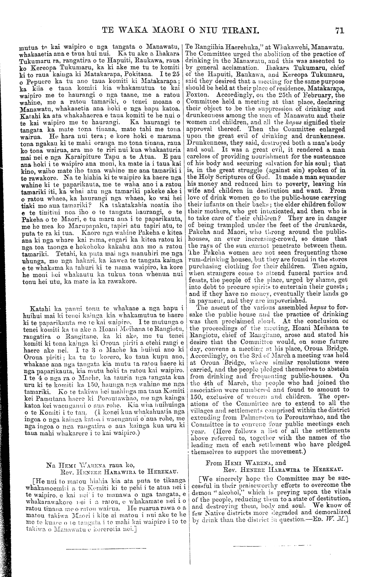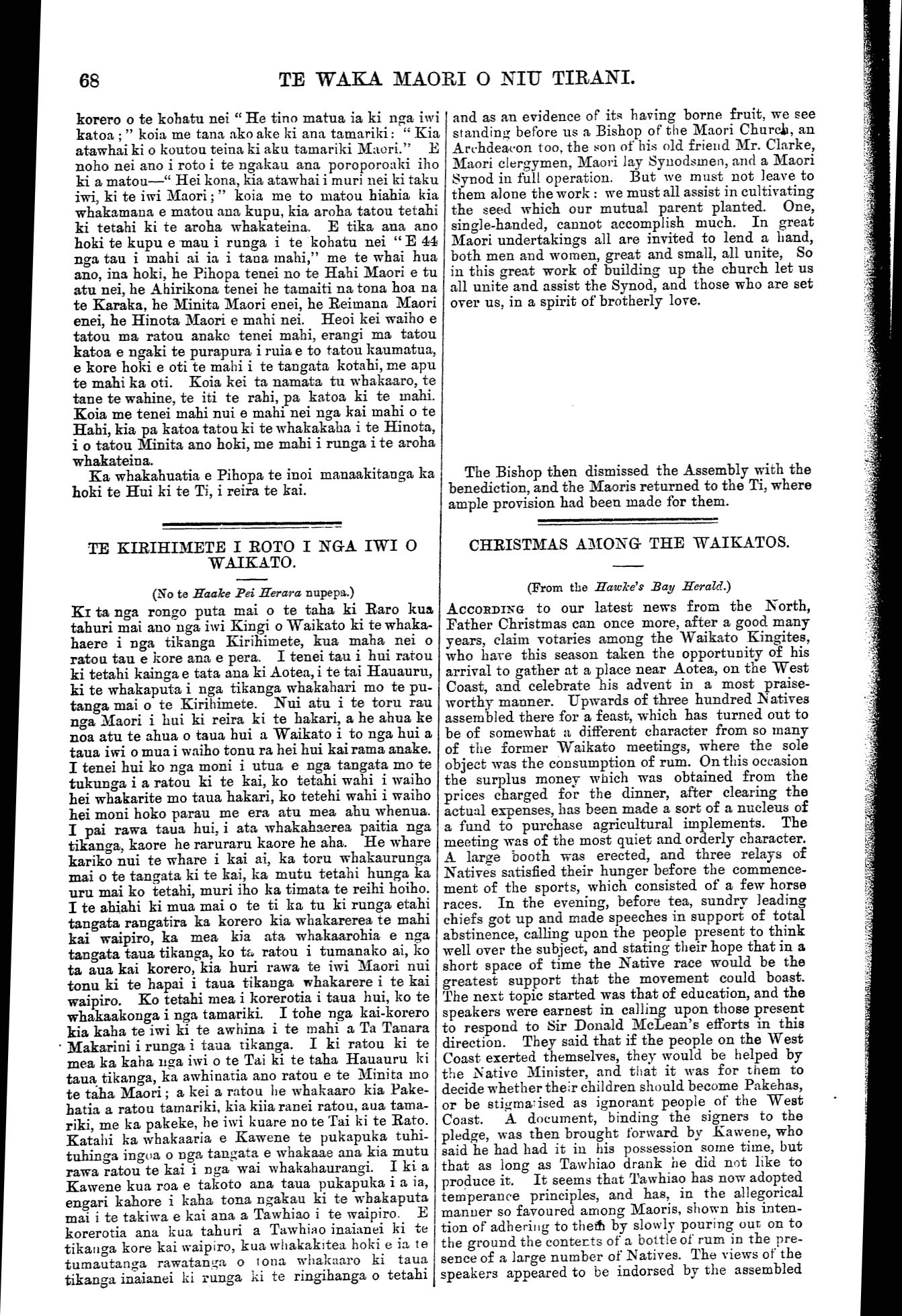 TE WAKA MAORI O NIU TIRANI. korero o te kohatu nei " He tino matua ia ki nga iwi katoa ; " koia me tana ako ake ki ana tamariki: " Kia atawhai ki o koutou teina ki aku tamariki Maori." E noho nei ano i roto i te ngakau ana poroporoaki iho ki a matou—" Hei kona, kia atawhai i muri nei ki taku iwi, ki te iwi Maori; " koia me to matou hiahia kia whakamana e matou ana kupu, kia aroha tatou tetahi ki tetahi ki te aroha whakateina. E tika ana ano hoki te kupu e mau i runga i te kohatu nei " E 44 nga tau i mahi ai ia i tana mahi," me te whai hua ano, ina hoki, he Pihopa tenei no te Hahi Maori e tu atu nei, he Ahirikona tenei he tamaiti na tona hoa na te Karaka, he Minita Maori enei, he Reimana Maori enei, he Hinota Maori e mahi nei. Heoi kei waiho e tatou ma ratou anake tenei mahi, erangi ma tatou katoa e ngaki te purapura i ruia e to tatou kaumatua, e kore hoki e oti te mahi i te tangata kotahi, me apu te mahi ka oti. Koia kei ta namata tu whakaaro, te tane te wahine, te iti te rahi, pa katoa ki te mahi. Koia me tenei mahi nui e mahi nei nga kai mahi o te Hahi, kia pa katoa tatou ki te whakakaha i te Hinota, i o tatou Minita ano hoki, me mahi i runga i te aroha whakateina. Ka whakahuatia e Pihopa te inoi manaakitanga ka hoki te Hui ki te Ti, i reira te kai. TE KIRIHIMETE I ROTO I NGA IWI O WAIKATO. (No te Haake Pei Herara nupepa.) Ki ta nga rongo puta mai o te taha ki Raro kua tahuri mai ano nga iwi Kingi o Waikato ki te whaka- haere i nga tikanga Kirihimete, kua maha nei o ratou tau e kore ana e pera. I tenei tau i hui ratou ki tetahi kainga e tata ana ki. Aotea, i te tai Hauauru, ki te whakaputa i nga tikanga whakahari mo te pu- tanga mai o te Kirihimete. Nui atu i te toru rau nga Maori i hui ki reira ki te hakari, a he ahua ke noa atu te ahua o taua hui a Waikato i to nga hui a taua iwi o mua i waiho tonu ra hei hui kai rama anake. I tenei hui ko nga moni i utua e nga tangata mo te tukunga i a ratou ki te kai, ko tetahi wahi i waiho hei whakarite mo taua hakari, ko tetehi wahi i waiho hei moni hoko parau me era atu mea ahu whenua. I pai rawa taua hui, i ata whakahaerea paitia nga tikanga, kaore he raruraru kaore he aha. He whare kariko nui te whare i kai ai, ka toru whakaurunga mai o te tangata ki te kai, ka mutu tetahi hunga ka uru mai ko tetahi, muri iho ka timata te reihi hoiho. I te ahiahi ki mua mai o te ti ka tu ki runga etahi tangata rangatira ka korero kia whakarerea te mahi kai waipiro, ka mea kia ata whakaarohia e nga tangata taua tikanga, ko ta ratou i tumanako ai, ko ta aua kai korero, kia huri rawa te iwi Maori nui tonu ki te hapai i taua tikanga whakarere i te kai waipiro. Ko tetahi mea i korerotia i taua hui, ko te whakaakonga i nga tamariki. I tohe nga kai-korero kia kaha te iwi ki te awhina i te mahi a Ta Tanara ' Makarini i runga i taua tikanga. I ki ratou ki te mea ka kaha nga iwi o te Tai ki te taha Hauauru ki taua tikanga, ka awhinatia ano ratou e te Minita mo te taha Maori ; a kei a ratou he whakaaro kia Pake- hatia a ratou tamariki, kia kiia ranei ratou, aua tama- riki, me ka pakeke, he iwi kuare no te Tai ki te Rato. Katahi ka whakaaria e Kawene te pukapuka tuhi- tuhinga ingoa o nga tangata e whakaae ana kia mutu rawa ratou te kai i nga wai whakahaurangi. I ki a Kawene kua roa e takoto ana taua pukapuka i a ia, engari kahore i kaha tona ngakau ki te whakaputa mai i te takiwa e kai ana a Tawhiao i te waipiro. E korerotia ana kua tahuri a Tawhiao inaianei ki te tikanga kore kai waipiro, kua whakakitea hoki e ia te tumautanga rawatanga o tona whakaaro ki taua tikanga inaianei ki runga ki te ringihanga o tetahi and as an evidence of its having borne fruit, we see standing before us a Bishop of the Maori Church, an Archdeacon too, the son of his old friend Mr. Clarke, Maori clergymen, Maori lay Synodsmen, and a Maori Synod in full operation. But we must not leave to them alone the work : we must all assist in cultivating the seed which our mutual parent planted. One, single-handed, cannot accomplish much. In great Maori undertakings all are invited to lend a hand, both men and women, great and small, all unite, So in this great work of building up the church let us all unite and assist the Synod, and those who are set over us, in a spirit of brotherly love. The Bishop then dismissed the Assembly with the benediction, and the Maoris returned to the Ti, where ample provision had been made for them. CHRISTMAS AMONG THE WAIKATOS. (From the Hawke's Bay Herald.) ACCORDING to our latest news from the North, Father Christmas can once more, after a good many years, claim votaries among the Waikato Kingites, who have this season taken the opportunity of his arrival to gather at a place near Aotea, on the West Coast, and celebrate his advent in a most praise- worthy manner. Upwards of three hundred Natives assembled there for a feast, which has turned out to be of somewhat a different character from so many of the former Waikato meetings, where the sole object was the consumption of rum. On this occasion the surplus money which was obtained from the prices charged for the dinner, after clearing the actual expenses, has been made a sort of a nucleus of a fund to purchase agricultural implements. The meeting was of the most quiet and orderly character. A large booth was erected, and three relays of Natives satisfied their hunger before the commence- ment of the sports, which consisted of a few horse races. In the evening, before tea, sundry leading chiefs got up and made speeches in support of total abstinence, calling upon the people present to think well over the subject, and stating their hope that in a short space of time the Native race would be the greatest support that the movement could boast. The next topic started was that of education, and the speakers were earnest in calling upon those present to respond to Sir Donald McLean's efforts in this direction. They said that if the people on the West Coast exerted themselves, they would be helped by the Native Minister, and tha