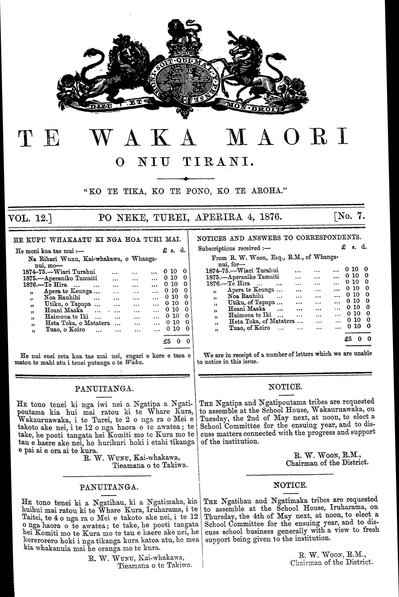 TE WAKA MAORI O NIU TIRANI. "KO TE TIKA, KO TE PONO, KO TE AROHA." VOL. 12.] PO NEKE, TUREI, APERIRA 4, 1876. [No. 7. HE KUPU WHAKAATU KI NGA HOA TUHI MAI. He moni kua tae mai:—£ s. d. Na Rihari Wunu, Kai-whakawa, o Whanga- nui, mo— 1874-75.—Wiari Turahui... ... ... O 10 O 1875.—Aperaniko Tamaiti ... ... ... 010 O 1876.—Te Hira ... ... ... ... ... O 10 O „ Apera te Keunga... ... ... ... O 10 O ,. Noa Rauhihi ... ... ... ... O 10 O „ Utiku, o Tapapa ... ... ... ... O 10 O „ Hoani Maaka ... . ... ... ... O 10 O „ Haimona te Iki ... ... ... ... O 10 O „ Heta Toka, o Matatera ... ... ... 010 O „ Tuao, o Koiro ... ... ... ... O 10 O £500 He nui enei reta kua tae mai nei, engari e kore e taea e matou te mahi atu i tenei putanga o te Waka. PANUITANGA. HE tono tenei ki nga iwi nei a Ngatipa a Ngati- poutama kia hui mai ratou ki te Whare Kura, Wakauruawaka, i te Turei, te 2 o nga ra o Mei e takoto ake nei, i te 12 o nga haora o te awatea; te take, he pooti tangata hei Komiti mo te Kura mo te tau e haere ake nei, he hurihuri hold i etahi tikanga e pai ai e ora ai te kura. R. W. WUNU, Kai-whakawa, Tieamana o te Takiwa. PANUITANGA. HE tono tenei ki a Ngatihau, ki a Ngatimaka, kia huihui mai ratou ki te Whare Kura, Iruharama, i te Taitei, te 4 o nga ra o Mei e takoto ake nei, i te 12 o nga haora o te awatea; te take, he pooti tangata hei Komiti mo te Kura mo te tau e haere ake nei, he korerorero hoki i nga tikanga kura katoa atu, he mea kia whakanuia mai he oranga mo te kura. R. W. WUNU, Kai-whakawa, Tieamana o te Takiwa, NOTICES AND ANSWERS TO CORRESPONDENTS. Subscriptions received :—£ s. d. From R. W. Woon, Esq., R.M., of Whanga- nui, for— 1874-75.—Wiari Turahui ... ... ... O 10 O 1875.—Aperaniko Tamaiti ... ... ... O 10 O 1876.—Te Hira ... ... ... ... ... O 10 O „ Apera te Keunga ... ... ... ... O 10 O „ Noa Rauhihi ... ... ... ... O 10 O „ Utiku, of Tapapa... ... ... ... O 10 O „ Hoani Maaka ... ... ... ... O 10 O „ Haimona te Iki ... ... ... ... O 10 O „ Heta Toka, of Matatera ... ... ... 010 O „ Tuao, of Koiro ... ... ... ... O 10 O £500 We are in receipt of a number of letters which we are unable to notice in this issue. NOTICE. THE Ngatipa and Ngatipoutama tribes are requested to assemble at the School House, Wakauruawaka, on Tuesday, the 2nd of May next, at noon, to elect a School Committee for the ensuing year, and to dis- cuss matters connected with the progress and support of the institution. R. W. WOON, R.M., Chairman of the District. NOTICE. THE Ngatihau and Ngatimaka tribes are requested to assemble at the School House, Iruharama, on Thursday, the 4th of May next, at noon, to elect a School Committee for the ensuing year, and to dis- cuss school business generally with a view to fresh support being given to the institution. R. W. WOON, R.M., Chairman of the District.