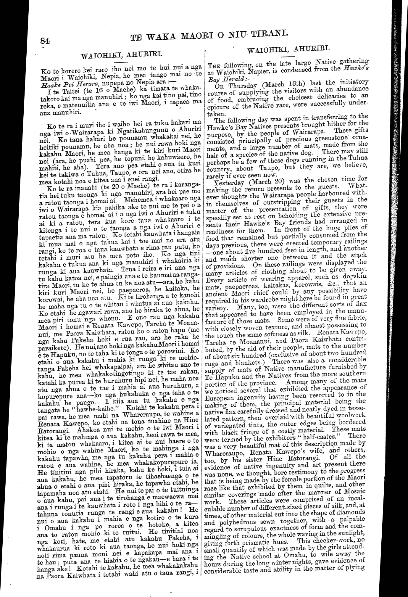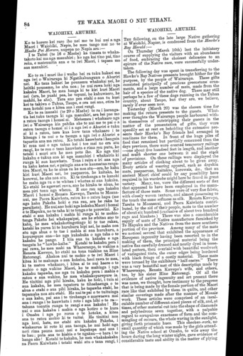TE WAKA MAORI O NIU TIRANI. WAIOHIKI, AHURIRI. Ko te korero kei raro iho nei mo te hui nui a nga Maori i Waiohiki, Nepia, he mea tango mai no te Haake Pei Herara, nupepa no Nepia ara:— I te Taitei (te 16 o Maehe) ka timata te whaka- takoto kai ma nga manuhiri ; ko nga kai tino pai, tino reka, e matenuitia ana e te iwi Maori, i tapaea ma aua manuhiri. Ko te ra i muri iho i waiho hei ra tuku hakari ma nga iwi o Wairarapa ki Ngatikahungunu o Ahuriri nei. Ko taua hakari he pounamu whakakai nei, he heitiki pounamu, he aha noa ; he nui rawa hoki nga kakahu Maori, he mea hanga ki te kiri kuri Maori nei (ara, he puahi pea, he topuni, he kahuwaero, he mahiti, he aha). Tera ano pea etahi o aua tu kuri kei te takiwa o Tuhua, Taupo, e ora nei ano. otira he mea kotahi noa e kitea ana i enei rangi. Ko te ra inanahi (te 20 o Maehe) te ra i karanga- tia hei tuku taonga ki nga manuhiri, ara hei pae mo a ratou taonga i homai ai. Mehemea i whakaaro nga iwi o Wairarapa kia pahika ake te nui me te pai o a ratou taonga e homai ai i a nga iwi o Ahuriri e tuku ai ki a ratou, tera kua kore taua whakaaro i te kitenga i te nui o te taonga a nga iwi o Ahuriri e tapaetia ana ma ratou. Ko tetahi kauwhata i hangaia ki mua mai o nga tahua kai i toe mai no era atu rangi, ko te roa o taua kauwhata e rima rau putu, ko tetahi i muri atu he mea poto iho. Ko nga tini kakahu e tukua ana ki nga manuhiri i whakairia ki runga ki aua kauwhata. Tena i reira e iri ana nga tu kahu katoa nei, e paingia ana ete kaumatua ranga- tira Maori, tu ke te ahua tu ke noa atu—ara, he kahu kiri kuri Maori nei, he paepaeroa, he kaitaka, he korowai, he aha noa atu. Ki te tirohanga a te kanohi he maha nga tu o te whitau i whatua ai aua kakahu. Ko etahi he ngawari rawa, ano he hiraka te ahua, he mea piri tonu nga whenu. E ono rau nga kakahu Maori i homai e Renata Kawepo, Tareha te Moana- nui, me Paora Kaiwhata, ratou ko o ratou hapu (me nga kahu Pakeha hoki e rua rau, ara he raka he paraikete). He nui ano hoki nga kakahu Maori i homai e te Hapuku, no te taha ki te tonga o te porowini. Ko etahi o aua kakahu i mahia ki runga ki te mohio- tanga Pakeha hei whakapaipai, ara he whitau ano te kahu, he mea whakakotingotingo ki te tae rakau, katahi ka purea ki te huruhuru hipi nei, he maha noa atu nga ahua o te tae i mahia ai aua huruhuru, a kopurepure ana—ko nga hukahuka o nga taha o te kakahu he pango. I kiia aua tu kakahu e nga tangata he " hawhe-kaihe." Kotahi te kakahu pera i pai rawa, he mea mahi na Whareraupo, te wahine a Renata Kawepo, ko etahi na tona tuahine na Hine Ratorangi. Ahakoa nui te mohio o te iwi Maori i kitea ki te mahinga o aua kakahu, heoi rawa te mea, ki ta matou whakaaro, i kitea ai te nui haere o te mohio o nga wahine Maori, ko te mahinga i nga kakahu tapawha, me nga tu kakahu pera i mahia e ratou e aua wahine, he mea whakakopurepure ia. He tinitini nga pihi hiraka, kahu ke hoki, i tuia ai aua kakahu, he mea tapatoru te tihaehaenga o te ahua o etahi o aua pihi hiraka, he tapawha etahi, he tapamaha noa atu etahi. He nui te pai o te tuituinga o aua kahu, pai ana i te tirohanga e maewaewa mai ana i runga i te kauwhata i roto i nga hihi o te ra— tahuna tonutia runga te rangi e aua kakahu! He nui o aua kakahu i mahia e nga kotiro o te kura i Omahu i nga po roroa o te hotoke, a kitea ana to ratou mohio ki te tuitui. He tinitini noa nga koti, hate, me etahi atu kakahu Pakeha, i whakaurua ki roto ki aua taonga, he nui hoki nga noti rima pauna moni nei e kapakapa mai ana i te hau; puta ana te hiahia o te ngakau—e hara i te hanga ake! Kotahi te kakahu, he mea whakakakahu na Paora Kaiwhata i tetahi wahi atu o taua rangi, i WAIOHIKI, AHURIRI. THE following, on the late large Native gathering- at Waiohiki, Napier, is condensed from the Hawke's Bay Herald:— On Thursday (March 16th) last the initiatory course of supplying the visitors with an abundance of food, embracing the choicest delicacies to an epicure of the Native race, were successfully under- taken. The following day was spent in transferring to the Hawke's Bay Natives presents brought hither for the purpose, by the people of Wairarapa. These gifts consisted principally of precious greenstone orna- ments, and a large number of mats, made from the hair of a species of the native dog. There may still perhaps be a few of these dogs running in the Tuhua country, about Taupo, but they are, we believe, rarely if ever seen now. Yesterday (March 20) was the chosen time for making the return presents to the guests. What- ever thoughts the Wairarapa people harboured with- in themselves of outstripping their guests in the matter of the presentation of gifts, they were speedily set at rest on beholding the extensive pre- sents their Hawke's Bay friends had arranged in readiness for them. In front of the huge piles of food that remained but partially consumed from the days previous, there were erected temporary railings —one about live hundred feet in length, and another and much shorter one between it and the stack of provisions?. On these railings were displayed the many articles of clothing about to be given away. Every article of wearing apparel, such as dogskin mats, paepaeroas, kaitakas, korowais, &c., that au ancient Maori chief could by any possibility have required in his wardrobe might here be found in great variety. Many, too, were the different sorts of flax that appeared to have been employed in the manu- facture of those mats. Some were of very fine fabric, with closely woven texture, and almost possessing to the touch the same softness as silk. Renata Kawepo, Tareha te Moananui, and Paora Kaiwhata contri- buted, by the aid of their people, mats to the number of about six hundred (exclusive of about two hundred rugs and blankets.) There was also a considerable supply of mats of Native manufacture furnished by Te Hapuku and the Natives from the more southern, portion of the province. Among many of the mats we noticed several that exhibited the appearance of European ingenuit