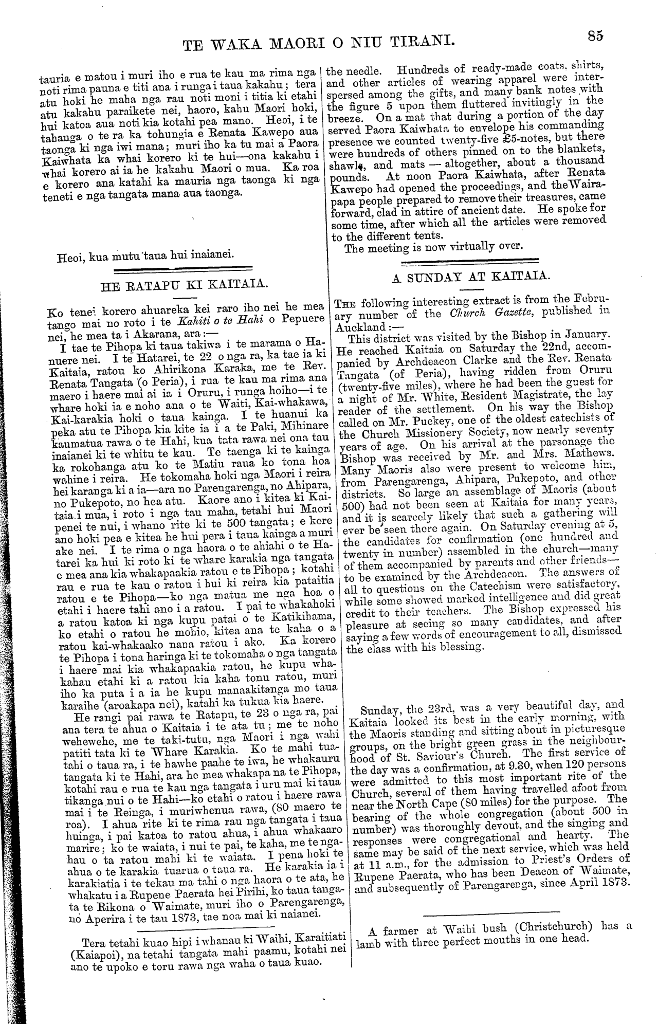 TE WAKA MAORI O NIU TIRANI. 85 tauria e matou i muri iho e rua te kau ma rima nga noti rima pauna e titi ana i runga i taua kakahu ; tera atu hoki he maha nga rau noti moni i titia ki etahi atu kakahu paraikete nei, haoro, kahu Maori hoki, hui katoa aua noti kia kotahi pea mano. Heoi, i te tahanga o te ra ka tohungia e Renata Kawepo aua taonga ki nga iwi mana; muri iho ka tu mai a Paora Kaiwhata ka whai korero ki te hui—ona kakahu i whai korero ai ia he kakahu Maori o mua. Ka roa e korero ana katahi ka mauria nga taonga ki nga teneti e nga tangata mana aua taonga. Heoi, kua mutu taua hui inaianei. HE RATAPU KI KAITAIA. Ko tenei korero ahuareka kei raro iho nei he mea tango mai no roto i te Kahiti o te Hahi o Pepuere nei, he mea ta i Akarana, ara:— I tae te Pihopa ki taua takiwa i te marama o Ha- nuere nei. I te Hatarei, te 22 o nga ra, ka tae ia ki Kaitaia, ratou ko Ahirikona Karaka, rae te Rev. Renata Tangata (o Peria), i rua te kau ma rima ana maero i haere mai ai ia i Oruru, i runga hoiho—i te whare hoki ia e noho ana o te Waiti, Kai-whakawa, Kai-karakia hoki o taua kainga. I te huanui ka peka atu te Pihopa kia kite ia i a te Paki, Mihinare kaumatua rawa o te Hahi, kua tata rawa nei ona tau inaianei ki te whitu te kau. Te taenga ki te kainga ka rokohanga atu ko te Matiu raua ko tona hoa wahine i reira. He tokomaha hoki nga Maori i reira hei karanga ki a ia—ara no Parengarenga, no Ahipara, no Pukepoto, no hea atu. Kaore ano i kitea ki Kai- taia. i mua, i roto i nga tau maha, tetahi hui Maori penei te nui, i whano rite ki te 500 tangata; e kore ano hoki pea e kitea he hui pera i taua kainga a muri ake nei. I te rima o nga haora o te ahiahi o te Ha- tarei ka hui ki roto ki te whare karakia nga tangata e mea ana kia whakapaakia ratou e te Pihopa ; kotahi rau e rua te kau o ratou i hui ki reira kia pataitia ratou e te Pihopa—ko nga matua me nga hoa o etahi i haere tahi ano i a ratou. I pai to whakahoki a ratou katoa ki nga kupu patai o te Katikihama, ko etahi o ratou he mohio, kitea ana te kaha o a ratou kai-whakaako nana ratou i ako. Ka korero te Pihopa i tona haringa ki te tokomaha o nga tangata i haere mai kia whakapaakia ratou, he kupu wha- kahau etahi ki a ratou kia kaha tonu ratou, muri iho ka puta i a ia he kupu manaakitanga mo taua karaihe (aroakapa nei), katahi ka tukua kia haere. He rangi pai rawa te Ratapu, te 28 o nga ra, pai ana tera te ahua o Kaitaia i te ata tu ; me te noho wehewehe, me te taki-tutu, nga Maori i nga wahi patiti tata ki te Whare Karakia. Ko te mahi tua- tahi o taua ra, i te hawhe paahe te iwa, he whakauru tangata ki te Hahi, ara ho mea whakapa na te Pihopa, kotahi rau e rua te kau nga tangata i uru mai ki taua tikanga nui o te Hahi—ko etahi o ratou i haere rawa mai i te Reinga, i muriwhenua rawa, (80 maero te roa). I ahua rite ki te rima rau nga tangata i taua huinga, i pai katoa to ratou ahua, i ahua whakaaro marire; ko te waiata, i nui te pai, te kaha, me te nga- hau o ta ratou mahi ki te waiata. I pena hoki te ahua o te karakia tuarua o taua ra. He karakia ia i karakiatia i te tekau ma tahi o nga haora o te ata, he whakatu i a Rupene Paerata hei Pirihi, ko taua tanga- ta te Rikona o Waimate, muri iho o Parengarenga, no Aperira i te tau 1873, tae noa mai ki naianei. Tera tetahi kuao hipi i whanau ki Waihi, Karaitiati (Kaiapoi), na tetahi tangata mahi paamu, kotahi nei ano te upoko e toru rawa nga waha o taua kuao. the needle. Hundreds of ready-made coats, shirts, and other articles of wearing apparel were inter- persed among the gifts, and many bank notes with the figure 5 upon them fluttered invitingly in the breeze. On a mat that during a portion of the day served Paora Kaiwhata to envelope his commanding presence we counted twenty-five £5-notes, but there were hundreds of others pinned on to the blankets, shawls, and mats — altogether, about a thousand pounds. At noon Paora Kaiwhata, after Renata Kawepo had opened the proceedings, and the Waira- papa people prepared to remove their treasures, came forward, clad in attire of ancient date. He spoke for some time, after which all the articles were removed to the different tents. The meeting is now virtually over. A SUNDAY AT KAITAIA. THE following interesting extract is from the Febru- ary number of the Church Gazette, published in Auckland:— This district was visited by the Bishop in January. He reached Kaitaia on Saturday the 22nd, accom- panied by Archdeacon Clarke and the Rev. Renata Tangata (of Peria), having ridden from Oruru (twenty-five miles), where he had been the guest for a night of Mr. White, Resident Magistrate, the lay reader of the settlement. On his way the Bishop called on Mr. Puckey, one of the oldest catechists of the Church Missionery Society, now nearly seventy years of age. On his arrival at the parsonage the Bishop was received by Mr. and Mrs. Mathews. Many Maoris also were present to welcome him, from Parengarenga, Ahipara, Pukepoto, and other districts. So large an assemblage of Maoris (about 500) had not been seen at Kaitaia for many years, and it is scarcely likely that such a gathering will ever be seen there again. On Saturday evening at 5, the candidates for confirmation (one hundred and twenty in number) assembled in the church—many of them accompanied by parents and other friends— to be examined by the Archdeacon. The answers of all to questions on the Catechism were satisfactory, while some showed marked intelligence and did great credit to their teachers. The Bishop expressed his pleasure at seeing so many candidates, and after saying a few words of encouragement to all, dismissed the class with his blessing. Sunday, the 23rd, was a very beautiful day, and Kaitaia looked its best in the early morning, with the Maoris standing and sitting about in picturesque groups, on the bright green grass in the neighbour- hood of St. Saviour's Church. The first service of the day was a confirmation, at 9.80, when 120 persons were admitted to this most important rit