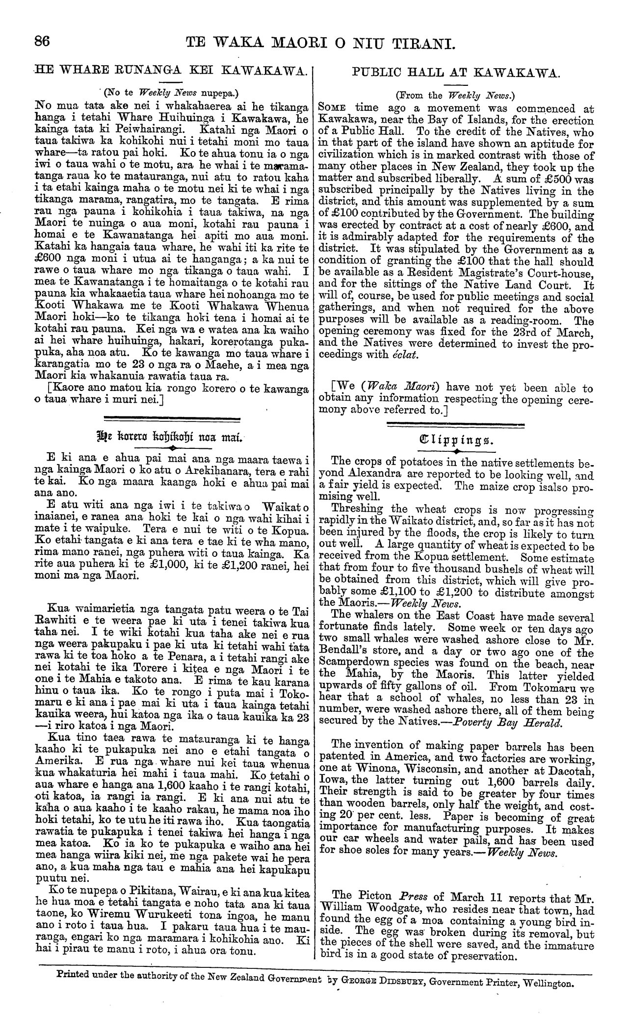 86 TE WAKA MAORI O NIU TIRANI. HE WHARE RUNANGA KEI KAWAKAWA. ' (No te Weekly News nupepa.) No mua tata ake nei i whakahaerea ai he tikanga hanga i tetahi Whare Huihuinga i Kawakawa, he kainga tata ki Peiwhairangi. Katahi nga Maori o taua taiawa ka kohikohi nui i tetahi moni mo taua whare—ta ratou pai hoki. Ko te ahua tonu ia o nga iwi o taua wahi o te motu, ara he whai i te marama- tanga raua ko te matauranga, nui atu to ratou kaha i ta etahi kainga maha o te motu nei ki te whai i nga tikanga marama, rangatira, mo te tangata. E rima rau nga pauna i kohikohia i taua takiwa, na nga Maori te nuinga o aua moni, kotahi rau pauna i homai e te Kawanatanga hei apiti mo aua moni. Katahi ka hangaia taua whare, he wahi iti ka rite te £600 nga moni i utua ai te hanganga; a ka nui te rawe o taua whare mo nga tikanga o taua wahi. I mea te Kawanatanga i te homaitanga o te kotahi rau pauna kia whakaaetia taua whare hei nohoanga mo te Kooti Whakawa me te Kooti Whakawa Whenua Maori hoki—ko te tikanga hoki tena i homai ai te kotahi rau pauna. Kei nga wa e watea ana ka waiho ai hei whare huihuinga, hakari, korerotanga puka- puka, aha noa atu. Ko te kawanga mo taua whare i karangatia mo te 23 o nga ra o Maehe, a i mea nga Maori kia whakanuia rawatia taua ra. [Kaore ano matou kia rongo korero o te kawanga o taua whare i muri nei.] he korero kohikohi noa mai. E ki ana e ahua pai mai ana nga maara taewa i nga kainga Maori o ko atu o Arekihanara, tera e rahi te kai. Ko nga maara kaanga hoki e ahua pai mai ana ano.\_ E atu witi ana nga iwi i te takiwa o Waikato inaianei, e ranea ana hoki te kai o nga wahi kihai i mate i te waipuke. Tera e nui te witi o te Kopua. Ko etahi tangata e ki ana tera e tae ki te wha mano, rima mano ranei, nga puhera witi o taua kainga. Ka rite aua puhera ki te £1,000, ki te £1,200 ranei., hei moni ma nga Maori. Kua waimarietia nga tangata patu weera o te Tai Rawhiti e te weera pae ki uta i tenei takiwa kua taha nei. I te wiki kotahi kua taha ake nei e rua nga weera pakupaku i pae ki uta ki tetahi wahi tata rawa ki te toa hoko a te Penara, a i tetahi rangi ake nei kotahi te ika Torere i kitea e nga Maori i te one i te Mahia e takoto ana. E rima te kau karana hinu o taua ika. Ko te rongo i puta mai i Toko- maru e ki ana i pae mai ki uta i taua kainga tetahi kauika weera, hui katoa nga ika o taua kauika ka 23 —i riro katoa i nga Maori. Kua tino taea rawa te matauranga ki te hanga kaaho ki te pukapuka nei ano e etahi tangata o Amerika. E rua nga whare nui kei taua whenua kua whakaturia hei mahi i taua mahi. Ko tetahi o aua whare e hanga ana 1,600 kaaho i te rangi kotahi, oti katoa, ia rangi ia rangi. E ki ana nui atu te kaha o aua kaaho i te kaaho rakau, he mama noa iho hoki tetahi, ko te utu he iti rawa iho. Kua taongatia rawatia te pukapuka i tenei takiwa hei hanga i nga mea katoa. Ko ia ko te pukapuka e waiho ana hei mea hanga wiira kiki nei, me nga pakete wai he pera ano, a kua maha nga tau e mahia ana hei kapukapu puutu nei. Ko te nupepa o Pikitana, Wairau, e ki ana kua kitea he hua moa e tetahi tangata e noho tata ana ki taua taone, ko Wiremu Wurukeeti tona ingoa, he manu ano i roto i taua hua. I pakaru taua hua i te mau- ranga, engari ko nga maramara i kohikohia ano. Ki hai i pirau te manu i roto, i ahua ora tonu. PUBLIC HALL AT KAWAKAWA. (From the Weekly News.) SOME time ago a movement was commenced at Kawakawa, near the Bay of Islands, for the erection of a Public Hall. To the credit of the Natives, who in that part of the island have shown an aptitude for civilization which is in marked contrast with those of many other places in New Zealand, they took up the matter and subscribed liberally. A sum of £500 was subscribed principally by the Natives living in the district, and this amount was supplemented by a sum of £100 contributed by the Government. The building was erected by contract at a cost of nearly £600, and it is admirably adapted for the requirements of the district. It was stipulated by the Government as a condition of granting the £100 that the hall should be available as a Resident Magistrate's Court-house, and for the sittings of the Native Land Court. It will of, course, be used for public meetings and social gatherings, and when not required for the above purposes will be available as a reading-room. The opening ceremony was fixed for the 23rd of March, and the Natives were determined to invest the pro- ceedings with eclat. [We (Waka Maori) have not yet been able to obtain any information respecting the opening cere- mony above referred to.] Clippings. The crops of potatoes in the native settlements be- yond Alexandra are reported to be looking well, and a fair yield is expected. The maize crop is also pro- mising well. Threshing the wheat crops is now progressing rapidly in the Waikato district, and, so far as it has not been injured by the floods, the crop is likely to turn out well. A large quantity of wheat is expected to be received from the Kopua settlement. Some estimate that from four to five thousand bushels of wheat will be obtained from this district, which will give pro- bably some £1,100 to £1,200 to distribute amongst the Maoris.—Weekly News. The whalers on the East Coast have made several fortunate finds lately. Some week or ten days ago two small whales were washed ashore close to Mr. Bendall's store, and a day or two ago one of the Scamperdown species was found on the beach, near the Mahia, by the Maoris. This latter yielded upwards of fifty gallons of oil. From Tokomaru we hear that a school of whales, no less than 23 in number, were washed ashore there, all of them being secured by the Natives.—Poverty Bay Herald. The invention of making paper barrels has been patented in America, and two factories are working, one at Winona, Wisconsin, and another at Dacotah, Iowa, the latter turning out 1,600 barrels daily. Their strength is said to be greater by four times than wooden barrels, only half the weight, and cost- ing 20 per cent. 