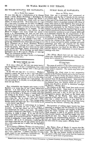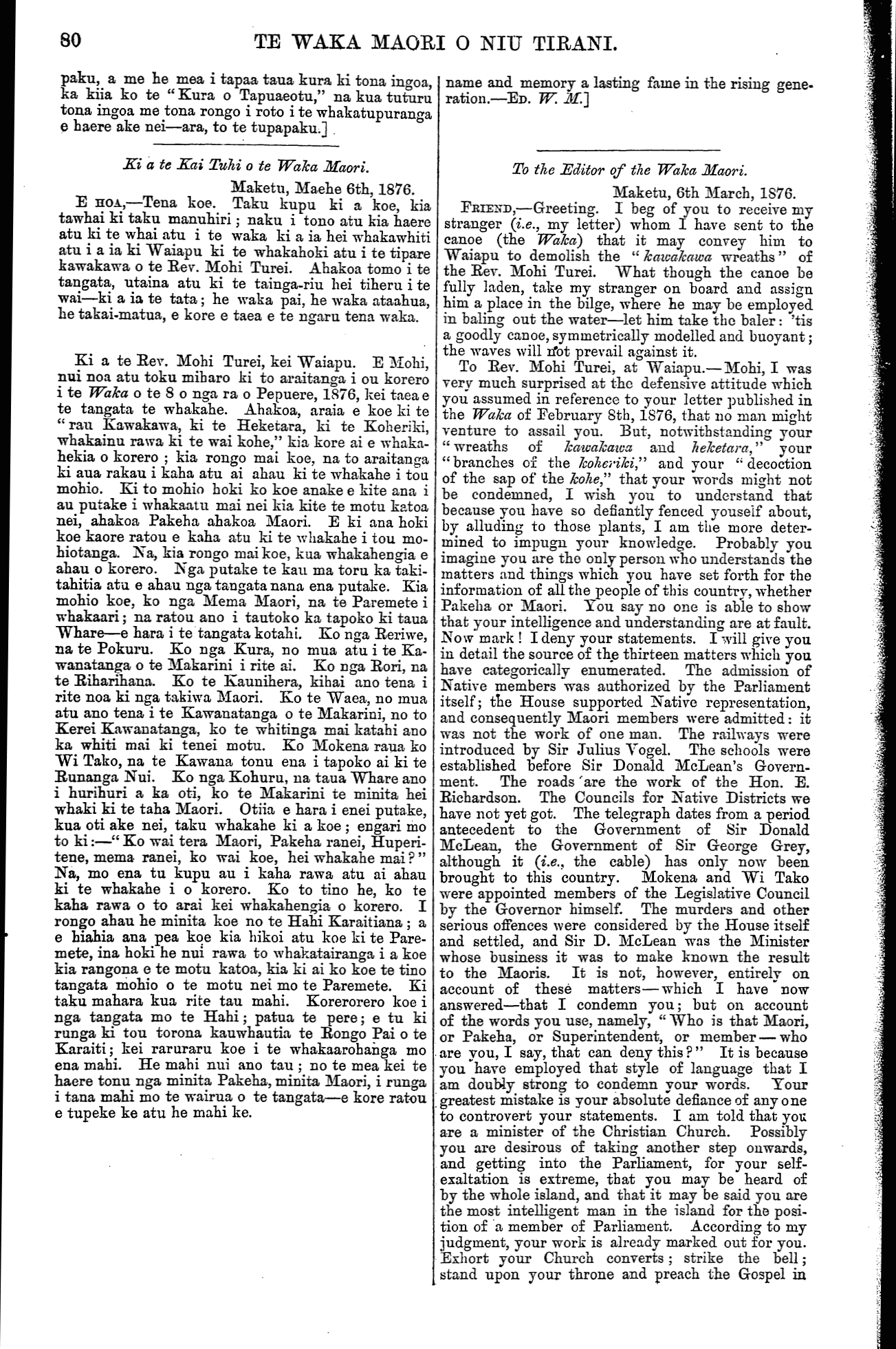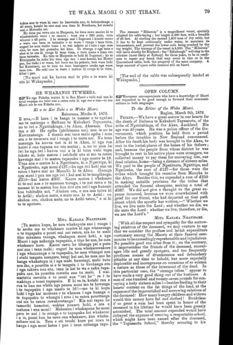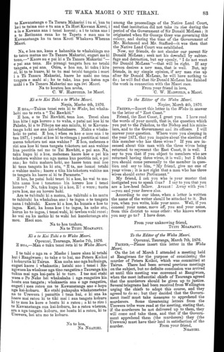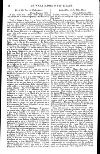 TE WAKA MAORI O NIU TIRANI. Ki a te Kai Tuhi o te Waka Maori. Nepia, Pepuere, 1876. E HOA,—Tena koe. Tenei etahi kupu ruarua nei, utaina atu ki te mata-taputapu o to tatou waka. Tenei te hanga, e koro, ko te hanga nei ko te rongo-kino, a tae aua mai te pahunu ki roto ki te tau o te ate. Ara, tenei te whakarongo nei te taringa, te titiro nei nga kanohi, ki te korero a te tangata, me te reta tuhituhi ano hoki a nga iwi e tukua mai nei kia taia ki te Wananga, e whakakino nei ki to ratou matua ki a Ta Tanara Makarini, e ai ra ki taku nei, ki ta te ware i kite ai, he matua no nga iwi Maori i runga i tenei motu. Na, iana, whakarongo mai hoki koutou, e hoa ma, ki etahi o aku i kite ai o nga painga a to tatou matua, a Ta Tanara Makarini, i whakaputa ai ki nga iwi Maori: — 1. Na te Kawanatanga o Ta Tanara Makarini ka ora te tangata mau herehere i roto i te whawhai, a ka whakahokia ano ki o ratou kainga.— 2. Na te Kawanatanga o Ta Tanara Makarini ka oti nga Waea me nga Rerewe.—3. Na te Kawanatanga o Ta Tanara Makarini ka tu nga Kura, ka oti ano hoki nga Rori, ki nga takiwa Maori.—4. Na te Kawanatanga o Ta Tanara Makarini ka uru nga mema Maori ki te Paremete.—5. Na te Kawana- tanga o Ta Tanara Makarini ka marie mai a Tawhi ao me ona iwi Hau Hau ki a tatou. Kaore ia ra ? He whakaaro riri ano kei roto i nga tangata o Tawhiao ; na te kaha na te mohio o te Kawanatanga o Ta Tanara Makarini ki te whakahaere, koia enei ahua marie o tatou e noho nei i enei ra. Kati nei aku e tuhi iho. Tera atu ano ia te nuinga o nga mahi pai o tona Kawanatanga; heoi, kei kikii to tatou waka, kei kore he wahi hei utanga mai mo a etahi. Na, akuanei pea ka ki mai etahi tangata, na tana Kawanatanga i he ai nga whenua, i riro ai nga whenua i te mokete, i riro ai ano hoki i te hoko ki te waipiro, me era atu mea katoa e riro ai te whenua, a nana ano hoki nga Komihana hoko whenua i tuku ki etahi wahi o te motu nei, koia ka riro ai etahi o matou whenua. Na, whakarongo mai ki taku mo te mokete. E hara i a te Makarini tena mahi; engari na te Pakeha i ki atu na ki te Maori kia moketetia te whenua a te Maori ki a ia—na aua Pakeha taua mahi. Tenei te mea i ki ai au na aua Pakeha anake taua mahi, he kore kaore i rato ki nga motu e rua nei taua mahi na, a te mokete. I rongo ake au e kiia ana kei te porowini anake o Haake Pei; no konei au i mea ai mehemea na te Kawanatanga o Ta Tanara Makarini, kua rato katoa ki nga motu nei tenei mahi. Na, mo te taha ki nga Komihana. E hoa ma, e pai ana ra tena ; e haere atu ana i te ra e whiti ana; e kite ana te kanohi o te katoa—-o te tane o te wahine, o te tamariki, o te koroheke, o te kuia. Tenei maku e korero atu tetahi mea e rite ana. No tenei ra tonu, e tuhi iho nei au i nga reta nei, i tae au ki te toa a tetahi Pakeha, ko Kahikorowe te ingoa, patai ana au i te utu o te tarautete, ki ana mai taua Pakeha te 18 hereni; ka ki atu au, heoi ano nga moni kei roto i taku pakete te 16 hereni, e kore koe e pai kia homai mo te tekau ma ono hereni, mea ana mai tera kaore; heoi, waiho ana tana tarau haere ana au me taku moni. Na, e hoa ma, hei ritenga tenei mo nga Komihana, he haere noa ki te ui; kei nga tangata o te whenua te ritenga; ki te hoatu ki nga moni a te Komihana, heoi, ka riro te whenua; ki te kore hoatu, ka mau ano to whenua ki a koe, ka hoki te Komihana me ana moni. I haere hoki aua Komi- hana i runga i te ture e ki ana, kia oti te whakawa te whenua ka tika ai kia hokoa te whenua. Ko taua ture i whakaputaia i roto i nga mahi a te Kooti Whakawa Whenua Maori; a ko taua Kooti e hara i To the Editor of the Waka Maori. Napier, February, 1876. ,—Greeting. I send" you a few words which you can take in among the cargo of our canoe (i.e., the Waka). Defamation is at work here, so much so that one's Heart burns with indignation. The ear is continually hearing the words of certain parties, and the eye seeing letters also which are sent to be printed in the Wananga, condemning Sir Donald McLean, their friend and guardian, as I in my simplicity call him, for I am convinced he is the friend and guardian of the Maori tribes of this island. Now hearken, my friends, to some of the benefits which I have seen that our parent Sir Donald McLean has conferred upon the Native race. 1. Prisoners taken in war were spared and returned to their homes by the Government of Sir Donald McLean. 2. The telegraph and railways were constructed by the Government of Sir Donald McLean. 3. Schools were established and roads made in Native districts by the Government of Sir Donald McLean. 4. Na- tive members were introduced into Parliament by the Government of Sir Donald McLean. 5. Tawhiao and his Hau Hau followers are peaceably disposed towards us through the instrumentality of the Go- vernment of Sir Donald McLean. Is it not so? The followers of Tawhiao had thoughts of war, but from the judgment and able administration of the Govern- ment of Sir Donald McLean the present peaceful state of affairs has resulted. Let the above suffice. Many other good works have been performed by his Government, which, if all enumerated, would fill up our canoe, and there would be no space for the writings of others. Now, probably, some men will say that it was through his Government that the land came to grief; that it was mortgaged, and that it was parted with for the purchase of drink, and various other things for which land is sold; and that he sent Land Pur- chase Commissioners to various parts of the island by the action of whom some of our lands have been alienated. Now, attend to what I have to say about mortgages. That practice was not brought about by Sir Donald McLean; it was the Pakehas who asked the Maoris to mortgage their lands to them—that was the work of the Pakehas. I say it was the work of those Pakehas alone, from the fact that it is a practice which is not common to both islands. I am told it exists in Hawke's Bay only; therefore I say, if it emanated from the Government of Sir Donald McLean, it would be common to