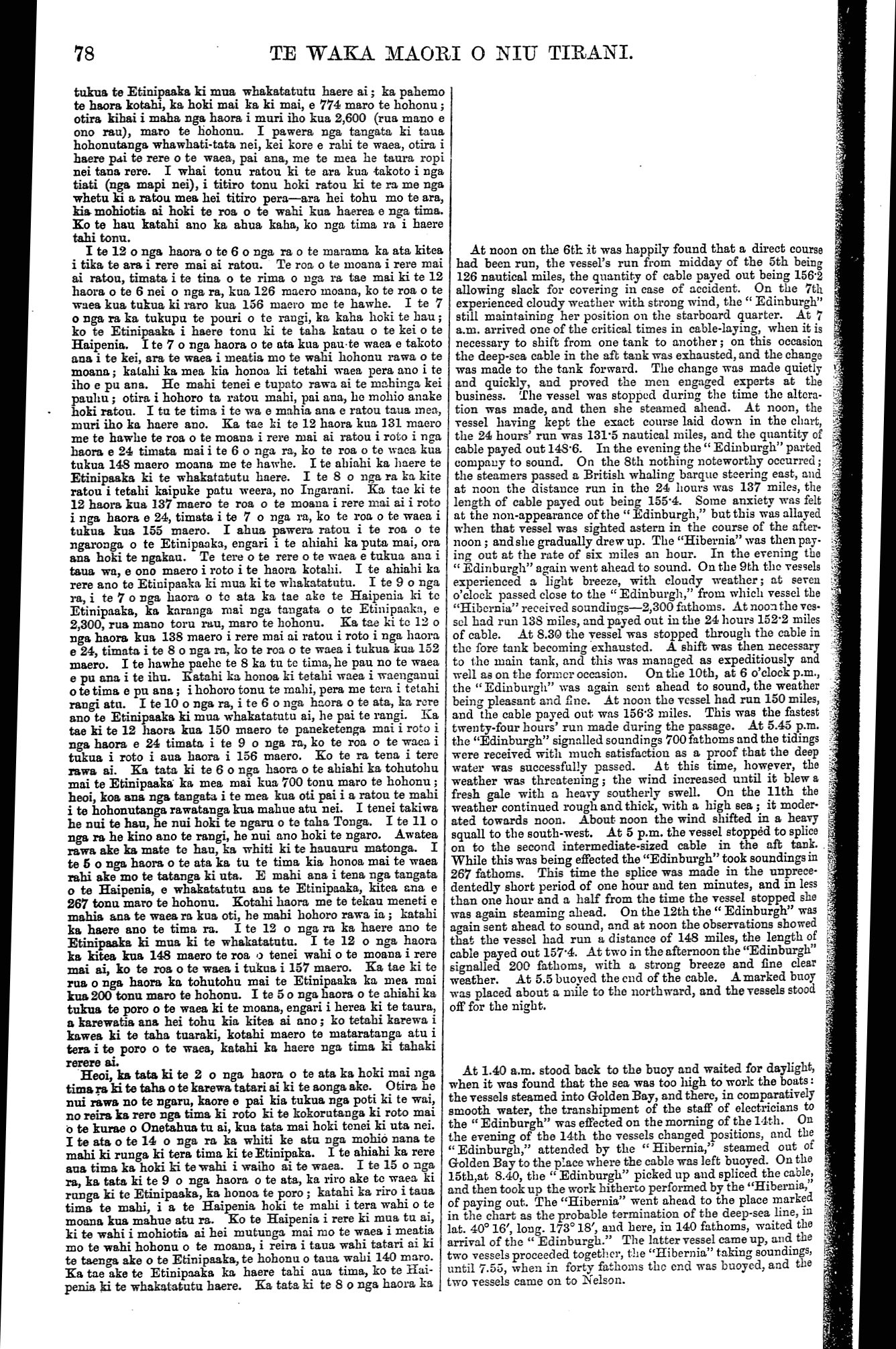 78 TE WAKA MAORI O NIU TIRANI. tukua te Etinipaaka ki mua whakatatutu haere ai; ka pahemo te haora kotahi, ka hoki mai ka ki mai, e 774 maro te hohonu; otira kihai i maha nga haora i muri iho kua 2,600 (rua mano e ono rau), maro te hohonu. I pawera nga tangata ki taua hohonutanga whawhati-tata nei, kei kore e rahi te waea, otira i haere pai te rere o te waea, pai ana, me te mea he taura ropi nei tana rere. I whai tonu ratou ki te ara kua takoto i nga tiati (nga mapi nei), i titiro tonu hoki ratou ki te ra me nga whetu ki a ratou mea hei titiro pera—ara hei tohu mo te ara, kia mohiotia ai hoki te roa o te wahi kua haerea e nga tima. Ko te hau katahi ano ka ahua kaha, ko nga tima ra i haere tahi tonu. I te 12 o nga haora o to 6 o nga ra o te marama ka ata kitea i tika te ara i rere mai ai ratou. Te roa o te moana i rere mai ai ratou, timata i te tina o te rima o nga ra tae mai ki te 12 haora o te 6 nei o nga ra, kua 126 maero moana, ko te roa o te waea kua tukua ki raro kua 156 maero me te hawhe. I te 7 o nga ra ka tukupu te pouri o te rangi, ka kaha hoki te hau; ko te Etinipaaka i haere tonu ki te taha katau o te kei o te Haipenia. I te 7 o nga haora o te ata kua pau te waea e takoto aua i te kei, ara te waea i meatia mo te wahi hohonu rawa o te moana; katahi ka mea kia honoa ki tetahi waea pera ano i te iho e pu ana. He mahi tenei e tupato rawa ai te mahinga kei pauhu; otira i hohoro ta ratou mahi, pai ana, he mohio anake hoki ratou. I tu te tima i te wa e mahia ana e ratou taua mea, muri iho ka haere ano. Ka tae ki te 12 haora kua 131 maero me te hawhe te roa o te moana i rere mai ai ratou i roto i nga haora e 24 timata mai i te 6 o nga ra, ko te roa o to waea kua tukua 148 maero moana me te hawhe. I te ahiahi ka haere te Etinipaaka ki te whakatatutu haere. I te 8 o nga ra ka kite ratou i tetahi kaipuke patu weera, no Ingarani. Ka tae ki te 12 haora kua 137 maero te roa o te moana i rere mai ai i roto i nga haora e 24, timata i te 7 o nga ra, ko te roa o te waea i tukua kua 155 maero. I ahua pawera ratou i te roa o te ngaronga o te Etinipaaka, engari i te ahiahi ka puta mai, ora ana hoki te ngakau. Te tere o te rere o te waea e tukua ana i taua wa, e ono maero i roto i te haora kotahi. I te ahiahi ka rere ano te Etinipaaka ki mua ki te whakatatutu. I te 9 o nga ra, i te 7 o nga haora o to ata ka tae ake te Haipenia ki te Etinipaaka, ka karanga mai nga tangata o te Etinipaakti, e 2,300, rua mano toru rau, maro te hohonu. Ka tae ki te 12 o nga haora kua 138 maero i rere mai ai ratou i roto i nga haora e 24, timata i te 8 o nga ra, ko te roa o te waea i tukua kua 152 maero. I te hawhe paehe te 8 ka tu te tima, he pau no te waea e pu ana i te ihu. Katahi ka honoa ki tetahi waea i waenganui o te tima e pu ana; i hohoro tonu te mahi, pera me tera i tetahi rangi atu. I te 10 o nga ra, i te 6 o nga haora o te ata, ka rere ano te Etinipaaka ki mua whakatatutu ai, he pai te rangi. Ka tae ki te 12 haora kua 150 maero te paneketenga mai i roto i nga haora e 24 timata i te 9 o nga ra, ko te roa o te waea i tukua i roto i aua haora i 156 maero. Ko te ra tena i tere rawa ai. Ka tata ki te 6 o nga haora o te ahiahi ka tohutohu mai te Etinipaaka ka mea mai kua 700 tonu maro te hohonu ; heoi, koa ana nga tangata i te mea kua oti pai i a ratou te mahi i te hohonutanga rawatanga kua mahue atu nei. I tenei takiwa he nui te hau, he nui hoki te ngaru o te taha Tonga. I te 11 o nga ra he kino ano te rangi, he nui ano hoki te ngaro. Awatea rawa ake ka mate te hau, ka whiti ki te hauauru matenga. I te 5 o nga haora o te ata ka tu te tima kia honoa mai te waea rahi ake mo te tatanga ki uta. E mahi ana i tena nga tangata o te Haipenia, e whakatatutu aua te Etinipaaka, kitea ana e 267 tonu maro te hohonu. Kotahi haora me te tekau meneti e mahia ana te waea ra kua oti, he mahi hohoro rawa ia ; katahi ka haere ano te tima ra. I te 12 o nga ra ka haere ano te Etinipaaka ki mua ki te whakatatutu. I te 12 o nga haora ka kitea kua 148 maero te roa o tenei wahi o te moana i rere mai ai, ko te roa o te waea i tukua i 157 maero. Ka tae ki te rua o nga haora ka tohutohu mai te Etinipaaka ka mea mai kua 200 tonu maro te hohonu. I te 5 o nga haora o te ahiahi ka tukua te poro o te waea ki te moana, engari i herea ki te taura, a karewatia ana hei tohu kia kitea ai ano; ko tetahi karewa i kawea ki te taha tuaraki, kotahi maero te mataratanga atu i tera i te poro o te waea, katahi ka haere nga tima ki tahaki rerere ai. Heoi, ka tata ki te 2 o nga haora o te ata ka hoki mai nga tima ra ki te taha o te karewa tatari ai ki te aonga ake. Otira he nui rawa no te ngaru, kaore e pai kia tukua nga poti ki te wai, no reira ka rere nga tima ki roto ki te kokorutanga ki roto mai o te kurae o Onetahua tu ai, kua tata mai hoki tenei ki uta nei. I te ata o te 14 o nga ra ka whiti ke atu nga mohio nana te mahi ki runga ki tera tima ki te Etinipaka. I te ahiahi ka rere aua tima ka hoki ki te wahi i waiho ai te waea. I te 15 o nga ra, ka tata ki te 9 o nga haora o te ata, ka riro ake te waea ki runga ki te Etinipaaka, ka honoa te poro ; katahi ka riro i taua tima te mahi, i a te Haipenia hoki te mahi i tera wahi o te moana kua mahue atu ra. Ko te Haipenia i rere ki mua tu ai, ki te wahi i mohiotia ai hei mutunga mai mo te waea i meatia mo te wahi hohonu o te moana, i reira i taua wahi tatari ai ki te taenga ake o te Etinipaaka, te hohonu o taua wahi 140 maro. Ka tae ake te Etinipaaka ka haere tahi aua tima, ko te Hai- penia ki te whakatatutu haere. Ka tata ki te 8 o nga haora ka At noon on the 6th it was happily found that a direct course had been run, the vessel's run from midday of the 5th being 126 nautical miles, the quantity of cable payed out being 1562 allowing slack for covering in case of accident. On the 7th experienced cloudy weather with strong wind, the " Edinburgh" still maintaining her position ou the starboard quarter. At 7 a.m. arrived one of the critical times in cable-laying, when it is necessary to shift from one tank to ano