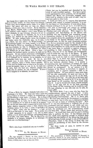 TE WAKA MAORI O NIU TIRANI. 81 Kei hanga koe e ngaro ana, kao, he hukore ki tenei mahi ki te tuku korero, he kore kaore ona tikanga ; a waiho mau, ma te tangata mohio, kaha, ki te whaki korero ; hei panui atu ahau me tera atu Maori, Pakeha, e titiro ana—ara, i o korero. Ko te whakahe a nga Maori, Pakeha hoki, e ahua tautohetohe nei ratou, ahakoa i waho ahakoa i roto i taua Whare, ta ratou whakahe ki nga hokonga whenua e iri nei ki runga i a te Makarini te whakahe, ha, ko ia ra te tangata nui, ahakoa na nga mema katoa, ko ia te Minita. Ki taku mahara waiho ratou kia whakahe ana waiho ratou kia whakatika ana; no te mea, e hoa e Mohi, kei roto ratou i te Whare kotahi, i te Kawanatanga kotahi, i te mana kotahi, i a te Kuini. Me he mea no Wiwi, no Amerika, no Puruhia ranei, nga hoa whakahe ka tika to whakahe i nga tangata whakahe mo te hoko whenua, e whakahe nei ratou ki te Minita mo te taha Maori. Otira e hara i te whakahe, he hurihuri marire na ratou, he mahi na te Paremete. Ki tau mahara hoki kaua e whakahekia ? Ki taku, ko nga kupu nunui enei o roto i taua Whare, ko te whakaari, ko te tautoko, ko te whakahe, ko te whakatika—koia tena ona mahi. Ki tau ia, me tahatahi tonu te moe; kaua e huri ki tetahi taha, kaua e wharoro, kaua e tiraha, kaua e pepeke. Ki te mea iana ka tiraha tonu ao noa te ra, ka mate ; ki te mea ka pepeke tonu ao noa te ra, ka mate ano. Eli taku, huri atu huri mai, wharoro, pepeke ake, tiraha ake, ka awatea, ka ora te tangata. E kore e ora te tangata ki te tahatahi, ka mate ano. E hoa, e Mohi, he tangata whakahe hoki ahau i te timatanga o te hoko. He kupu ano taku i puta kia kaua e hokoa te whenua i runga i te whakaaringa a nga Komihana o tera mahi, o te hoko. Ko te kupa hoki tena a Hare Reweti:—" I tonoa mai maua e te Kawanatanga ki te hoko, ki te reti; kei a koutou ano te whakaaro ki te hoko ki te reti, ki te pupuri." Na, me he mea kaua etahi e pupuri, hei te hoko katoa katoa, ahakoa rangatira tutua, e whai whenua ana, whakaae katoa ki te hoko, e kore te kai-hoko e ki mai:—"Kati; waiho ena mo koutou;" e hari ra hoki ia te kai-hoko ki tona mahi. Na te mohio ano o etahi rangatira ki te pupuri i ora ake ai tenei takiwa o to te Arawa pihi whenua ; mei porangi katoa ki te hoko, kua mate katoa. Na, he aha te he o te whakahe a te tangata whakahe ki te hokonga o te motu nei e te Kawanatanga ? Kati o aku kupu whakahoki atu mo to mohio. Na to hoa, NA WI MATENE TE HUAKI. Ko nga tangata o Perini, te tino taone nui o Puruhia, hui katoa, ka iwa rau e ono te kau ma wha mano, e whitu rau e ono te kau ma rima. Christ, lest you be troubled and disturbed by the study of such (worldly) matters. Tou have a great work appointed for you to perform; for all ministers, Pakeha and Maori, are continually engaged upon their work in relation to the souls of men ; they do not turn aside to other work. I would not have you to suppose that ignorance prevails with \_ regard to matters (political) ; it is not so, but there is a disinclination to write about them, because nothing is to be got by it; it is left for you —the man of knowledge and energy—to enlarge upon these things, while I and other Maoris and Pakehas read your effusions. . With respect to the complaints and fault-finding of the Maoris and Pakehas who are disputing and wrangling among themselves, whether in the House or out of it. and who complain about the purchasing of lands and lay the blame on Sir Donald McLean,—well, he is the principal man; he fills the most prominent position (i.e., he is a prominent mark for the attacks of all), although perhaps the (things complained of are the) acts of the members as a body, yet he is the Minister. I say, leave them to condemn or approve measures according to their judgment; because, my friend Mohi, they are all in one House, one Government, and all under the one rule of the Queen. If those who censure were French, or Americans, or Prus- sians, you would be right in your condemnation of them—that is, of those who object to purchasing land, and lay the blame on the Native Minister. It is not, however, absolute blame; it is merely a searching into and ventilation of matters, the usual practice of the Parliament. Do you think nothing should be condemned? In my opinion it is the business of the House to introduce, to support, to condemn, and to approve measures — that is its regular business. In your opinion a man must sleep on one side continually; he must not turn on the other side, nor stretch his legs, nor lie on his back, nor draw up his legs. If a man lay on his back only till morning came, he would be ill; if he lay with his legs drawn up till morning, that also would make him ill. I say he should turn about, stretch himself, draw up his legs, and lie on his back, according to his desire, till the morning, and he would be well. No man adhering to one side only can be safe, he must suffer. My friend Mohi, I ana a man who has, from the commencement, opposed the sale of land. I have spoken against selling land as desired by the Land Purchasing Commissioners. Mr. C. O. Davis said, "We have been sent by the Government to purchase or lease land; but it is for you to determine whether you will sell or lease, or withhold, the land." Now if no one had determined to withhold, but all who possessed land had agreed to sell, chiefs and com- moners indiscriminately, if all had been willing to sell, the purchaser (i.e., the Commissioner) would not have said, " Hold; retain that portion for your- selves :" he would have been\_only too glad to be thus able to perform his duty. It was because some of the chiefs were sagacious enough to withhold their lands that this district of the Arawa has been saved. If all had been foolish enough to sell, all had suffered. Therefore, where is the wrong of those who con- demn the purchasing of this island by the Govern- ment? Let these words of mine, in answer to your wisdom, suffice. Prom your friend, WI MATENE TE HUAKI. The population of Berlin (capital