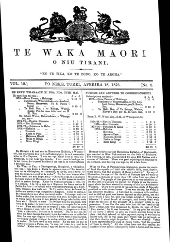 Te Waka Maori o Niu Tirani 1871-1877: Volume 12b, Number 8. 18 April 1876 |