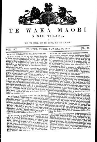 Te Waka Maori o Niu Tirani 1871-1877: Volume 13, Number 23. 30 November 1875 |