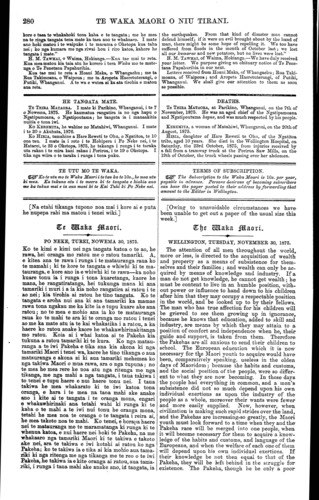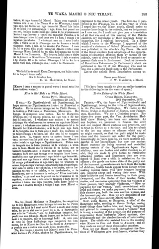 TE WAKA MAORI O NIU TIRANI. 281 tangata Ka kore e rite to ratou mohio i reira ai ki to te Pakeha, ka mahue ratou ki muri i te tauwhainga late oranga. Ahakoa he kai mahi, he rawakore, te Pakeha, e kinitia ana he oranga mona kia toe ai tetahi mea rawa hei utu mo te whakaakoranga o nga tama- riki kua homai e te Atua ki a ia kia tiakina e ia E mea ana kati ko ia ko te matua kia noho kuare ko tona tamaiti me kokiri ki runga ki te matauranga—a kua mohio ia akuanei ka tau ki runga ki a ia, ki te matua, tetahi wahi o te rangatiratanga o tona tamaiti i mua ai e whai aua te tangata ki te rongo toa taua hei nui mona i roto i nga iwi; otira kua rongo kou- tou ki te whakatauki: —" He toa pahekeheke te toa taua; e kore e paheke te toa mahi kai. " Na, e hara enei korero i te mea e tau ana ki runga ki te mahi a te tangata noaiho anake; e tau nui ana ano ki runga ki nga iwi katoa o te ao, ki runga ki ana mahi a i tenei takiwa e whai aua nga iwi rangatira me nga iwi kuare katoa o te ao, te iti me te rahi, ki nga mahi o te matauranga, o te tohungatanga, hei nui mo ratou, hei whakawhairawatanga. A, me titiro tatou ki konei ki Niu Tirani nei ano ka kite ai tatou i nga tohu o taua hiahia. No konei te Kawanatanga i hiahia ai kia tu nga kura (Pakeha, Maori hoki) puta noa ki nga wahi katoa o te motu hei akoranga tamariki, kia kotahi ai matauranga o te Pakeha o te Maori, kia mahi tahi ai raua i nga mahi hei tika mo te motu nei. No konei i ki ai te Kawanatanga kia hoatu he moni M nga hunga o tenei motu e kitea nuitia ana tona tohungatanga ki runga ki nga mahi e nui ai te motu ara, he haro pai i te muka, he whatu kahu ki te muka, he hanga pukapuka tuhituhi, he tahu rino ki te onepu, me era atu tini mahi hei taki mai i te rawa ki uta nei. No konei ano hoki te Kawanatanga i wha- kahau ai kia mahia nga rerewe mo nga rori hei wha- katuwhera i te motu katoa kia taea ai te kawe mai i nga rawa o te whenua ki waho ki nga tunga kaipuke, hei taki mai i te moni ki tenei motu hei nui mo tatou. Ko te rerewe rawa te matua o nga tohungatanga katoa; ma reira ka tuwhera nga mahi katoa kia wha- kataua e te tangata, ka ai hoki he huanui mo ana rawa, ka whai putanga mo ana whakaaro. He nui nga mahi kua timata te whakatau ki Niu Tirani inai- anei—e kore e taea te tatau. E ai ki ta matou i ki ai i tetahi nupepa i mua ra, ara ko nga tikanga enei mana te tangata e whakanui; mana te haerenga o te poaka raua ko te weka e whakapai hei nohoanga tangata, hei tupuranga kai; inana e whakamahi i te tangata rawakore, kore mahi; inana e whangai te pouaru me te pani; maua e hipoki te marietanga ki runga ki te whenua; mana e homai te oranga me te whakawatanga noatanga atu. HE RETA KI A TE KAWANA. Ko tenei reta kua homai ki a matou kia taia atu ki roto ki te Waka, ara: — Ngarongotea, Hokianga, Oketopa 1, 1875. E HOA, e te Kawana, Tena ra ko koe. He reta whakaatu atu tenei naku M a koe i te matenga o tetahi rangatira kaumatua o te Rarawa, ara o Wiremu Tana Papahia; i mate ia i te 5 o nga ra o Hepetema, 1875, i te 11 haora i te po. I a ia e ora aua ano ka tae a te Manene kia kite i a, ia; ka puta mai tana kupu ki a te Manene, " E hoa, ko koe hei matua mo aku tamariki; mau ratou e ako, ko koe hei matua mo ratou i muri i au. " Ka mea mai a te Manene ki a ia, " E whakarongo ranei ratou ki taku kupu, ki ta te Pakeha?" Ka mea atu ia, " Kia kaha koe ki te ako i a ratou. " Katahi ka wha- kaae mai a te Manene ki te kupu a Wiremu ki a ia. labourer, will seek to educate his children; he will even deny himself of some of the necessaries of life that he may have the means of providing instruction for the children whom God has intrusted to his care. Though he be himself an uneducated man, he is anxious that his child should be advanced in learning, and he feels that a portion of the honor attained by his child is reflected upon himself. In the days of old men looked for honor among the tribes in their repu- tation for bravery in the battle-field; but you know the proverb, " The fame of a warrior is fleeting, but the fame of a cultivator of food is enduring. " These observations are applicable not merely to individual cases, but to all peoples and nations throughout the world; and, at the present time, all nations every- where, high and low, civilized and uncivilized, are eagerly seeking after knowledge to increase their prosperity and wealth. Let us look around us here in New Zealand, and we shall see on all sides the evidences of this desire. For this reason the Govern- ment is anxious to establish schools, both English and Maori, throughout the land for the education of the young, that Pakeha and Maori may stand on one platform of knowledge, and both unite their energies for the general welfare of the colony. For this reason the Government have at various times offered rewards for the encouragement of any industries tending to benefit the country, such as the cultivation and preparation of flax, the weaving of flaxen cloths, the manufacture of paper, the smelting of iron from sand, and a variety of other matters productive of wealth. For this reason the Government has under- taken the construction of roads and railways to open up the country, and to enable the productions of the interior to be brought to the shipping ports for the purpose of bringing wealth into the colony. The rail- way is oue of the greatest triumphs of engineering skill; there is hardly au end to the avenues of in- dustry which it opens up; it provides a cheap con- veyance for goods and productions of every kind, and it enables man to put forth his energies and intelli- gence in every direction. Numerous new industries are being commenced in New Zealand, too numerous to particularize. As we remarked in a previous issue, it is by such means as these that we shall be- come great and prosperous, that we shall convert the haunts of the wood-hen and the wild boar into habitations of men, and cultivations of food, that we shall give employment to the unemployed, that we shall feed the widow a