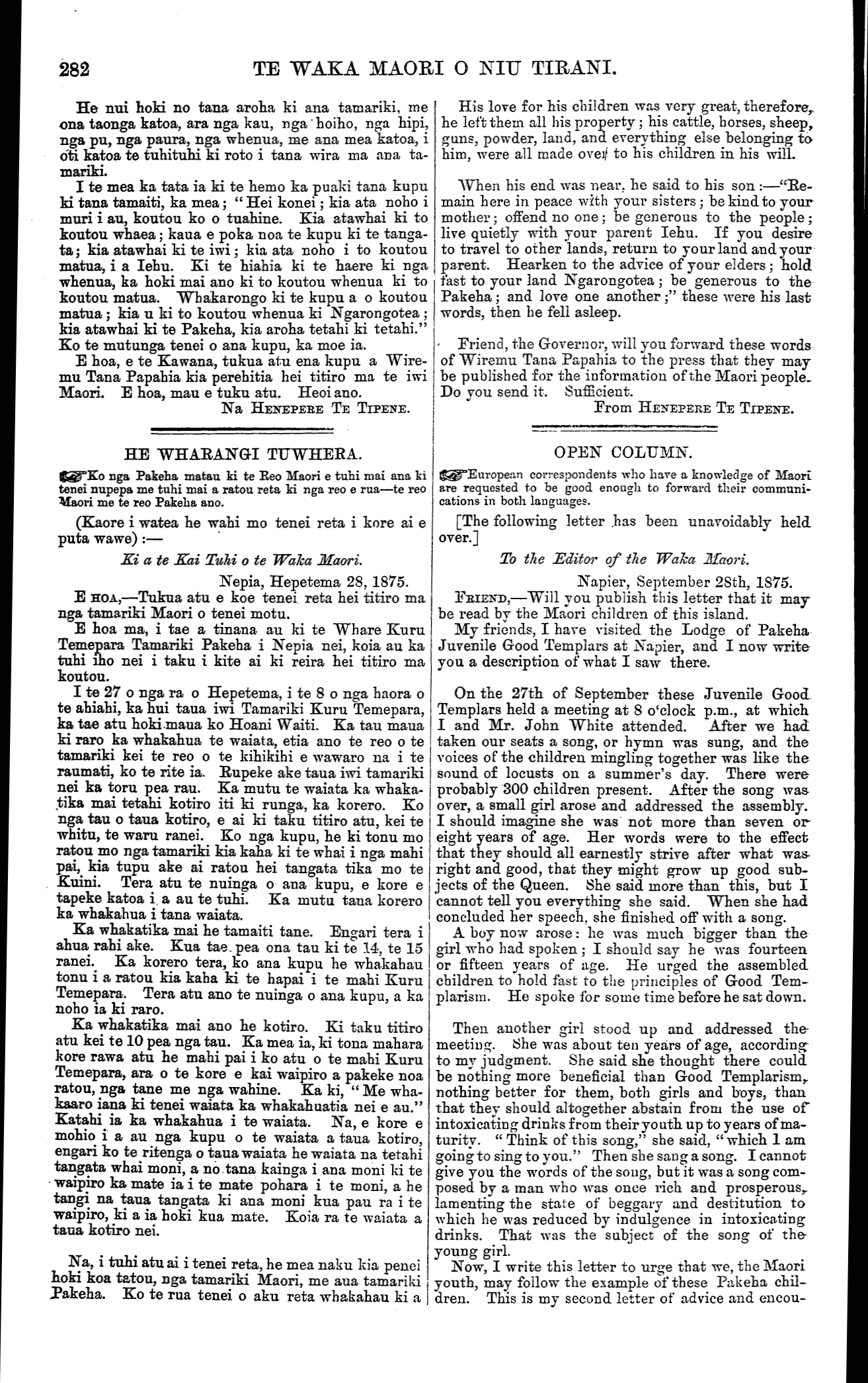 282 TE WAKA MAORI O NIU TIRANI. He nui hoki no tana aroha ki ana tamariki, me ona taonga katoa, ara nga kau, nga "hoiho, nga hipi, nga pu, nga paura, nga whenua, me ana mea katoa, i oti katoa te tuhituhi ki roto i tana wira ma ana ta- mariki. I te mea ka tata ia ki te hemo ka puaki tana kupu ki tana tamaiti, ka mea; " Hei konei; kia ata noho i muri i au, koutou ko o tuahine. Kia atawhai ki to koutou whaea; kaua e poka noa te kupu ki te tanga- ta; kia atawhai ki te iwi; kia ata noho i to koutou matua, i a lehu. Ki te hiahia ki te haere ki nga whenua, ka hoki mai ano ki to koutou whenua ki to koutou matua. Whakarongo ki te kupu a o koutou matua; kia u ki to koutou whenua ki Ngarongotea; kia atawhai ki te Pakeha, kia aroha tetahi ki tetahi. " Ko te mutunga tenei o ana kupu, ka moe ia. E hoa, e te Kawana, tukua atu ena kupu a Wire- mu Tana Papahia kia perehitia hei titiro ma te iwi Maori. E hoa, mau e tuku atu. Heoi ano. Na HENEPERE TE TIPENE. HE WHARANGI TUWHERA. Ko nga Pakeha matau ki te Reo Maori e tuhi mai ana ki tenei nupepa me tuhi mai a ratou reta ki nga reo e rua—te reo Maori me te reo Pakeha ano. (Kaore i watea he wahi mo tenei reta i kore ai e puta wawe): — Ki a te Kai Tuhi o te Waka Maori. Nepia, Hepetema 28, 1875. E HOA, —Tukua atu e koe tenei reta hei titiro ma nga tamariki Maori o tenei motu. E hoa ma, i tae a tinana au ki te Whare Kuru Temepara Tamariki Pakeha i Nepia nei, koia au ka tuhi iho nei i taku i kite ai ki reira hei titiro ma koutou. I te 27 o nga ra o Hepetema, i te 8 o nga haora o te ahiahi, ka hui taua iwi Tamariki Kuru Temepara, ka tae atu hoki. maua ko Hoani Waiti. Ka tau maua ki raro ka whakahua te waiata, etia ano te reo o te tamariki kei te reo o te kihikihi e wawaro na i te raumati, ko te rite ia. Rupeke ake taua iwi tamariki nei ka toru pea rau. Ka mutu te waiata ka whaka- tika mai tetahi kotiro iti ki runga, ka korero. Ko nga tau o taua kotiro, e ai ki taku titiro atu, kei te whitu, te waru ranei. Ko nga kupu, he ki tonu mo ratou mo nga tamariki kia kaha ki te whai i nga mahi pai, kia tupu ake ai ratou hei tangata tika mo te Kuini. Tera atu te nuinga o ana kupu, e kore e tapeke katoa i a au te tuhi. Ka mutu taua korero ka whakahua i tana waiata. Ka whakatika mai he tamaiti tane. Engari tera i ahua rahi ake. Kua tae. pea ona tau ki te 14, te 15 ranei. Ka korero tera, ko ana kupu he whakahau tonu i a ratou kia kaha ki te hapai i te mahi Kuru Temepara. Tera atu ano te nuinga o ana kupu, a ka noho ia ki raro. Ka whakatika mai ano he kotiro. Ki taku titiro atu kei te 10 pea nga tau. Ka mea ia, ki tona mahara kore rawa atu he mahi pai i ko atu o te mahi Kuru Temepara, ara o te kore e kai waipiro a pakeke noa ratou, nga tane me nga wahine. Ka ki, " Me wha- kaaro iana ki tenei waiata ka whakahuatia nei e au. " Katahi ia ka whakahua i te waiata. Na, e kore e mohio i a au nga kupu o te waiata a taua kotiro, engari ko te ritenga o taua waiata he waiata na tetahi tangata whai moni, a no tana kainga i ana moni ki te waipiro ka mate ia i te mate pohara i te moni, a he tangi na taua tangata ki ana moni kua pau ra i te waipiro, ki a ia hoki kua mate. Koia ra te waiata a taua kotiro nei. Na, i tuhi atu ai i tenei reta, he mea naku kia penei hoki koa tatou, nga tamariki Maori, me aua tamariki Pakeha. Ko te rua tenei o aku reta whakahau ki a His love for his children was very great, therefore, he left them all his property; his cattle, horses, sheep, guns, powder, land, ana everything else belonging to him, were all made over to his children in his will. When his end was near, he said to his son: —"Re- main here in peace with your sisters; be kind to your mother; offend no one; be generous to the people; live quietly with your parent lehu. If you desire to travel to other lands, return to your land and your parent. Hearken to the advice of your elders; hold fast to your land Ngarongotea; be generous to the Pakeha; and love one another; " these were his last words, then he fell asleep. Friend, the Governor, will you forward these words of Wiremu Tana Papahia to the press that they may be published for the information of the Maori people. Do you send it. Sufficient. From HENEPERE TE TIPENE. OPEN COLUMN. European correspondents who have a knowledge of Maori are requested to be good enough to forward their communi- cations in both languages. [The following letter has been unavoidably held over. ] To the Editor of the Waka Maori. Napier, September 28th, 1875. FRIEND, —Will you publish this letter that it may- be read by the Maori children of this island. My friends, I have visited the Lodge of Pakeha Juvenile Good Templars at Napier, and I now write you a description of what I saw there. On the 27th of September these Juvenile Good Templars held a meeting at 8 o'clock p. m., at which I and Mr. John White attended. After we had taken our seats a song, or hymn was sung, and the voices of the children mingling together was like the sound of locusts on a summer's day. There were probably 300 children present. After the song was over, a small girl arose and addressed the assembly. I should imagine she was not more than seven or eight years of age. Her words were to the effect that they should all earnestly strive after what was- right and good, that they might grow up good sub- jects of the Queen. She said more than this, but I cannot tell you everything she said. When she had concluded her speech, she finished off with a song. A boy now arose: he was much bigger than the girl who had spoken; I should say he was fourteen or fifteen years of age. He urged the assembled children to hold fast to the principles of Good Tem- plarism. He spoke for some time before he sat down. Then another girl stood up and addressed the meeting. She was about ten years of age, according to my judgment. She said she thought there could be nothing more beneficial than Good Templarism, nothing better for them, both girls and boys, than that they should altogether abstain from the use of intoxicating