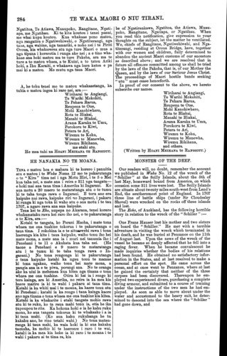 284 TE WAKA MAORI O NIU TIRANI. Ngatitoa, Te Atiawa, Muaupoko, Rangitane, Ngati- apa, me Ngatihau. Ki te kite koutou i tenei panui, me whai kupu koutou. Kua whakaae pono matou, nga rangatira o Ngatiwehiwehi, o Ngatiterangi, nga tane, nga Wahine, nga tamariki, e noho nei i te Piriti Oroua, kia whakarerea atu nga ture Maori o mua a nga tipuna i korerotia i runga ake nei; a e tino wha- kaae ana hoki matou ma te ture Pakeha, ara ma te ture a to matou whaea, a te Kuini, a to tatou Ariki hoki, a Ihu Karaiti, e whakawa nga hara katoa e pa mai ki a matou. Me mutu nga taua Maori. A, he tohu tenei mo to matou whakaaetanga, ka tuhia o matou ingoa ki raro nei, ara:— Wiriharai te Angiangi, Te Warihi Mokohiti, Te Pehara Rarua, Reupena te One, Mohi Kanohiwhero, Rota te Hiakai, Manahi te Hiakai, Arama Karaka te Umu, Porokoru te Kiwi, Petera te Ari, Wiremu te Kohu, Wiremu te' Manewha, Wiremu Rikihana, me etahi atu. He mea tuhi na HOANI MEIHANA TE RANGIOTTJ. HE NANAKIA NO TE MOANA. TENA o matou hoa e mahara ki te korero i panuitia atu e matou i te Waka Nama 12 mo te pakarutanga o te " Kira " tima nei i nga Motu Hiri, i te 5 o Mei kua taha nei, a mate ana i reira e 311 nga tangata— e hoki mai ana taua tima i Amerika ki Ingarani. Ko aua motu a 20 maero te mataratanga atu o te tumu ki te taha tonga rawa o Ingarani. E toru ano era kaipuke nui rawa, kaipuke riri no Ingarani, i pakaru ki runga ki nga toka ki waho atu o aua motu i te tau 1707, a ngaro rawa ana aua kaipuke. Tena kei te Eko, nupepa no Akarana, tenei korero whakamataku rawa kei raro iho nei, o te pakarutanga o te Kira, ara:— Kotahi te tangata, ko Parani Haoha, i mate tona whaea me ona tuahine tokorua i te pakarutanga o taua tima. I rokohina ia e te aitu«*wehi rawa i tona haerenga kia kite i taua kaipuke, waiho tonu iho hei mate mona, a mate ana ia i muri nei tanumia iho i Penehani i te 11 o Akuhata kua taha nei. (He taone a Penehani e 9 maero te mataratanga atu i te tumu ki te taha tonga rawa o In- garani.) No tona rongonga ki te pakarutanga o taua kaipuke katahi ka ngau tonu te mamae ki tona ngakau, waiho tonu hei mate mona, a pangia ana ia e te piwa, porangi ana. No te oranga ake ka uiui ia mehemea kua kitea nga tinana o tona whaea me ona tuahine. Otira ki hai ia i rongo ki tera kainga, ara ki Amerika, no reira ia ka mea kia haere marire ia ki te wahi i pakaru ai taua tima. Katahi ia ka whiti mai i te moana, ka haere tonu atu ki Penehani; katahi ia ka rongo i taua kainga kaore ano nga tinana o tona whaea me ona tuahine kia kitea. Katahi ia ka whakarite i etahi tangata mohio rawa atu ki te ruku, ko ta raua mahi tonu ia, etia he ika tupoupou te rite. Ka hokona hoki e ia he kahu ruku mona, ko aua tangata tokorua ki te whakaako i a ia ki taua mahi. (Ko aua kahu rukuhanga he tu kakahu ano, he rino tetahi wahi.) No tona matau- ranga ki taua mahi, ka waia hoki ia ki aua kakahu taimaha, ka mohio ki te haereere i raro i te wai, katahi ia ka mea kia heke ia ki raro i te moana i te wahi i pakaru ai te tima ra, kia be of Ngatiraukawa, Ngatitoa, the Atiawa, Muau- poko, Rangitane, Ngatiapa, or Ngatihau. When you read this notification, give expression to your thoughts on the subject, let the matter be ventilated. We, chiefs of Rangitane, Ngati wehiwehi, and Nga- titerangi, residing at Oroua Bridge, have, together with our women and children, fully determined to abandon the ancient Maori customs of our ancestors as described aboye; and we are resolved that in future all offences committed among us shall be tried by the laws of the Pakeha, that is, of our Mother the Queen, and by the laws of our Saviour Jesus Christ. The proceedings of Maori hostile bands seeking " utu " must cease henceforth. In proof of our consent to the above, we hereto subscribe our names. Wiriharai te Angiangi, Te Warihi Mokohiti, Te Pehara Rarua, Reupena te One, Mohi Kanohiwhero, Rota te Hiakai, Manahi te Hiakai, Arama Karaka te Umu, Porokoru te Kiwi, Petera te Ari, Wiremu te Kohu, Wiremu te Manewha, Wiremu Rikihana, and others. (Written by HOANI MEIHANA, te RANGIOTTT.) MONSTER OF THE DEEP. Our readers will, no doubt, remember the account we published in Waka No. 12 of the wreck of the " Schiller" at the Scilly Islands, about the 5th of last May, homeward bound from America, on which occasion some 311 lives were lost. The Scilly Islands are situate about twenty miles south-west from Land's End, the southernmost point of England. In 1707 three line of battle ships (under Sir Cloudesley Shovel) were wrecked on the rocks off these islands and lost. The Echo, of Auckland, has the following horrible story in relation to the wreck of the " Schiller ":— One Franz Hauser lost his mother and two sisters on board the " Schiller." He met with a terrible adventure in visiting the wreck which terminated in his death, and he was buried at Penzance on the llth of August last. Upon the news of the wreck of the vessel he became so deeply affected that he fell into a raging fever. When he became convalescent he made inquiries whether the bodies of his relations had been found. He obtained no satisfactory infor- mation in the States, and at last resolved to make a personal effort on the spot. He came across the ocean, and at once went to Penzance, where at last he gained the certainty that neither of the three corpses had been discovered. Thereupon he em- ployed two experienced divers, purchasing a complete diving armour, and submitted to a course of training under the instructions of the two men he had em- ployed. As soon as able to move about under the water and accustomed to the heavy suit, he deter- mined to descend into the sea where the " Schiller " had gone down, and