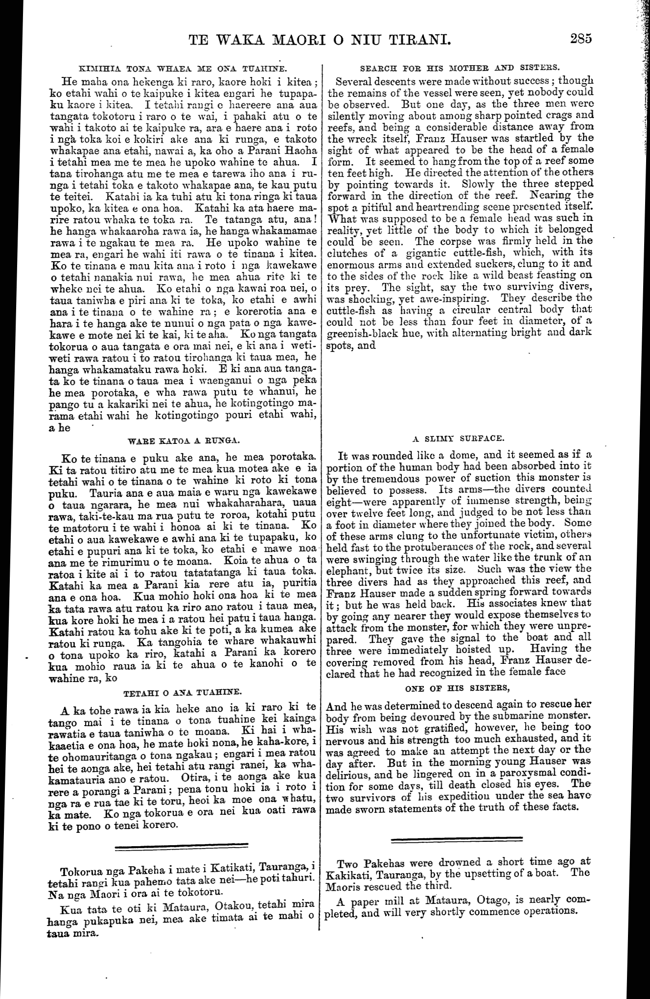 TE WAKA MAORI O NIU TIRANI. 285 KIMIHIA. TONA WHAEA ME ONA TUAHINE. He maha ona hekenga ki raro, kaore hoki i kitea • ko etahi wahi o te kaipuke i kitea engari he tupapa- ku kaore i kitea. I tetahi rangi e haereere ana aua tangata tokotoru i raro o te wai, i pahaki atu o te wahi i takoto ai te kaipuke ra, ara e haere ana i roto i nga, toka koi e kokiri ake aua ki runga, e takoto whakapae ana etahi, nawai a, ka oho a Parani Haoha i tetahi mea me te mea he upoko wahine te ahua. I tana tirohanga atu me te mea e tarewa iho ana i ru- nga i tetahi toka e takoto whakapae ana, te kau putu te teitei. Katahi ia ka tuhi atu ki tona ringa ki taua upoko, ka kitea e ona hoa. Katahi ka ata haere ma- rire ratou whaka te toka ra. Te tatanga atu, ana! he hanga whakaaroha rawa ia, he hanga whakamamae rawa i te ngakau te mea ra. He upoko wahine te mea ra, engari he wahi iti rawa o te tinana i kitea. Ko te tinana e mau kita ana i roto i nga kawekawe o tetahi nanakia nui rawa, he mea ahua rito ki te wheke nei te ahua. Ko etahi o nga kawai roa nei, o taua taniwha e piri ana ki te toka, ko etahi e awhi ana i te tinana o te wahine ra; e korerotia ana e hara i te hanga ake te nunui o nga pata o nga kawe- kawe e mote nei ki te kai, ki te aha. Ko nga tangata tokorua o aua tangata e ora mai nei, e ki ana i weti- weti rawa ratou i to ratou tirohanga ki taua mea, he hanga whakamataku rawa hoki. E ki ana aua tanga- ta ko te tinana o taua mea i waenganui o nga peka he mea porotaka, e wha rawa putu te whanui, he pango tu a kakariki nei te ahua, he kotingotingo ma- rama etahi wahi he kotingotingo pouri etahi wahi, a he WARE KATOA A RUNGA. Ko te tinana e puku ake ana, he mea porotaka. Ki ta ratou titiro atu me te mea kua motea ake e ia tetahi wahi o te tinana o te wahine ki roto ki tona puku. Tauria ana e aua maia e waru nga kawekawe o taua ngarara, he mea nui whakaharahara, uaua rawa, taki-te-kau ma rua putu te roroa, kotahi putu te matotoru i te wahi i honoa ai ki te tinana. Ko etahi o aua kawekawe e awhi ana ki te tupapaku, ko etahi e pupuri ana ki te toka, ko etahi e mawe noa ana me te rimurimu o te moana. Koia te ahua o ta ratoa i kite ai i to ratou tatatatanga ki taua toka. Katahi ka mea a Parani kia rere atu ia, puritia ana e ona hoa. Kua mohio hoki ona hoa ki te mea ia tata rawa atu ratou ka riro ano ratou i taua mea, tua kore hoki he mea i a ratou hei patu i taua hanga. Katahi ratou ka tohu ake ki te poti, a ka kumea ake ratou ki runga. Ka tangohia te whare whakauwhi o tona upoko ka riro, katahi a Parani ka korero kua mohio raua ia ki te ahua o te kanohi o te wahine ra, ko TETAHI O ANA TUAHINE. A ka tohe rawa ia kia heke ano ia ki raro ki te tango mai i te tinana o tona tuahine kei kainga rawatia e taua taniwha o te moana. Ki hai i wha- kaaetia e ona hoa, he mate hoki nona, he kaha-kore, i te ohomauritanga o tona ngakau; engari i mea ratou hei te aonga ake, hei tetahi atu rangi ranei, ka wha- kamatauria ano e ratou. Otira, i te aonga ake kua rere a porangi a Parani; pena tonu hoki ia i roto i nga ra e rua tae ki te toru, heoi ka moe ona whatu, ka mate. Ko nga tokorua e ora nei kua oati rawa ki te pono o tenei korero. Tokorua nga Pakeha i mate i Katikati, Tauranga, i tetahi rangi kua pahemo tata ake nei—he poti tahuri. Na nga Maori i ora ai te tokotoru. Kua tata te oti ki Mataura, Otakou, tetahi mira tanga pukapuka nei, mea ake timata ai te mahi o taua mira. SEARCH FOR HIS MOTHER AND SISTERS. Several descents were made without success; though the remains of the vessel were seen, yet nobody could be observed. But one day, as the three men wero silently moving about among sharp pointed crags and reefs, and being a considerable distance away from the wreck itself, Franz Hauser was startled by the sight of what appeared to be the head of a female form. It seemed to hang from the top of a reef some ten feet high. He directed the attention of the others by pointing towards it. Slowly the three stepped forward in the direction of the reef. Nearing the spot a pitiful and heartrending scene presented itself. What was supposed to be a female head was such in reality, yet little of the body to which it belonged could be seen. The corpse was firmly held in the clutches of a gigantic cuttle-fish, which, with its enormous arms and extended suckers, clung to it and to the sides of the rock like a wild beast feasting on its prey. The sight, say the two surviving divers, was shocking, yet awe-inspiring. They describe the cuttle-fish as having a circular central body that could not bo less than four feet in diameter, of a greenish-black hue, with alternating bright and dark spots, and A SLIMY SURFACE. It was rounded like a dome, and it seemed as if a portion of the human body had been absorbed into it by the tremendous power of suction this monster is believed to possess. Its arms—the divers counted eight—were apparently of immense strength, being over twelve feet long, and judged to be not less than a foot in diameter where they joined the body. Some of these arms clung to the unfortunate victim, others held fast to the protuberances of the rock, and several were swinging through the water like the trunk of an elephant, but twice its size. Such was the view the three divers had as they approached this reef, and Franz Hauser made a sudden spring forward towards it; but he was held back. His associates knew that by going any nearer they would expose themselves to attack from the monster, for which they were unpre- pared. They gave the signal to the boat and all three were immediately hoisted up. Having the covering removed from, his head, Franz Hauser de- clared that he had recognized in the female face ONE OP HIS SISTERS, And he was determined to descend again to rescue her body from being devoured by the submarine monster. His wish was not gratified, however, he being too nervous and his strength too much exhausted, and it was agreed to make au attempt the next day or the day after. But in the morning young Hauser was delir
