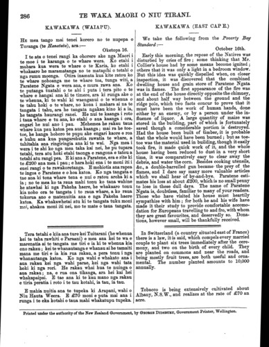 286 TE WAKA MAORI O NIU TIRANI. KAWAKAWA (WAIAPU). HE mea tango mai tenei korero no te nupepa o Taranga (te Hanatata), ara: — Oketopa 16. I te ata o tenei rangi ka ohorere ake nga Maori i te moe i te karanga o te whare wera. Ko etahi i mahara kua wera te whare o te Karia, ko etahi i whakaaro he maramatanga no te matapihi o tetahi o nga nunu moenga. Otira inamata kua kite ratou ko te whare nohoanga me te whare toa, tunga witi, a Paratene Ngata e wera ana, e mura rawa ana. Ko te putanga tuatahi o te ahi i puta i tera pito o te whare e hangai ana ki te timere, ara ki runga ake o te whenua, ki te wahi ki waenganui o te whenua o te tahu hoki o te whare, no kona i mahara ai na te tangata i tahu, ara he tangata ngakau kino ki a ia, he tangata haurangi ranei. He nui te kaanga i roto i taua whare e tu ana, ko etahi o aua kaanga i ora, engari he nui ano i pau. Mehemea be rakau taua whare kua pau katoa pea aua kaanga; mai ra he toe- toe, he hanga hohoro te pupu ake engari kaore e roa e huhu ana kua pungarehutia rawatia te whare, a tahitahia ana ringiringia ana ki te wai. Nga mea i wera i te ahi ko nga mea taka kai nei, he pu tupara tetahi, tera atu hoki etahi taonga e rangona e tatou a tetahi atu rangi pea. E ki ana a Paratene, era e rite ki te £200 ana mea i pau; e hara hoki ena i te moni iti i enei rangi o te rawakoretanga. E mohiotia ana rapea te ingoa o Paratene e o hoa katoa. Ko nga tangata e tae aua ki tona whare tena e nui o ratou aroha ki a ia; no te mea ko ta raua mahi tonu ko tana wahine he atawhai ki nga Pakeha haere, he whakaaro tonu kia noho ora te tangata i to raua whare, a ko raua tokorua ano e matenuitia ana e nga Pakeha haere katoa. Ka whakawhetai atu ki te tangata tuku moni mai, ahakoa moni iti nei, mo te mate o taua tangata. Tera tetahi e kiia ana ture kei Tuitarani (he whenua kei te taha rawhiti o Paraani) e mea ana kei te wa e marenatia ai te tangata me tiri e ia ki te whenua kia ono rakau; kei te whanautanga e whanau ai he tamaiti mana me tiri e ia kia rua rakau, a pera tonu i nga whanautanga katoa. Ko nga wahi e whakato ana i aua rakau kei nga wahi parae, kei nga wahi tata hoki ki nga rori. He rakau whai hua te nuinga o aua rakau; na, e rua ona tikanga, ara hei kai hei whakapaipai. E tae ana ki te kau mano nga rakau e tiria peratia i roto i te tau kotahi, ia tau, ia tau. E mahia nuitia ana te tupeka ki Arapani, wahi Niu Hauta Weera. E £70 moni e puta mai ana \_ runga i te eka kotahi o taua mahi whakatupu tupeka. KAWAKAWA. (EAST CAPE. ) We take the following from the Poverty Bay Standard: — October 16th. Early this morning, the repose of the Natives was disturbed by cries of fire; some thinking that Mr. Collier's house had by some means become ignited; others that it was only a light in a bedroom window. But this idea was quickly dispelled when, on closer inspection, it was discovered that the combined dwelling house and grain store of Paratene Ngata was in flames. The first appearance of the fire was at the end of the house directly opposite the chimney, and about half way between the ground and the ridge pole, which two facts concur to prove that it must have been the work of human hands, done either by an enemy, or by a person under the in- fluence of liquor. A large quantity of maize was stored in the building, part of which is fortunately saved though a considerable portion is destroyed. Had the house been built of timber, it is probable that the whole would have been burned; but as toe- toe was the material used in building, though it easily took fire, it made quick work of it, and the whole house having been reduced to dust in a very short time, it was comparatively easy to clear away the debris, and water the corn. Besides cooking utensils, &c., a double-barrelled gun became - the prey of the flames, and I dare say many more valuable articles which we shall hear of by-and-bye. Paratene esti- mates his loss at about £200, which is no small penny to lose in these dull days. The name of Paratene Ngata is, doubtless, familiar to many of your readers. Those who have visited his house must heartily sympathize with him; for both he and his wife have made it their study to provide comfortable accomo- dation for Europeans travelling to and fro, with whom they are great favourites, and deservedly so. Dona- tions, however small, will be thankfully received. In Switzerland (a country situated east of France) there is a law, it is said, which compels every married couple to plant six trees immediately after the cere- mony, and two on the birth of every child. They are planted on commons and near the roads, and being mostly fruit trees, are both useful and orna- mental. The number planted amounts to 10, 000 annually. Tobacco is being extensively cultivated about Albany, N. S. W., and realizes at the rate of £70 an acre. Printed under the authority of the New Zealand Government, by GEORGE DIDSBURY, Government Printer, Wellington.