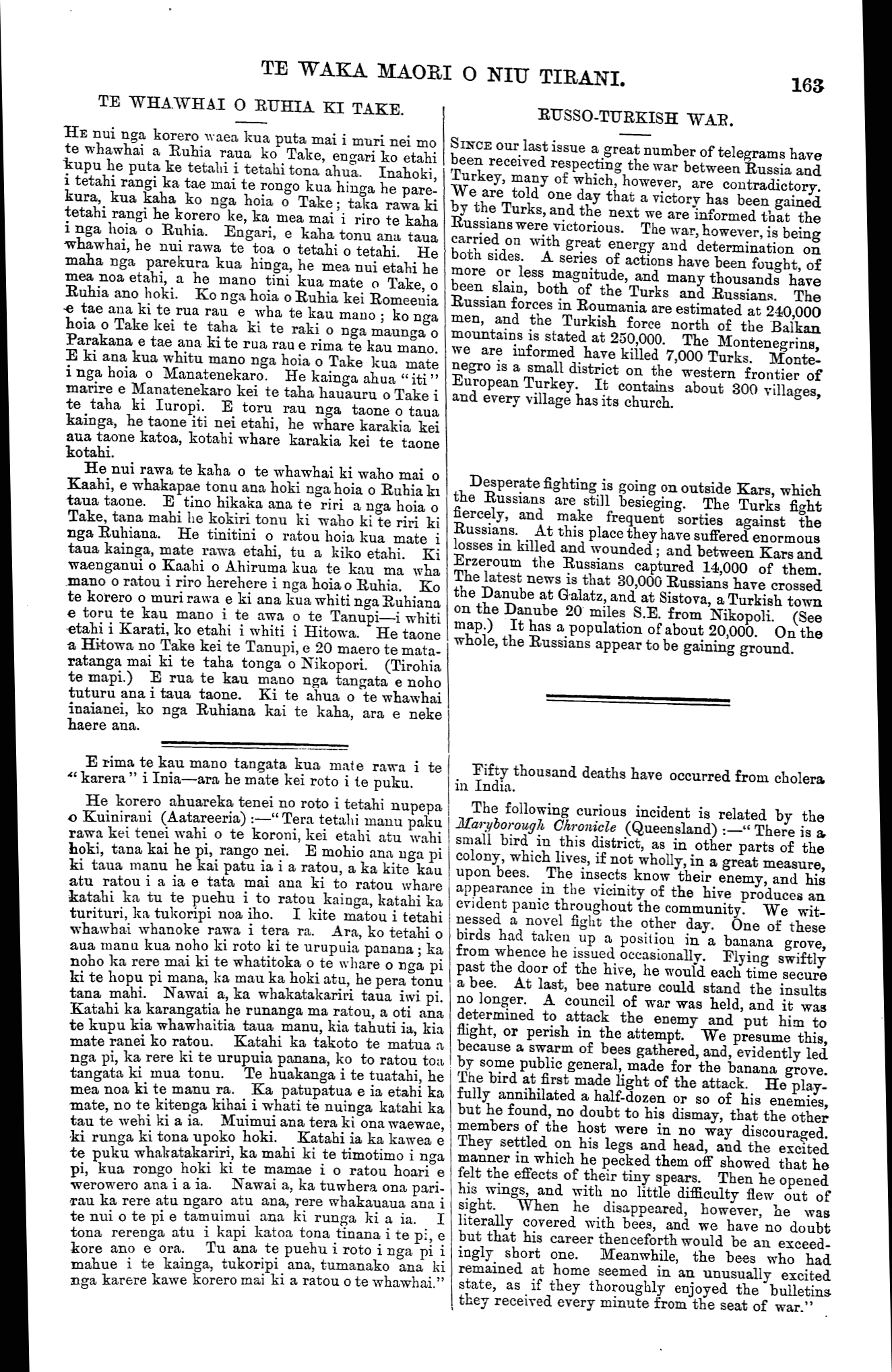 TE WAKA MAORI O NIU TIRANI. 163 TE WHAWHAI O RUHIA KI TAKE. HE nui nga korero waea kua puta mai i muri nei mo te whawhai a Ruhia raua ko Take, engari ko etahi tupu he puta ke tetahi i tetahi tona ahua. Inahoki, i tetahi rangi ka tae mai te rongo kua hinga he pare- kura, kua kaha ko nga hoia o Take; taka rawa ki tetahi rangi he korero ke, ka mea mai i riro te kaha i nga hoia o Ruhia. Engari, e kaha tonu ana taua whawhai, he nui rawa te toa o tetahi o tetahi. He maha nga parekura kua hinga, he mea nui etahi he mea noa etahi, a he mano tini kua mate o Take, o Ruhia ano hoki. Ko nga hoia o Ruhia kei Romeenia e tae aua ki te rua rau e wha te kau mano ; ko nga hoia o Take kei te taha ki te raki o nga maunga o Parakana e tae ana ki te rua rau e rima te kau mano. E ki ana kua whitu mano nga hoia o Take kua mate i nga hoia o Manatenekaro. He kainga ahua "iti" marire e Manatenekaro kei te taha hauauru o Take i te taha ki luropi. E toru rau nga taone o taua kainga, he taone iti nei etahi, he whare karakia kei aua taone katoa, kotahi whare karakia kei te taone kotahi. He nui rawa te kaha o te whawhai ki waho mai o Kaahi, e whakapae tonu ana hoki nga hoia o Ruhia ki taua taone. E tino hikaka ana te riri a nga hoia o Take, tana mahi he kokiri tonu ki waho ki te riri ki nga Ruhiana. He tinitini o ratou hoia kua mate i taua kainga, mate rawa etahi, tu a kiko etahi. Ki waenganui o Kaahi o Ahiruma kua te kau ma wha mano o ratou i riro herehere i nga hoia o Ruhia. Ko te korero o muri rawa e ki ana kua whiti nga Ruhiana e toru te kau mano i te awa o te Tanupi—i whiti •etahi i Karati, ko etahi i whiti i Hitowa. He taone a Hitowa no Take kei te Tanupi, e 20 maero te mata- ratanga mai ki te taha tonga o Nikopori. (Tirohia te mapi.) E rua te kau mano nga tangata e noho tuturu ana i taua taone. Ki te ahua o te whawhai inaianei, ko nga Ruhiana kai te kaha, ara e neke haere ana. E rima te kau mano tangata kua mate rawa i te " karera " i Inia—ara he mate kei roto i te puku. He korero ahuareka tenei no roto i tetahi nupepa o Kuinirani (Aatareeria) :—" Tera tetahi manu paku rawa kei tenei wahi o te koroni, kei etahi atu wahi hoki, tana kai he pi, rango nei. E mohio ana nga pi ki taua manu he kai patu ia i a ratou, a ka kite kau atu ratou i a ia e tata mai aua ki to ratou whare katahi ka tu te puehu i to ratou painga, katahi ka turituri, ka tukoripi noa iho. I kite matou i tetahi whawhai whanoke rawa i tera ra. Ara, ko tetahi o aua mana kua noho ki roto ki te urupuia panana; ka noho ka rere mai ki te whatitoka o te whare o nga pi ki te hopu pi mana, ka mau ka hoki ata, he pera tonu tana mahi. Nawai a, ka whakatakariri taua iwi pi. Katahi ka karangatia he runanga ma ratou, a oti ana te kupu kia whawhaitia taua manu, kia tahuti ia, kia mate ranei ko ratou. Katahi ka takoto te matua a nga pi, ka rere ki te urupuia panana, ko to ratou toa tangata ki mua tonu. Te huakanga i te tuatahi, he mea noa ki te manu ra. Ka patupatua e ia etahi ka mate, no te kitenga kihai i whati te nuinga katahi ka tau te wehi ki a ia. Muimui ana tera ki ona waewae, ki runga ki tona upoko hoki. Katahi ia ka kawea e te puku whakatakariri, ka mahi ki te timotimo i nga pi, kua rongo hoki ki te mamae i o ratou hoari e werowero ana i a ia. Nawai a, ka tuwhera ona pari- rau ka rere atu ngaro atu ana, rere whakauaua ana i te nui o te pi e tamuimui ana ki runga ki a ia. I tona rerenga atu i kapi katoa tona tinana i te pi, e kore ano e ora. Tu ana te puehu i roto i nga pi i mahue i te kainga, tukoripi ana, tumanako ana ki karere kawe korero mai ki a ratou o te whawhai." RUSSO-TURKISH WAR. SINCE our last issue a great number of telegrams have been received respecting the war between Russia and Turkey, many of which, however, are contradictory. We are told one day that a victory has been gained by the Turks, and the next we are "informed that the Russians were victorious. The war, however, is being carried on with great energy and determination on both sides. A series of actions have been fought, of more or less magnitude, and many thousands have been slain, both of the Turks and Russians. The Russian forces in Roumania are estimated at 240,000 men, and the Turkish force north of the Balkan mountains is stated at 250,000. The Montenegrins, we are informed have killed 7,000 Turks. Monte- negro is a small district on the western frontier of European Turkey. It contains about 300 villages, and every village has its church. Desperate fighting is going on outside Kars, which the Russians are still besieging. The Turks fight fiercely, and make frequent sorties against the Russians. At this place they have suffered enormous losses in killed and wounded; and between Kars and Erzeroum the Russians captured 14,000 of them. The latest news is that 30,000 Russians have crossed the Danube at Galatz, and at Sistova, a Turkish town on the Danube 20 miles S.E. from Nikopoli. (See map.) It has a population of about 20,000. On the whole, the Russians appear to be gaining ground. Fifty thousand deaths have occurred from cholera in India. The following curious incident is related by the Maryborough Chronicle (Queensland) :—" There is a small bird in this district, as in other parts of the colony, which lives, if not wholly, in a great measure, upon bees. The insects know their enemy, and his appearance in the vicinity of the hive produces an evident panic throughout the community. We wit- nessed a novel fight the other day. One of these birds had taken up a position in a banana grove, from whence he issued occasionally. Flying swiftly past the door of the hive, he would each time secure a bee. At last, bee nature could stand the insults no longer. A council of war was held, and it was determined to attack the enemy and put him to flight, or perish in the attempt. We presume this, because a swarm of bees gathered, and, evidently led by some public general, made for the banana grove. The bird at first made light of the attack. He play- fully annihilated a half-dozen or 