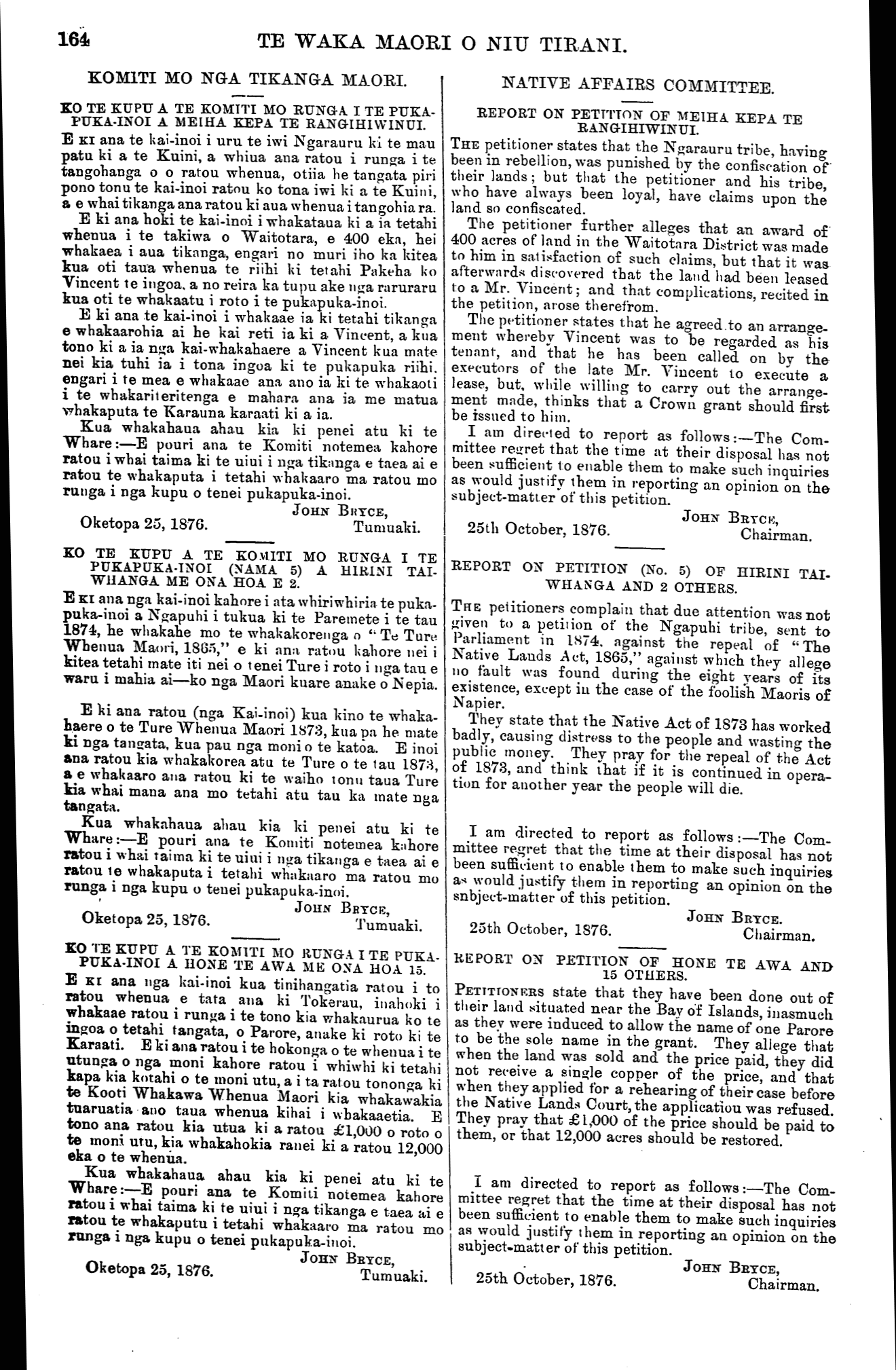 164 TE WAKA MAORI O NIU TIRANI. KOMITI MO NGA TIKANGA MAORI. KO TE KUPU A TE KOMITI MO RUNGA I TE PUKA- PUKA-INOI A MEIHA KEPA TE RANGIHIWINUI. E KI ana te kai-inoi i uru te iwi Ngarauru ki te mau patu ki a te Kuini, a whiua ana ratou i runga i te tangohanga o o ratou whenua, otiia he tangata piri pono tonu te kai-inoi ratou ko tona iwi ki a te Kuini, a e whai tikanga ana ratou ki aua whenua i tangohia ra. E ki ana hoki te kai-inoi i whakataua ki a ia tetahi whenua i te takiwa o Waitotara, e 400 eka, hei whakaea i aua tikanga, engari no muri iho ka kitea tua oti taua whenua te riihi ki tetahi Pakeha ko Vincent te ingoa, a no reira ka tupu ake nga raruraru kua oti te whakaatu i roto i te pukapuka-inoi. E ki ana te kai-inoi i whakaae ia ki tetahi tikanga e whakaarohia ai he kai reti ia ki a Vincent, a kua tono ki a ia nga kai-whakahaere a Vincent kua mate nei kia tuhi ia i tona ingoa ki te pukapuka riihi engari i te mea e whakaae ana ano ia ki te whakaoti i te whakariteritenga e mahara ana ia me matua whakaputa te Karauna karaati ki a ia. Kua whakahaua ahau kia ki penei atu ki te Whare:—E pouri ana te Komiti notemea kahore ratou i whai taima ki te uiui i nga tikanga e taea ai e ratou te whakaputa i tetahi whakaaro ma ratou mo runga i nga kupu o tenei pukapuka-inoi. JOHN BRYCE, Oketopa 25, 1876.Tumuaki. KO TE KUPU A TE KOMITI MO RUNGA I TE PUKAPUKA-INOI (NAMA 5) A HIRINI TAI- WHANGA ME ONA HOA E 2. E KI ana nga kai-inoi kahore i ata whiriwhiria te puka- puka-inoi a Ngapuhi i tukua ki te Paremete i te tau 1874, he whakahe mo te whakakorenga o " Te Ture Whenua Maori, 1865," e ki ana ratou kahore nei i kitea tetahi mate iti nei o tenei Ture i roto i nga tau e waru i mahia ai—ko nga Maori kuare anake o Nepia. E ki ana ratou (nga Kai-inoi) kua kino te whaka- haere o te Ture Whenua Maori 1873, kua pa he mate ki nga tangata, kua pau nga moni o te katoa. E inoi ana ratou kia whakakorea atu te Ture o te tau 1873, a e whakaaro ana ratou ki te waiho tonu taua Ture kia whai maua ana mo tetahi atu tau ka mate nga tangata. Kua whakahaua ahau kia ki penei atu ki te Whare:—E pouri ana te Komiti notemea kahore ratou i whai taima ki te uiui i nga tikanga e taea ai e ratou te whakaputa i tetahi whakaaro ma ratou mo runga i nga kupu o tenei pukapuka-inoi. JOHN BRYCE, Oketopa 25, 1876.Tumuaki. KO TE KUPU A TE KOMITI MO HUNGA I TE PUKA- PUKA-INOI A HONE TE AWA ME ONA HOA 15. E KI ana nga kai-inoi kua tinihangatia ratou i to ratou whenua e tata ana ki Tokerau, inahoki i whakaae ratou i runga i te tono kia whakaurua ko te ingoa o tetahi tangata, o Parore, anake ki roto ki te Karaati. E ki ana ratou i te hokonga o te whenua i te utunga o nga moni kahore ratou i whiwhi ki tetahi kapa kia kotahi o te moni utu, a i ta ratou tononga ki te Kooti Whakawa Whenua Maori kia whakawakia tuaruatia ano taua whenua kihai i whakaaetia. E tono ana ratou kia utua ki a ratou £1,000 o roto o te moni utu, kia whakahokia ranei ki a ratou 12,000 eka o te whenua. Kua whakahaua ahau kia ki penei atu ki te Whare:—E pouri ana te Komiti notemea kahore ratou i whai taima ki te uiui i nga tikanga e taea ai e ratou te whakaputu i tetahi whakaaro ma ratou mo runga i nga kupu o tenei pukapuka-inoi. JOHN BRYCE, Oketopa 25, 1876.Tumuaki. NATIVE AFFAIRS COMMITTEE. REPORT ON PETITION OF MEIHA KEPA TE RANGIHIWINUI. THE petitioner states that the Ngarauru tribe, having been in rebellion, was punished by the confiscation of their lands; but that the petitioner and his tribe, who have always been loyal, have claims upon the land so confiscated. The petitioner further alleges that an award of 400 acres of land in the Waitotara District was made to him in satisfaction of such claims, but that it was afterwards discovered that the land had been leased to a Mr. Vincent; and that complications, recited in the petition, arose therefrom. The petitioner states that he agreed to an arrange- ment whereby Vincent was to be regarded as his tenant, and that he has been called on by the executors of the late Mr. Vincent to execute a lease, but, while willing to carry out the arrange- ment made, thinks that a Crown grant should first be issued to him. I am directed to report as follows:—The Com- mittee regret that the time at their disposal has not been sufficient to enable them to make such inquiries as would justify them in reporting an opinion on the subject-matter of this petition. JOHN BRYCE, 25th October, 1876.Chairman. REPORT ON PETITION (No. 5) OF HIRINI TAI- WHANGA AND 2 OTHERS. THE petitioners complain that due attention was not given to a petition of the Ngapuhi tribe, sent to Parliament in 1S74. against the repeal of "The Native Lauds Act, 1865," against which they allege no fault was found during the eight years of its existence, except in the case of the foolish Maoris of Napier. They state that the Native Act of 1873 has worked badly, causing distress to the people and wasting the public money. They pray for the repeal of the Act of 1873, and think that if it is continued in opera- tion for another year the people will die. I am directed to report as follows :—The Com- mittee regret that the time at their disposal has not been sufficient to enable them to make such inquiries as would justify them in reporting an opinion on the subject-rnatter of this petition. JOHN BRYCE. 25th October, 1876.Chairman. REPORT ON PETITION OF HONE TE AWA AND 15 OTHERS. PETITIONERS state that they have been done out of their land situated near the Bay of Islands, inasmuch as they were induced to allow the name of one Parore to be the sole name in the grant. They allege that when the land was sold and the price paid, they did not receive a single copper of the price, and that when they applied for a rehearing of their case before the Native Lands Court, the application was refused. They pray that £1,000 of the price should be paid to them, or that 12,000 acres should be restored. I am directed to report as follows:—The Com- mittee regret that the time at their 