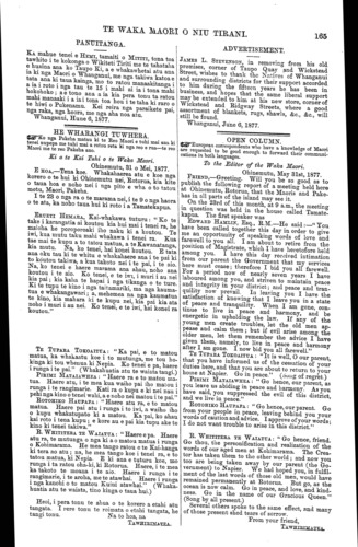 TE WAKA MAORI O NIU TIRANI. 165 PANUITANGA. KA mahue tenei e HEMI, tamaiti o MITITI, tona toa tawhito i te kokonga o Wikiteti Tiriti me te tahataha e huaina ana ko Taupo Ki, a e whakawhetai atu ana ia ki nga Maori o Whanganui, me nga takiwa katoa e tata ana ki taua kainga, mo to ratou manaakitanga i a ia i roto i nga tau te 15 i mahi ai ia i tona mahi hokohoko ; ae tono ana a ia kia pera tonu ta ratou mahi manaaki i a ia i tona toa hou i te taha ki raro o te hiwi o Pukenamu. Kei reira nga paraikete pai, nga raka, nga hoora, me nga aha noa atu. Whanganui, Hune 6, 1877. HE WHARANGI TUWHERA. Ko nga Pakeha matau ki te Reo Maori e tuhi mai ana ki tenei nupepa me tuhi mai a ratou reta ki nga reo e rua—te reo Maori me te reo Pakeha ano. Ki a te Kai Tuhi o te Waka Maori. Ohinemutu, 31 o Mei, 1877. E HOA,—Tena koe. Whakahaerea atu e koe nga korero o te hui ki Ohinemutu nei, Rotorua, kia kite o taua hoa e noho nei i nga pito e wha o to tatou motu, Maori, Pakeha. I te 23 o nga ra o te marama nei, i te 9 o nga haora o te ata, ka noho taua hui ki roto i a Tamatekapua. ERUETI HEMARA, Kai-whakawa tuturu: " Ko te take i karangatia ai koutou kia hui mai i tenei ra, he maioha he poroporoaki iho naku ki a koutou. Te iwi, kua mutu taku mahi whakawa i tenei ra. Kua tae mai te kupu a to tatou matua, a te Kawanatanga kia mutu. Na, ko tenei, hai konei koutou. E tata aua oku tau ki te whitu e whakahaere ana i te pai ki to koutou takiwa, a kua takoto nei i te pai, i te aio Na, ko tenei e haere marama ana ahau, noho ana koutou i te aio. Ko tenei, e te iwi, i muri i au ne kia pai; kia kaha te hapai i nga tikanga o te ture Ki te tupu te kino i nga taitamariki, ma nga kauma- tua e whakangawari; a, mehemea na nga kaumatua te kino, kia mahara ki te kupu nei, kia pai kia ata noho i muri i au nei. Ko tenei, e te iwi, hai konei ra koutou." TE TUPARA TOKOAITUA: "Ka pai, e to matou matua, ka whakaatu koe i to mutunga, me tou ho- kinga ki tou whenua ki Nepia. Ko tenei e pa, haere i runga i te pai." (Whakahuatia atu te waiata tangi.) PIRIMI MATAIAWHEA : " Haere ra e to matou ma- tua. Haere atu, i te mea kua waiho pai iho matou i runga i te rangimarie. Kati ra o kupu e ki nei nau i pehi nga kino o tenei wahi, a e noho nei matou i te pai." ROTOHIKO HAUPAPA : " Haere atu ra, e to matou matua. Haere pai atu i runga i to iwi, a waiho iho o kupu whakatupato ki a matou. Ka pai, ko ahau kai roto i tena kupu; e kore au e pai kia tupu ake te kino ki tenei takiwa." R. WHITITERA TE WAIATUA : " Haere e pa. Haere atu ra, te mutunga o nga ki a o matou matua i runga o Kohimarama. He mea tango ratou e te Kai-hanga ki tera ao atu ; na, he mea tango koe i tenei ra, e to tatou matua, ki Nepia. E ki ana e tuturu koe, mo runga i ta ratou oha-ki, ki Rotorua. Haere, i te mea ka takoto te moana i te aio. Haere i runga i te rangimarie, i te aroha, me te atawhai. Haere i runga i nga kanohi o to matou Kuini atawhai." (Whaka- huatia atu te waiata, tino kinga o taua hui.) Heoi, i pera tonu te ahua o te korero a etahi atu tangata. I rere tonu te roimata o etahi tangata, he tangi tonu.Na to hoa, na TAWHIRIMATEA. ADVERTISEMENT. JAMES L. STEVENSON, in removing from his old premises, corner of Taupo Quay and Wickstead Street, wishes to thank the Natives of Whanganui and surrounding districts for their support accorded to him during the fifteen years he has been in business, and hopes that the same liberal support may be extended to him at his new store, corner of Wickstead and Ridgway Streets, where a good assortment of blankets, rugs, shawls, &c., &c., will till be found. Whanganui, June 6, 1877. OPEN COLUMN. European correspondents who have a knowledge of Maori are requested to be good enough to forward their communi- cations in both languages. To the Editor of the Waka Maori. Ohinemutu, May 31st, 1877. FRIEND,—Greeting. Will you be so good as to publish the following report of a meeting held here at Ohinemutu, Rotorua, that the Maoris and Pake- has in all parts of the island may see it. On the 23rd of this month, at 9 a.m., the meeting in question was held in the house called Tamate- kapua. The first speaker was EDWARD HAMLIN, Esq., R.M.—He said:—"You have been called together this day in order to give me an opportunity of speaking words of love and farewell to you all. I am about to retire from the position of Magistrate, which I have heretofore held among you. 1 have this day received intimation from our parent the Government that my services here must cease; therefore I bid you all farewell. For a period now of nearly seven years I have laboured among you, and striven to maintain peace and integrity in your district; and peace and tran- quility now prevail. In leaving you I have the satisfaction or knowing that I leave you in a state of peace and tranquility. When I am gone, con- tinue to live in peace and harmony, and be energetic in upholding the law. If any of the young men create troubles, let the old men ap- pease and calm them; but if evil arise among the older men, let them remember the advice I have given them, namely, to live in peace and harmony after I am gone. I now bid you all farewell." TE TUPAEA TOKOAITUA : " It is well, O our parent, that you have informed us of the cessation of your duties here, and that you are about to return to your home at Napier. Go in peace." (Song of regret.) PIRIMI MATAIAWHEA : " Go hence, our parent, as you leave us abiding in peace and harmony. As you have said, you suppressed the evil of this district, and we live in peace." ROTOHIKO HAUPAPA : " Go hence, our parent. Go from your people in peace, leaving behind you your words of caution and advice. I approve of your words; I do not want trouble to arise in this district." R. WHITITERA TE WAIATUA : " Go hence, friend. Go thou, the personification and realization of the words of our aged men at Kohimarama. The Crea- tor has taken them to the other world ; and now you too are being taken away by our parent (the Go- vernment) to Napier. We had hoped you,