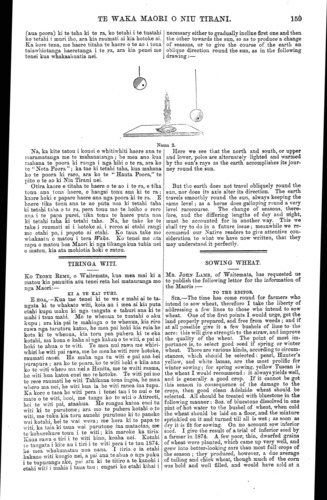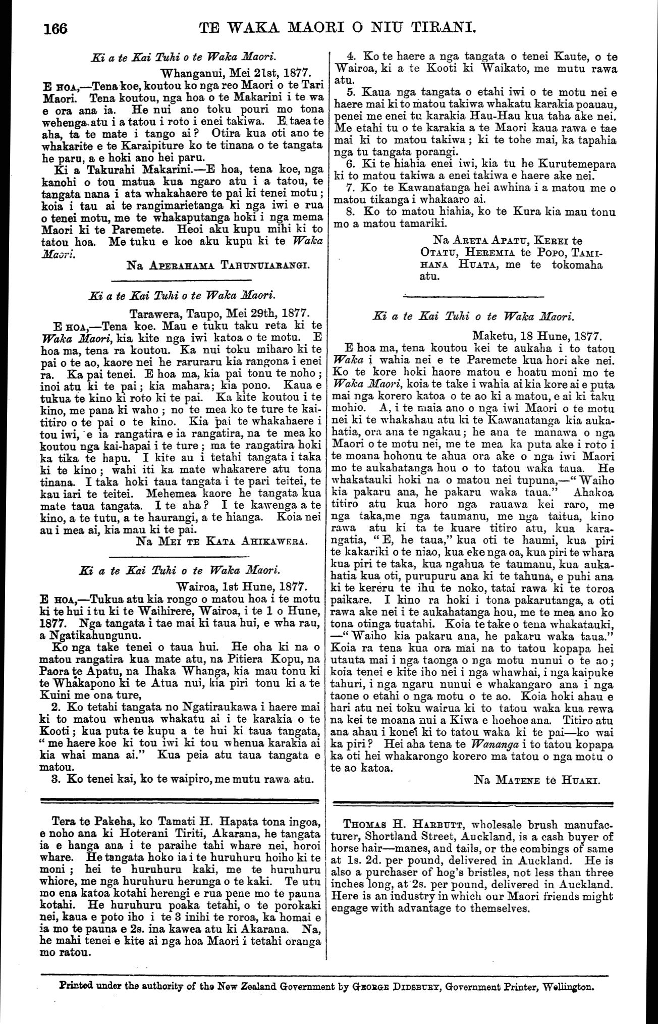 166 TE WAKA MAORI O NIU TIRANI. Ei a te Kai Tuhi o te Waka Maori. Whanganui, Mei 21st, 1877. E HOA,—Tena koe, koutou ko nga reo Maori o te Tari Maori. Tena koutou, nga hoa o te Makarini i te wa e ora ana ia. He nui ano toku pouri mo tona wehenga atu i a tatou i roto i enei takiwa. E. taea te aha, ta te mate i tango ai ? Otira kua oti ano te whakarite e te Karaipiture ko te tinana o te tangata he paru, a e hoki ano hei paru. Ki a Takurahi Makarini.—E hoa, tena koe, nga kanohi o tou matua kua ngaro atu i a tatou, te tangata nana i ata whakahaere te pai ki tenei motu; koia i tau ai te rangimarietanga ki nga iwi e rua o tenei motu, me te whakaputanga hoki i nga mema Maori ki te Paremete. Heoi aku kupu mihi ki to tatou hoa. Me tuku e koe aku kupu ki te Waka Maori. Na APERAHAMA TAHUNUIARANGI. Ki a te Kai Tuhi o te Waka Maori, Tarawera, Taupo, Mei 29th, 1877. E HOA,—Tena koe. Mau e tuku taku reta ki te Waka Maori, kia kite nga iwi katoa o te motu. E hoa ma, tena ra koutou. Ka nui toku miharo ki te pai o te ao, kaore nei he raruraru kia rangona i enei ra. Ka pai tenei. E hoa ma, kia pai tonu te noho ; inoi atu ki te pai; kia mahara; kia pono. Kaua e tukua te kino ki roto ki te pai. Ka kite koutou i te kino, me pana ki waho ; no te mea ko te ture te kai- titiro o te pai o te kino. Kia pai te whakahaere i tou iwi, e ia rangatira e ia rangatira, na te mea ko koutou nga kai-hapai i te ture ; ma te rangatira hoki ka tika te hapu. I kite au i tetahi tangata i taka ki te kino ; wahi iti ka mate whakarere atu tona tinana. I taka hoki taua tangata i te pari teitei, te kau iari te teitei. Mehemea kaore he tangata kua mate taua tangata. I te aha ? I te kawenga a te kino, a te tutu, a te haurangi, a te hianga. Koia nei au i mea ai, kia mau ki te pai. Na MEI TE KATA AHIKAWERA. Ki a te Kai Tuhi o te Waka Maori. Wairoa, 1st Hune, 1877. E HOA,—Tukua atu kia rongo o matou hoa i te motu ki te hui i tu ki te Waihirere, Wairoa, i te 1 o Hune, 1877. Nga tangata i tae mai ki taua hui, e wha rau, a Ngatikahungunu. Ko nga take tenei o taua hui. He oha ki na o matou rangatira kua mate atu, na Pitiera Kopu, na Paora te Apatu, na Ihaka Whanga, kia mau tonu ki te Whakapono ki te Atua nui, kia piri tonu ki a te Kuini me ona ture, 2. Ko tetahi tangata no Ngatiraukawa i haere mai ki to matou whenua whakatu ai i te karakia o te Kooti; kua puta te kupu a te hui ki taua tangata, " me haere koe ki tou iwi ki tou whenua karakia ai kia whai mana ai." Kua peia atu taua tangata e matou. 3. Ko tenei kai, ko te waipiro, me mutu rawa atu. Tera te Pakeha, ko Tamati H. Hapata tona ingoa, e noho ana ki Hoterani Tiriti, Akarana, he tangata ia e hanga ana i te paraihe tahi whare nei, horoi whare. He tangata hoko ia i te huruhuru hoiho ki te moni ; hei te huruhuru kaki, me te huruhuru whiore, me nga huruhuru herunga o te kaki. Te utu mo ena katoa kotahi herengi e rua pene mo te pauna kotahi. He huruhuru poaka tetahi, o te porokaki nei, kaua e poto iho i te 3 inihi te roroa, ka homai e ia mo te pauna e 2s. ina kawea atu ki Akarana. Na, he mahi tenei e kite ai nga hoa Maori i tetahi oranga mo ratou. 4. Ko te haere a nga tangata o tenei Kaute, o te Wairoa, ki a te Kooti ki Waikato, me mutu rawa atu. 5. Kaua nga tangata o etahi iwi o te motu nei e haere mai ki to matou takiwa whakatu karakia poauau, penei me enei tu karakia Hau-Hau kua taha ake nei. Me etahi tu o te karakia a te Maori kaua rawa e tae mai ki to matou takiwa; ki te tohe mai, ka tapahia nga tu tangata porangi. 6. Ki te hiahia enei iwi, kia tu he Kurutemepara ki to matou takiwa a enei takiwa e haere ake nei. 7. Ko te Kawanatanga hei awhina i a matou me o matou tikanga i whakaaro ai. 8. Ko to matou hiahia, ko te Kura kia mau tonu mo a matou tamariki. Na ARETA APATU, KEREI te OTATU, HEREMIA, te POPO, TAMI- HANA HUATA, me te tokomaha atu. Ki a te Kai Tuhi o te Waka Maori. Maketu, 18 Hune, 1877. E hoa ma, tena koutou kei te aukaha i to tatou Waka i wahia nei e te Paremete kua hori ake nei. Ko te kore hoki haore matou e hoatu moni mo te Waka Maori, koia te take i wahia ai kia kore ai e puta mai nga korero katoa o te ao ki a matou, e ai ki taku mohio. A, i te maia ano o nga iwi Maori o te motu nei ki te whakahau atu ki te Kawanatanga kia auka- hatia, ora ana te ngakau; he ana te manawa o nga Maori o te motu nei, me te mea ka puta ake i roto i te moana hohonu te ahua ora ake o nga iwi Maori mo te aukahatanga hou o to tatou waka taua. He whakatauki hoki na o matou nei tupuna,—"Waiho kia pakaru aua, he pakaru waka taua." Ahakoa titiro atu kua horo nga rauawa kei raro, me nga taka,me nga taumanu, me nga taitua, kino rawa atu ki ta te kuare titiro atu, kua kara- ngatia, " E, he taua," kua oti te haumi, kua piri te kakariki o te niao, kua eke nga oa, kua piri te whara kua piri te taka, kua ngahua te taumanu, kua auka- hatia kua oti, purupuru ana ki te tahuna, e puhi ana ki te kereru te ihu te noko, tatai rawa ki te toroa paikare. I kino ra hoki i tona pakarutanga, a oti rawa ake nei i te aukahatanga hou, me te mea ano ko tona otinga tuatahi. Koia te take o tena whakatauki, —"Waiho kia pakaru ana, he pakaru waka taua." Koia ra tena kua ora mai na to tatou kopapa hei utauta mai i nga taonga o nga motu nunui o te ao ; koia tenei e kite iho nei i nga whawhai, i nga kaipuke tahuri, i nga ngaru nunui e whakangaro ana i nga taone o etahi o nga motu o te ao. Koia hoki ahau e hari atu nei toku wairua ki to tatou waka kua rewa na kei te moana nui a Kiwa e hoehoe ana. Titiro atu ana ahau i konei ki to tatou waka ki te pai—ko wai ka piri ? Hei aha tena te Wananga i to tatou kopapa ka oti hei whakarongo korero ma tatou o nga motu o te ao katoa. Na MATENE te HUAKI. THOMAS H. HARBUTT, wholesale brush manufac- turer, Shortland Street, Auckland, is a cash buyer of horse hair—manes, and tails, or the combings of same at 1s. 2d. per pound, delivered in Auckland. He is also a purchaser of hog's bristles, not less than three inches long, at 2s. per pound, delivered in Auckland. Here is an industry in