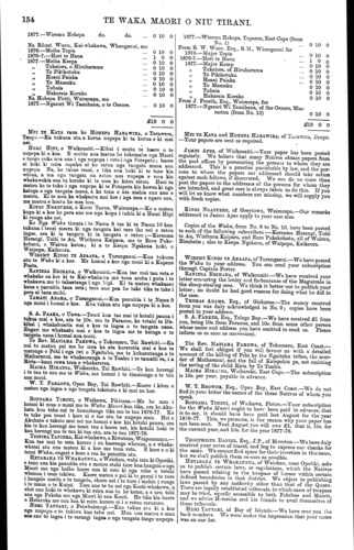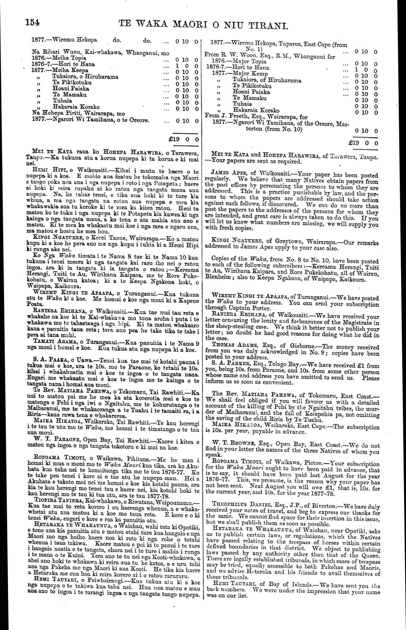 154TE WAKA MAORI O NIU TIRANI. 1877.—Wiremu Hakopa do. do. ... O 10O Na Rihari Wunu, Kai-whakawa, Whanganui, mo 1876.—Meiha Topia ... O 10O 1876-7.—Hori te Hana ... 1 OO v 1877.—Meiha Keepa ... O 10O „ Tukaiora, o Hiruharama ... 010O „ Te Pikikotuku ... 010O „ Hoani Paiaka ... O 10O „ Te Mamaku ... O 10O „ Tuhaia ... O 10O „ Hakaraia Korako ... O 10O Na Hohepa Piriti, Wairarapa, mo 1877.—Ngarori Wi Tamihana, o te Oreore. ... O 10O £19 OO MEI TE KATA raua ko HOHEPA HARAWIRA, o Tarawera, Taupo.—Ka tukuna atu a korua nupepa ki ta korua e ki mai nei. HEMI HIPI, o Waikouaiti.—Kihai i mutu te haere o te nupepa ki a koe. E mohio ana matou he tokomaha nga Maori o tango poka noa ana i nga nupepa i roto i nga Potapeta ; haere ai hoki ki reira rupahu ai ko ratou nga tangata mana aua nupepa. Na, he tahae tenei, e tika ana hoki ki te ture kia whiua, a ma nga tangata na ratou aua nupepa e mea kia whakawakia aua tu koroke ki te mea ka kitea ratou. Heoi ta matou ko te tuku i nga nupepa ki te Potapeta kia kawea ki nga kainga o nga tangata mana, a ko tena e ata mahia ana ano e matou. Ki te mea ka whakaatu mai koe i nga mea e ngaro ana, ma matou e hoatu he mea hou. KINGI .NGATUERE, o Kerei Taone, Wairarapa.—Ko a matou kupu ki a koe he pera ano me nga kupu i tuhia ki a Hemi Hipi ki runga ake nei. Ko Nga Waka, timata i te Nama 8 tae ki te Nama 10 kua tukuna i tenei meera ki nga tangata kai raro iho nei o ratou ingoa, ara ki ia tangata ki ia tangata o ratou ;—Kereama Herangi, Tuiti te Au, Wirihana Kaipara, me te Rore Puke- kohatu, o Wairau katoa; ki a te Keepa Ngakona hoki, o Waipapa, Kaikoura. WIREMU KINGI TE APAAPA, o Turanganui.—Kua tukuna atu te Waka ki a koe. Me homai e koe nga moni ki a Kapene Poata. RANIERA ERIHANA, o Waikouaiti.—Kua tae mai tau reta e whakahe na koe ki te Kai-whakawa mo tona aroha i puta i te whakawa mo te tahaetanga i nga hipi. Ki ta matou whakaaro kaua e panuitia taua reta; tera ano pea he take tika te take i pera ai tana mahi. TAMATI ARAMA, o Turanganui.—Kua panuitia i te Nama 9 nga moni i homai e koe. Kua tukua atu nga nupepa ki a koe. S. A. PAAKA, o Uawa.—Tenei kua tae mai te kotahi pauna i tukua mai e koe, ara te 10s. mo te Paraone, ko tetahi te 10s. kihai i whakahuatia mai e koe te ingoa o te tangata nana. .Engari me whakaatu mai e koe te ingoa me te kainga o te tangata nana i homai aua moni. Te Rev. MATIAHA PAHEWA, o Tokomaru, Tai Rawhiti.—Ka nui to matou pai me he mea ka ata korerotia mai e koe te matenga o Pehi i nga iwi o Ngaitahu, me te kohurutanga o te Maiharanui, me te whakaoranga a te Tuahu i te tamaiti ra, i a Riria—kaua rawa tena e whakarerea. MAIKA HIKATOA, Waikaraka, Tai Rawhiti.—Te kau herengi i te tau te utu mo te Waka, me homai i te timatanga o te tau aua moni. W. T. PARAONE, Open Bay, Tai Rawhiti.—Kaore i kitea e matou nga ingoa o nga tangata tokotoru e ki mai na koe. ROPOAMA TIMOTI, o Waikawa, Pikitara,.—Me he mea i homai ki mua o moni mo te Waka Maori kua tika, ara ko Aku- hata kua taha nei te homaitanga tika mo te tau 1876-77. Ko te take pea tenei i kore ai e tae atu he nupepa mau. Hei a Akuhata e takoto mai nei me homai e koe kia kotahi pauna, ara kia te kau herengi mo tenei tau e haere nei, kia kotahi hoki te kau herengi mo te tau ki tua atu, ara te tau 1877-78.. TIOPIRA TANIERA, Kai-whakawa, o Riwatana, Waipounamu.— Kua tae mai to reta korero i ou haerenga whenua, a e whaka- whetai atu ana matou ki a koe mo taua reta. E kore e o ki tenei Waka,-engari e kore e roa ka panuitia atu. HETARAKA TE WHAKAUNUA, o Waiohau, wahi tata ki Opotiki, e tono ana kia panuitia atu e matou etahi ture kua hangaia e nga Maori mo nga hoiho haere noa ki roto ki nga rohe o tetahi whenua i taua takiwa. Kaore matou e pai ki te panui i te ture i hangaia noatia e te tangata, ehara nei i te ture i mahia i runga i te mana o te Kuini. Tera ano te tu nei nga Kooti-whakawa, e ahei ano hoki te whakawa ki reira aua tu he katoa, a e uru tahi ana nga Pakeha me nga Maori ki aua Kooti. He tika kia haere a Hetaraka me ona hoa ki reira korero ai i o ratou raruraru. HEMI TAUTAHI, o Peiwhairangi.—Kua tukua atu ki a koe nga nupepa o te takiwa kua taha nei. Hua noa matou e mau ana ano to ingoa i te rarangi ingoa o nga tangata tango nupepa. 1877.—Wiremu Hekopa, Tuparoa, East Cape (from No. 1)... O 10 O From R. W. Woon, Esq., R.M., Whanganui for 1876.—Major Topia... 010 O 1876-7.—Hori te Hana - ... 1 O o 1877.—Major Kemp... 010 O „ Tukaiora, of Hiruharama... O 10 O „ Te Pikikotuku... O 10 O „ Hoani Paiaka... O 10 O „ Te MamakuO 10 O TuhaiaO 10 O „ Hakaraia KorakoO 10 O From J. Freeth, Esq., Wairarapa, for 1877.—Ngarori Wi Tamihana, of the Oreore, Mas- terton (from No. 10)O 10 O £19 O O MEI TE KATA and HOHEPA HARAWIRA, of Tarawera, Taupo. —Your papers are sent as required. JAMES APES, of Waikouaiti.—Your paper has been posted regularly. We believe that many Natives obtain papers from the post offices by personating the persons to whom they are addressed. This is a practice punishable by law, and the per- sons to whom the papers are addressed should take action against such fellows, if discovered. We can do no more than post the papers to the addresses of the persons for whom they are intended, and great care is always taken to do this. If you will let us know what numbers are missing, we will supply you with fresh copies. KINGI NGATUERE, of Greytown, Wairarapa.—Our remarks addressed to James Apes apply to your case also. Copies of the Waka, from No. 8 to No. 10, have been posted to each of the following subscribers :—Kereama Herangi, Tuiti te Au, Wirihana Kaipara, and Rore Pukekohatu, all of Wairau, Blenheim ; also to Keepa Ngakona, of Waipapa, Kaikoura. WIREMU KINGI TE APAAPA, of Turanganui.—We have posted the Waka to your address. You can send your subscription through Captain Porter. RANIERA ERIHANA, of Waikouaiti.—We have received your letter censuring the lenity and forbearance of the Magistrate in the sheep-steali