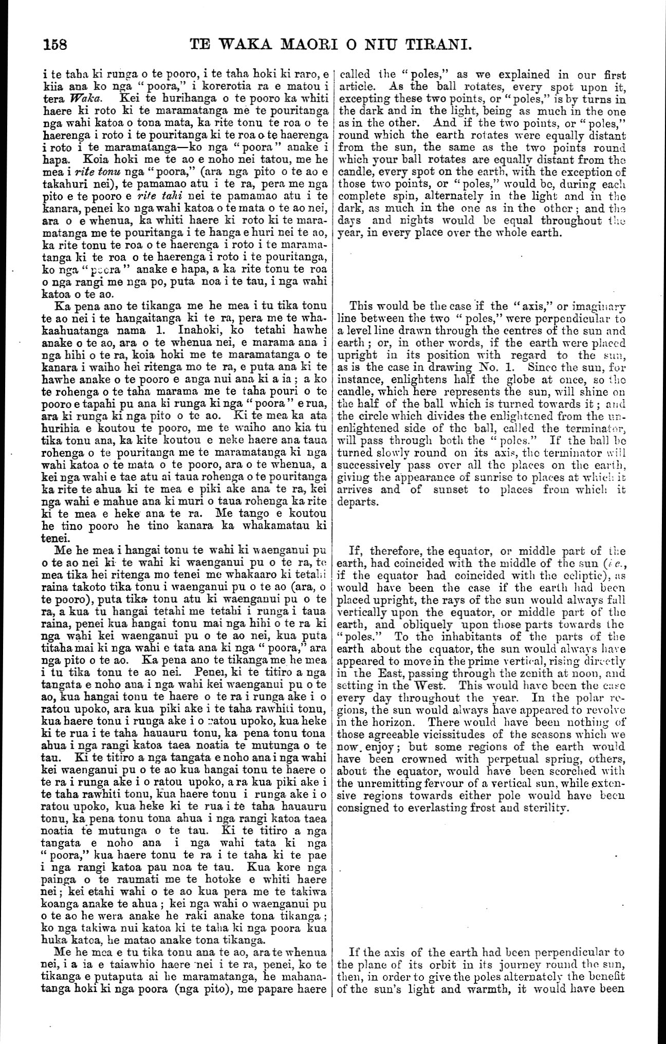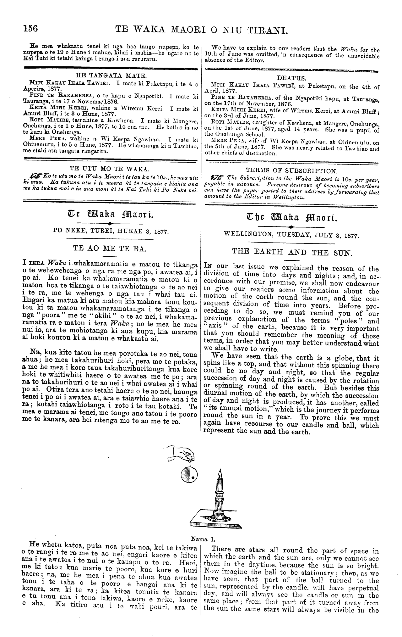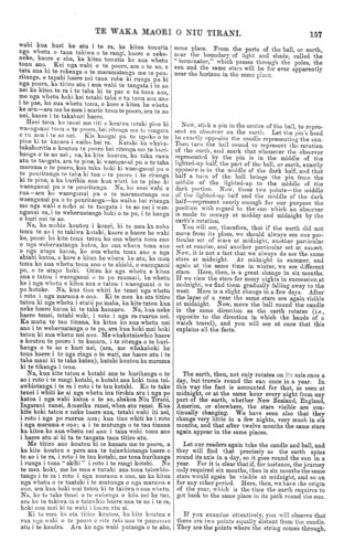 156 TE WAKA MAORI O NIU TIRANI. He mea whakaatu tenei ki nga hoa tango nupepa, ko te nupepa o te 19 o Hune i mahue, kihai i mahia—he ngaro no te Kai Tuhi ki tetahi kainga i runga i ana raruraru. HE TANGATA MATE. MITI KAKAU IHAIA TAWIRI. I mate ki Puketapu, i te 4 o Aperira, 1877. PINE TE RAKAHEREA, o te hapu o Ngapotiki. I mate ki Tauranga, i te 17 o Nowema,'1876. KEITA MIHI KEREI, wahine a Wiremu Kerei. I mate ki Amuri Bluff, i te 3 o Hune, 1877. ROPI MATIRE, tamahine a Kawhena. I mate ki Mangere, Onehunga, i te 1 o Hune, 1877, te 14 ona tau. He kotiro ia no te kura ki Onehunga. MERE PEKA, wahine a Wi Keepa Ngawhau. I mate ki Ohinemutu, i te 5 o Hune, 1877. He whanaunga ki a Tawhiao, me etahi atu tangata rangatira. TE UTU MO TE WAKA. Ko te utu mo te Waka Maori i te tau ka te 10s., he mea utu ki mua. Ka tukuna atu i te meera ki te tangata e hiahia ana me ka tukua mai e ia aua moni ki te Kai Tuki ki Po Neke nei. TE WAKA MAORI. PO NEKE, TUREI, HURAE 3, 1877. TE AO ME TE EA. I TERA Waka i whakamaramatia e matou te tikanga o te wehewehenga o nga ra me nga po, i awatea ai, i po ai. Ko tenei ka whakamaramatia e matou ki o matou hoa te tikanga o te taiawhiotanga o te ao nei i te ra, me te wehenga o nga tau i whai tau ai. Engari ka matua ki atu matou kia mahara tonu kou- tou ki ta matou whakamaramatanga i te tikanga o nga " poora " me te " akihi" o te ao nei, i whakama- ramatia ra e matou i tera Waka; no te mea he mea nui ia, ara te mohiotanga ki aua kupu, kia marama ai hoki koutou ki a matou e whakaatu ai. Na, kua kite tatou he mea porotaka te ao nei, tona ahua; he mea takahurihuri hoki, pera me te potaka, a me he mea i kore taua takahurihuritanga kua kore hoki te whitiwhiti haere o te awatea me te po; ara na te takahurihuri o te ao nei i whai awatea ai i whai po ai. Otira tera ano tetahi haere o te ao nei, haunga tenei i po ai i awatea ai, ara e taiawhio haere ana i te ra ; kotahi taiawhiotanga i roto i te tau kotahi. Te mea e marama ai tenei, me tango ano tatou i te pooro me te kanara, ara hei ritenga mo te ao me te ra. He whetu katoa, puta noa puta noa, kei te takiwa o terangi i te ra me te ao nei, engari kaore e kitea ana i te awatea i te nui o te kanapu o te ra. Heoi, me ki tatou kua marie te pooro, kua kore e huri haere; na, me he mea i pena te ahua kua awatea tonu i te taha o te pooro e hangai ana ki te kanara, ara ki te ra; ka kitea tonutia te kanara e tu tonu ana i tona takiwa, kaore e neke, kaore e aha. Ka titiro atu i te wahi pouri, ara te We have to explain to our readers that the Waka for the 19th of June was omitted, in consequence of the unavoidable absence of the Editor. DEATHS. MITI KAKAU IHAIA TAWIRI, at Puketapu, on the 4th of April, 1877. PINE TE RAKAHEREA, of the Ngapotiki hapu, at Tauranga, on the 17th of November, 1876. KEITA MIHI KEREI, wife of Wiremu Kerei, at Amuri Bluff ; on the 3rd of Juno, 1877. KOPI MATIRE, daughter of Kawhena, at Mangere, Onehunga, on the 1st' of June, 1877, aged 14< years. She was a pupil of the Onehunga School. MERE PEKA, wife of Wi Keepa Ngawhau, at Ohinemutu, on the 5th of Juno, 1877. She was nearly related to Tawhiao and other chiefs of distinction. TERMS OF SUBSCRIPTION. The Subscription to the Waka Maori is 10s .per year, payable in advance. Persons desirous of becoming subscribers can have the paper posted to their address by forwarding that amount to the Editor in Wellington. THE WAKA MAORI. WELLINGTON, TUESDAY, JULY 3, 1877. THE EARTH AND THE SUN. IN pur last issue we explained the reason of the division of time into days and nights ; and, in ac- cordance with our promise, we shall now endeavour to give our readers some information about the motion of the earth round the sun, and the con- sequent division of time into years. Before pro- ceeding to do so, we must remind you of our previous explanation of the terms " poles" and "axis" of the earth, because it is very important that you should remember the meaning of those terms, in order that you may better understand what we shall have to write. We have seen that the earth is a globe, that it spins like a top, and that without this spinning there could be no day and night, so that the regular succession of day and night is caused by the rotation or spinning round of the earth. But besides this diurnal motion of the earth, by which the succession of day and night is produced, it has another, called " its annual motion," which is the journey it performs round the sun in a year. To prove this we must again have recourse to our candle and ball, which represent the sun and the earth. There are stars all round the part of space in which the earth and the sun are, only we cannot see them in the daytime, because the sun is so bright. Now imagine the ball to be stationary; then, as we have seen, that part of the ball turned to the sun, represented by the candle, will have perpetual day, and will always see the candle or sun in the same place ; from that part of it turned away from the sun the same stars will always be visible in the