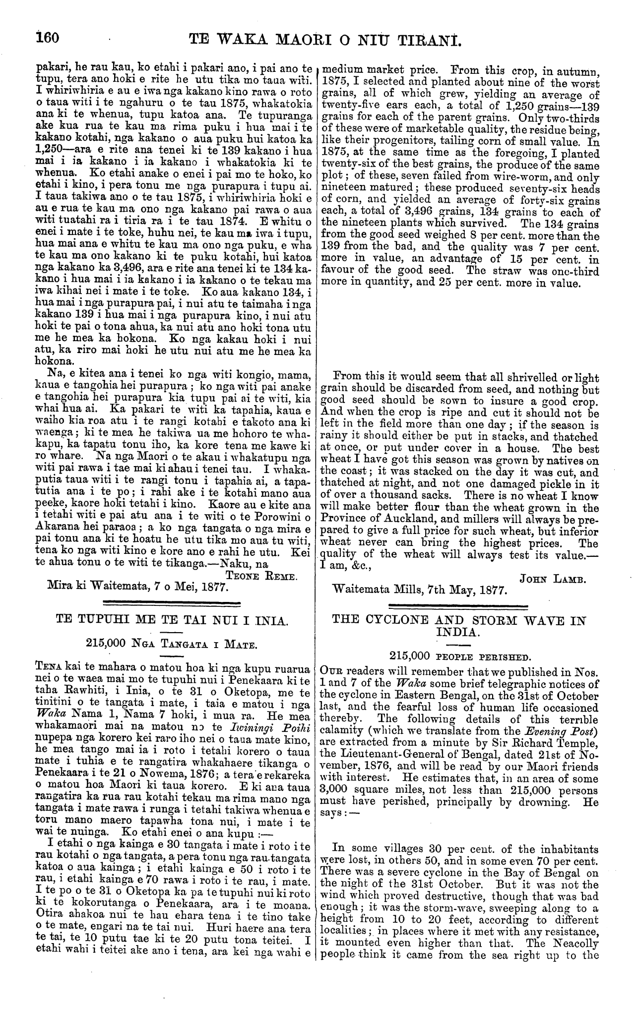 160 TE WAKA MAORI O NIU TIRANI. pakari, he rau kau, ko etahi i pakari ano, i pai ano te tupu, tera ano hoki e rite he utu tika mo taua witi. I whiriwhiria e au e iwa nga kakano kino rawa o roto o taua witi i te ngahuru o te tau 1875, whakatokia ana ki te whenua, tupu katoa ana. Te tupuranga ake kua rua te kau ma rima puku i hua mai i te kakano kotahi, nga kakano o aua puku hui katoa ka 1,250—ara e rite ana tenei ki te 139 kakano i hua mai i ia kakano i ia kakano i whakatokia ki te whenua. Ko etahi anake o enei i pai mo te hoko, ko etahi i kino, i pera tonu me nga purapura i tupu ai. I taua takiwa ano o te tau 1875, i whiriwhiria hoki e au e rua te kau ma ono nga kakano pai rawa o aua witi tuatahi ra i tiria ra i te tau 1874. E whitu o enei i mate i te toke, huhu nei, te kau m* iwa i tupu, hua mai ana e whitu te kau ma ono nga puku, e wha te kau ma ono kakano ki te puku kotahi, hui katoa nga kakano ka 3,496, ara e rite ana tenei ki te 134 ka- kano i hua mai i ia kakano i ia kakano o te tekau ma iwa kihai nei i mate i te toke. Ko aua kakano 134, i hua mai i nga purapura pai, i nui atu te taimaha i nga kakano 139 i hua mai i nga purapura kino, i nui atu hoki te pai o tona ahua, ka nui atu ano hoki tona utu me he mea ka hokona. Ko nga kakau hoki i nui atu, ka riro mai hoki he utu nui atu me he mea ka hokona. Na, e kitea ana i tenei ko nga witi kongio, mama, kaua e tangohia hei purapura ; ko nga witi pai anake e tangohia hei purapura kia tupu pai ai te witi, kia whai hua ai. Ka pakari te witi ka tapahia, kaua e waiho kia roa atu i te rangi kotahi e takoto ana ki waenga; ki te mea he takiwa ua me hohoro te wha- kapu, ka tapatu tonu iho, ka kore tena me kawe ki ro whare. Na nga Maori o te akau i whakatupu nga witi pai rawa i tae mai ki ahau i tenei tau. I whaka- putia taua witi i te rangi tonu i tapahia ai, a tapa- tutia ana i te po; i rahi ake i te kotahi mano aua peeke, kaore hoki tetahi i kino. Kaore au e kite ana i tetahi witi e pai atu ana i te witi o te Porowini o Akarana hei paraoa ; a ko nga tangata o nga mira e pai tonu ana ki te hoatu he utu tika mo aua tu witi, tena ko nga witi kino e kore ano e rahi he utu. Kei te ahua tonu o te witi te tikanga.—Naku, na TEONE REHE. Mira ki Waitemata, 7 o Mei, 1877. TE TUPUHI ME TE TAI NUI I INIA. 215,000 NGA TANGATA I MATE. TENA kai te mahara o matou hoa ki nga kupu ruarua nei o te waea mai mo te tupuhi nui i Penekaara ki te taha Rawhiti, i Inia, o te 31 o Oketopa, me te tinitini o te tangata i mate, i taia e matou i nga Waka Nama 1, Nama 7 hoki, i mua ra. He mea whakamaori mai na matou no te Iwiningi Poihi nupepa nga korero kei raro iho nei o taua mate kino, he mea tango mai ia i roto i tetahi korero o taua mate i tuhia e te rangatira whakahaere tikanga o Penekaara i te 21 o Nowema, 1876; a tera e rekareka o matou hoa Maori ki taua korero. E ki ana taua rangatira ka rua rau kotahi tekau ma rima mano nga tangata i mate rawa i runga i tetahi takiwa whenua e toru mano maero tapawha tona nui, i mate i te wai te nuinga. Ko etahi enei o ana kupu :— I etahi o nga kainga e 30 tangata i mate i roto i te rau kotahi o nga tangata, a pera tonu nga rau-tangata katoa o aua kainga; i etahi kainga e 50 i roto i te rau, i etahi kainga e 70 rawa i roto i te rau, i mate. I te po o te 31 o Oketopa ka pa te tupuhi nui ki roto ki te kokorutanga o Penekaara, ara i te moana. Otira ahakoa nui te hau ehara tena i te tino take o te mate, engari na te tai nui. Huri haere ana tera te tai, te 10 putu tae ki te 20 putu tona teitei. I etahi wahi i teitei ake ano i tena, ara kei nga wahi e medium market price. From this crop, in autumn, 1875, I selected and planted about nine of the worst grains, all of which grew, yielding an average of twenty-five ears each, a total of 1,250 grains—139 grains for each of the parent grains. Only two-thirds of these were of marketable quality, the residue being, like their progenitors, tailing corn of small value. In l875, at the same time as the foregoing, I planted twenty-six of the best grains, the produce of the same plot; of these, seven failed from wire-worm, and only nineteen matured; these produced seventy-six heads of corn, and yielded an average of forty-six grains each, a total of 3,496 grains, 134 grains to each of the nineteen plants which survived. The 134 grains from the good seed weighed 8 per cent, more than the 139 from the bad, and the quality was 7 per cent, more in value, an advantage of 15 per cent, in favour of the good seed. The straw was one-third more in quantity, and 25 per cent, more in value. Prom this it would seem that all shrivelled or light grain should be discarded from seed, and nothing but good seed should be sown to insure a good crop. And when the crop is ripe and cut it should not be left in the field more than one day ; if the season is rainy it should either be put in stacks, and thatched at once, or put under cover in a house. The best wheat I have got this season was grown by natives cm the coast; it was stacked on the day it was cut, and thatched at night, and not one damaged pickle in it of over a thousand sacks. There is no wheat I know will make better flour than the wheat grown in the Province of Auckland, and millers will always be pre- pared to give a full price for such wheat, but inferior wheat never can bring the highest prices. The quality of the wheat will always test its value.— I am, &c., JOHN LAMB. Waitemata Mills, 7th May, 1877. THE CYCLONE AND STORM WAVE IN INDIA. 215,000 PEOPLE PERISHED. OUR readers will remember that we published in Nos. 1 and 7 of the Waka some brief telegraphic notices of the cyclone in Eastern Bengal, on the 31st of October last, and the fearful loss of human life occasioned thereby. The following details of this terrible calamity (which we translate from the Evening Post) are extracted from a minute by Sir Richard Temple, the Lieutenant- General of Bengal, dated 21st of No- vember, 1876, and will be read by our Maori friends with interest. He estimates th