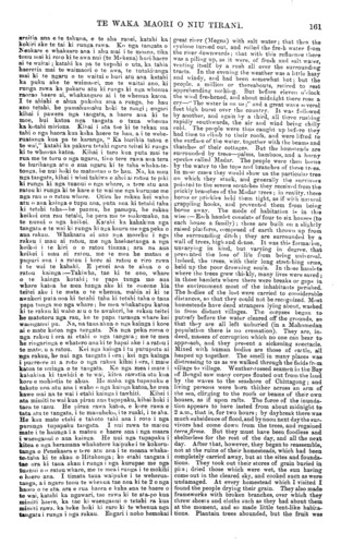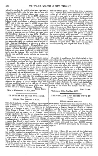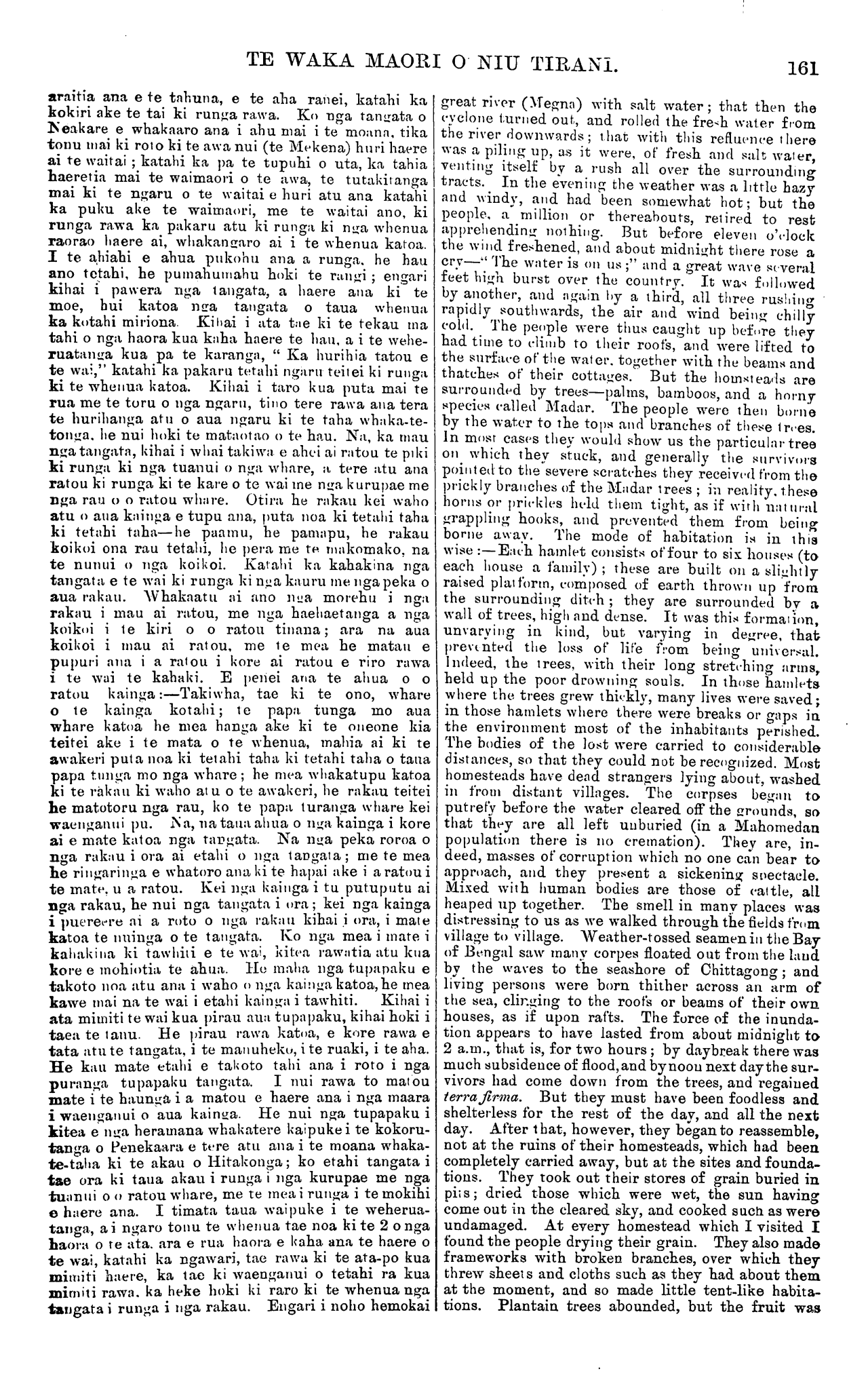 TE WAKA MAORI O NIU TIRANI. 161 araitia ana e te tahuna, e te aha ranei, katahi ka kokiri ake te tai ki runga rawa. Ko nga tangata o Neakare e whakaaro ana i ahu mai i te moana, tika tonu mai ki roto ki te awa nui (te Mekena) huri haere ai te waitai ; katahi ka pa te tupuhi o uta, ka tahia haeretia mai te waimaori o te awa, te tutakitanga mai ki te ngaru o te waitai e huri atu ana katahi ka puku ake te waimaori, me te waitai ano, ki runga rawa ka pakaru atu ki runga ki nga whenua raorao haere ai, whakangaro ai i te whenua katoa. I te ahiahi e ahua pukohu ana a runga, he hau ano tetahi, he pumahumahu hoki te rangi; engari kihai i pawera nga tangata, a haere ana ki te moe, hui katoa nga tangata o taua whenua ka kotahi miriona. Kihai i uta tae ki te tekau ma tahi o nga haora kua kaha haere te hau, a i te wehe- ruatanga kua pa te karanga, " Ka hurihia tatou e te wai," katahi ka pakaru tetahi ngaru teitei ki runga ki te whenua katoa. Kihai i taro kua puta mai te rua me te toru o nga ngaru, tino tere rawa ana tera te hurihanga atu o aua ngaru ki te taha whaka-te- tonga, he nui hoki te mataotao o te hau. Na, ka mau nga tangata, kihai i whai takiwa e ahei ai ratou te piki ki runga ki nga tuanui o nga whare, a tere atu ana ratou ki runga ki te kare o te wai me nga kurupae me nga rau o o ratou whare. Otira he nikau kei waho atu o aua kainga e tupu ana, puta noa ki tetahi taha ki tetahi taha—he paamu, he pamapu, he rakau koikoi ona rau tetahi, he pera me te. makomako, na te nunui o nga koikoi. Kaiahi ka kahakina nga tangata e te wai ki runga ki nga kauru me nga peka o aua rakau. Whakaatu ai ano nga morehu i nga rakau i mau ai ratou, me nga haehaetanga a nga koikoi i 1e kiri o o ratou tinana; ara na aua koikoi i mau ai ratou, me te mea he matau e pupuri ana i a ratou i kore ai ratou e riro rawa i te wai te kahaki. E penei ana te ahua o o ratou kainga:—Takiwha, tae ki te ono, whare o te kainga kotahi; te papa, tunga mo aua whare katoa he mea hanga ake ki te oneone kia teitei ake i te mata o te whenua, inaina ai ki te awaken puta noa ki tetahi taha ki tetahi taha o taua papa tunga mo nga whare; he mea whakatupu katoa ki te rakau ki waho at u o te awakeri, he rakau teitei he matotoru nga rau, ko te papa turanga whare kei waenganui pu. Na, ua taua ahua o nga kainga i kore ai e mate katoa nga tangata. Na nga peka roroa o nga rakau i ora ai etahi o nga tangata; me te mea he ringaringa e whatoro ana ki te hapai ake i a ratou i te mate, u a ratou. Kei nga kainga i tu putuputu ai nga rakau, he nui nga tangata i ora; kei nga kainga i puereere ai a roto o nga rakau kihai i ora, i mate katoa te nuinga o te tangata. Ko nga mea i mare i kahakina ki tawhiti e te wai, kitea rawatia atu kua kore e mohiotia te ahua. Ho maha nga tupapaku e takoto noa atu ana i waho o nga kainga katoa, he mea kawe mai na te wai i etahi kainga i tawhiti. Kihai i ata mimiti te wai kua pirau aua tupapaku, kihai hoki i taea te tanu. He pirau rawa katoa, e kore rawa e tata atu te tangata, i te manuheko, i te ruaki, i te aha. He kau mate etahi e takoto tahi ana i roto i nga puranga tupapaku tangata. I nui rawa to matou mate i te haunga i a matou e haere ana i nga maara i waenganui o aua kainga. He nui nga tupapaku kitea e nga heramana whakatere kaipuke i te kokoru- tanga o Penekaara e tere atu ana i te moana whaka- te-taha ki te akau o Hitakonga; ko etahi tangata i tae ora ki taua akau i runga i nga kurupae me nga tuanui o o ratou whare, me te mea i runga i te mokihi e haere ana. I timata taua waipuke i te weherua- tanga, ai ngaro tonu te whenua tae noa ki te 2 o nga haora o re ata. ara e rua haora e Uaha ana te haere o te wai, katahi ka ngawari, tae rawa ki te ata-po kua mimiti haere, ka tae ki waenganui o tetahi ra kua mimiti rawa, ka heke hoki ki raro ki te whenua nga tangata i runga i nga rakau. Engari i noho hemokai great river (Megna) with salt water; that then the cyclone turned out, and rolled the fresh water from the river downwards; that with this refluence there was a piling up, as it were, of fresh and salt water, venting itself by a rush all over the surrounding tracts. In the evening the weather was a little hazy and windy, and had been somewhat hot; but the people, a million or thereabouts, retired to rest apprehending nothing. But before eleven o'clock the wind freshened, and about midnight there rose a cry—" The water is on us ;" and a great wave several feet high burst over the country. It was followed by another, and again by a third, all three rushing rapidly southwards, the air and wind being chilly cold. The people were thus caught up before they had time to climb to their roofs, and were lifted to the surface of the water, together with the beams and thatches of their cottages. But the homsteads are surrounded by trees—palms, bamboos, and a horny species called Madar. The people were then borne by the water to the tops and branches of these trees. In most cases they would show us the particular tree on which they stuck, and generally the survivors pointed to the severe scratches they received from the prickly branches of the Madar trees ; in reality, these horns or prickles held them tight, as if with natural grappling hooks, and prevented them from being borne away. The mode of habitation is in this wise :—Each hamlet consists of four to six houses (to each house a family) ; these are built on a slightly raised platform, composed of earth thrown up from the surrounding ditch ; they are surrounded by a wall of trees, high and dense. It was this formal ion, unvarying in kind, but varying in degree, that prevented the loss of life from being universal. Indeed, the trees, with their long stretching arms, held up the poor drowning souls. In those hamlet» where the. trees grew thickly, many lives were saved; in those hamlets where there were breaks or gaps ia the environment most of the inhabitants perished. The bodies of the lost were carried to considerable distances, so that they could not be recognized. Most 