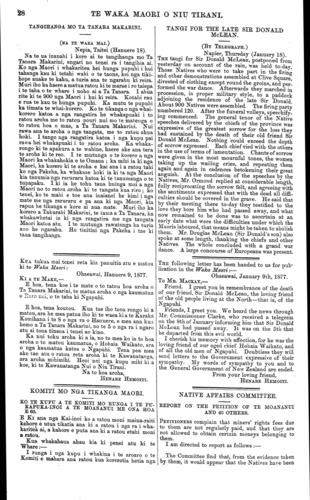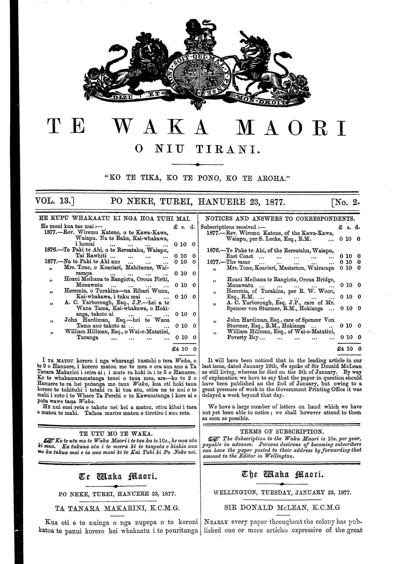 TE WAKA MAORI O NIU TIRANI. —————*————— "KO TE TIKA, KO TE PONO, KO TE AROHA." VOL. 13.]PO NEKE, TUREI, HANUERE 23, 1877. [No. 2. HE KUPU WHAKAATU KI NGA HOA TUHI MAI. He moni kua tae mai:—£ s. d. 1877.—Rev. Wiremu Katene, o te Kawa-Kawa, Waiapu. Na te Raka, Kai-whakawa, i homai ... ... ... ... O 10 O 1876.—Te Paki te Ahi, o te Rereatahu, Waiapu, Tai Rawhiti ... ... ... ... O 10 O 1877.—Na te Paki te Ahi ano ... ... ... 010 O „ Mrs. Tone, o Koariari, Mahitaone, Wai- rarapa... ... ... ... O 10 O „ Hoani Meihana te Rangiotu, Oroua Piriti, Manawatu ... ... ... ... O 10 O „ Heremia, o Turakina—na Rihari Wunu, Kai-whakawa, i tuku mai ... ... 010 O „ A. C. Yarborough, Esq., J.P.—hei a te Wana Tama, Kai-whakawa, o Hoki- anga, takoto ai... ... ... O 10 O „ John Hardiman, Esq.—hei te Wana Tama ano takoto ai ... ... ... O 10 O „ William Hillman, Esq., o Wai-o-Matatini, Turanga ... ... ... ... O 10 O £4 10 O I TA MATOU korero i nga wharangi tuatahi o tera Waka, o te 9 o Hanuere, i korero matou me te mea e ora ana ano a Ta Tanara Makarini i reira ai; i mate ra hoki ia i te 5 o Hanuere. Ko te whakamaramatanga tenei o taua mea, ara—ko te 2 o Hanuere te ra hei putanga mo taua Waka, kua oti hoki taua korero te tuhituhi i tetahi ra ki tua atu, otira na te nui o te mahi i roto i te Whare Ta Perehi o te Kawanatanga i kore ai e puta wawe taua Waka. HE nui enei reta e takoto nei kei a matou, otira kihai i taea e matou te mahi. Taihoa marire matou e tirotiro i aua reta. TE UTU MO TE WAKA. Ko te utu mo te Waka Maori i te tau ka te 10s., he mea utu ki mua. Ka tukuna atu i te meera ki te tangata e hiahia ana e ka tukua mai e ia aua moni ki te Kai Tuhi ki Po Neke nei. TE WAKA MAORI. ———••——— PO NEKE, TUREI, HANUERE 23, 1877. TA TANARA MAKARINI, K.C.M.G. Kua oti e te nuinga o nga nupepa o te koroni katoa te panui korero hei whakaatu i te pouritanga NOTICES AND ANSWERS TO CORRESPONDENTS. Subscriptions received :—£ s. d. 1877.—Rev. Wiremu Katene, of the Kawa-Kawa, Waiapu, per S. Locke, Esq., R.M.... O 10 O 1876.—Te Pake te Ahi, of the Rereatahu, Waiapu, East Coast ... ... ... ... ... O 10 O 1877.—The same ... ... ... ... ... O 10 O „ Mrs. Tone, Koariari, Masterton, Wairarapa O 10 O „ Hoani Meihana te Rangiotu, Oroua Bridge, Manawatu ... ... ... ... ... O 10 O „ Heremia, of Turakina, per R. W. Woon, Esq., R.M. ... ... ... ... ... O 10 O „ A. C. Yarborough, Esq, J.P., care of Mr. Spencer von Sturmer, R.M., Hokianga ... 010 O „ John Hardiman, Esq., care of Spencer Yon Sturmer, Esq., R.M., Hokianga ... ..- 010 O „ William Hillman, Esq., of Wai-o-Matatini, Poverty Bay... ... ... ... ... O 10 O £4 10 O It will have been noticed that in the leading article in our last issue, dated January 19th, we spoke of Sir Donald McLean as still living, whereas he died ou the 5th of January. By way of explanation we have to say that the paper in question should have been published an the 2nd of January, but owing to a great pressure of work in the Government Printing Office it was delayed a week beyond that day. We have a large number of letters on hand which we have not yet been able to notice ; we shall however attend to them as soon as possible. TERMS OF SUBSCRIPTION. The Subscription to the Waka Maori is 10s. per year, payable in advance. Persons desirous of becoming subscribers can have the paper posted to their address by forwarding that amount to the Editor in Wellington. THE WAKA MAORI. ———•«•——— WELLINGTON, TUESDAY, JANUARY 23, 1877. SIR DONALD McLEAN, K.C.M.G NEARLY every paper throughout the colony has pub- lished one or more articles expressive of the great