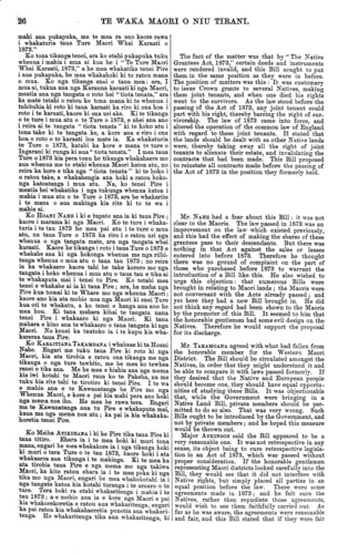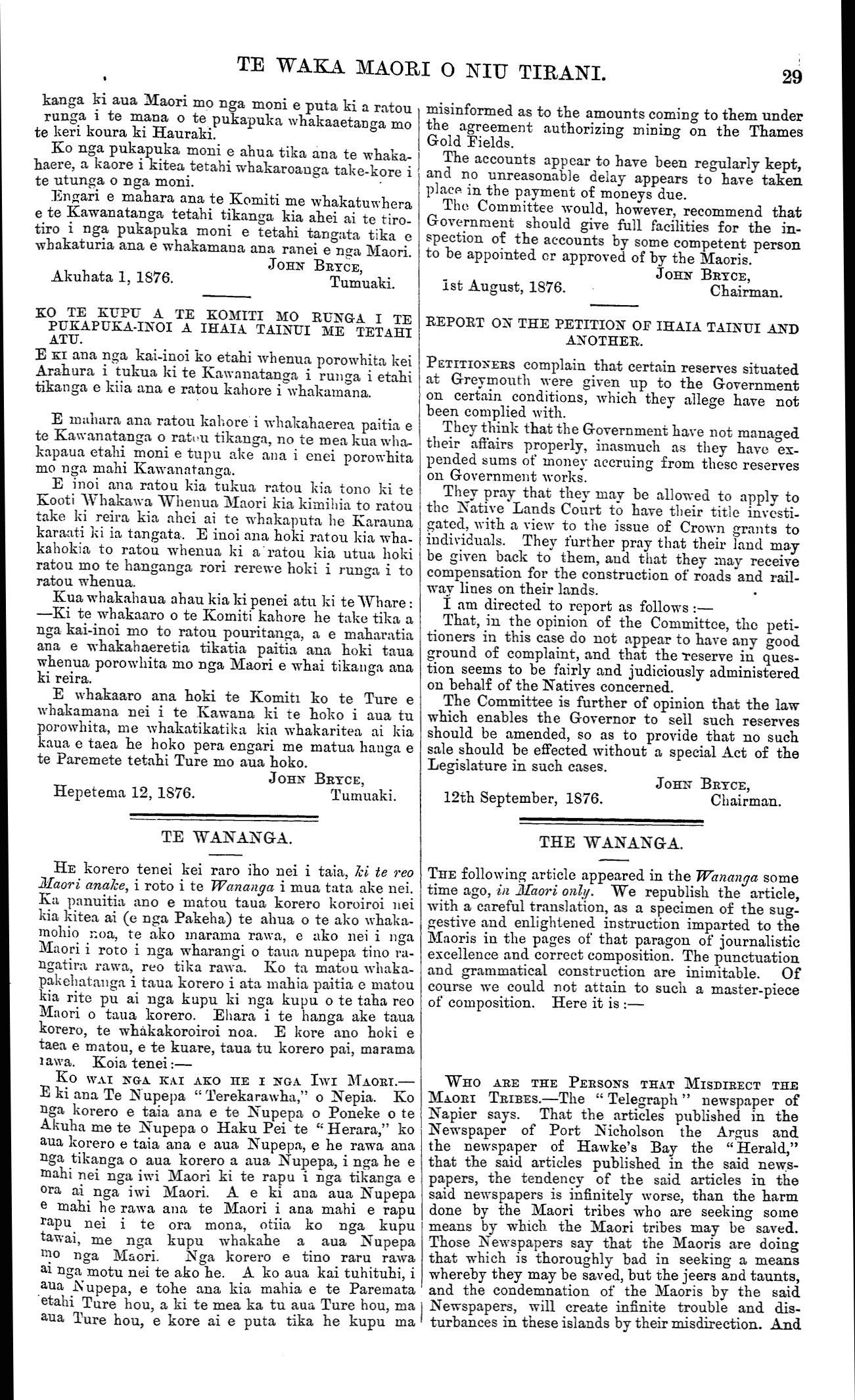 TE WAKA MAORI O NIU TIRANI. 29 kanga ki aua Maori mo nga moni e puta ki a ratou runga i te mana o te pukapuka whakaaetanga mo te keri koura ki Hauraki. Ko nga pukapuka moni e ahua tika ana te whaka- haere, a kaore i kitea tetahi whakaroanga take-kore i te utunga o nga moni. Engari e mahara ana te Komiti me whakatuwhera e te Kawanatanga tetahi tikanga kia ahei ai te tiro- tiro i nga pukapuka moni e tetahi tangata tika e whakaturia ana e whakamana ana ranei e nga Maori. JOHN BRYCE, Akuhata 1, 1876.Tumuaki. KO TE KUPU A TE KOMITI MO RUNGA I TE PUKAPUKA-INOI A IHAIA TAINUI ME TETAHI ATU. E KI ana nga kai-inoi ko etahi whenua porowhita kei Arahura i tukua ki te Kawanatanga i runga i etahi tikanga e kiia ana e ratou kahore i whakamana. E mahara ana ratou kahore i whakahaerea paitia e te Kawanatanga o ratou tikanga, no te mea kua wha- kapaua etahi moni e tupu ake ana i enei porowhita mo nga mahi Kawanatanga. E inoi ana ratou kia tukua ratou kia tono ki te Kooti Whakawa Whenua Maori kia kimihia to ratou take ki reira kia ahei ai te whakaputa he Karauna karaati ki ia tangata. E inoi ana hoki ratou kia wha- kahokia to ratou whenua ki a ratou kia utua hoki ratou mo te hanganga rori rerewe hoki i runga i to ratou whenua. Kua whakahaua ahau kia ki penei atu ki te Whare: —Ki te whakaaro o te Komiti kahore he take tika a nga kai-inoi mo to ratou pouritanga, a e maharatia ana e whakahaeretia tikatia paitia ana hoki taua whenua porowhita mo nga Maori e whai tikanga ana ki reira. E whakaaro ana hoki te Komiti ko te Ture e whakamana nei i te Kawana ki te hoko i aua tu porowhita, me whakatikatika kia whakaritea ai kia kaua e taea he hoko pera engari me matua hanga e te Paremete tetahi Ture mo aua hoko. JOHN BRYCE, Hepetema 12, 1876.Tumuaki. TE WANANGA. HE korero tenei kei raro iho nei i taia, ki te reo Maori anake, i roto i te Wananga i mua tata ake nei. Ka, panuitia ano e matou taua korero koroiroi nei kia kitea ai (e nga Pakeha) te ahua o te ako whaka- mohio noa, te ako marama rawa, e ako nei i nga Maori i roto i nga wharangi o tatua nupepa tino ra- ngatira rawa, reo tika rawa. Ko ta matou whaka- pakehatanga i taua korero i ata mahia paitia e matou kia rite pu ai nga kupu ki nga kupu o te taha reo Maori o taua korero. Ehara i te hanga ake taua korero, te whakakoroiroi noa. E kore ano hoki e taea e matou, e te kuare, taua tu korero pai, marama rawa. Koia tenei:— Ko WAT NGA KAI AKO HE I NGA IWI MAORI.—— E ki ana Te Nupepa " Terekarawha," o Nepia. Ko nga korero e taia ana e te Nupepa o Poneke o te Akuha me te Nupepa o Haku Pei te " Herara," ko aua korero e taia ana e aua Nupepa, e he rawa ana nga tikanga o aua korero a aua Nupepa, i nga he e mahi nei nga iwi Maori ki te rapu i nga tikanga e ora ai nga iwi Maori. A e ki ana aua Nupepa e mahi he rawa ana te Maori i ana mahi e rapu rapu nei i te ora mona, otiia ko nga kupu tawai, me nga kupu whakahe a aua Nupepa mo nga Maori. Nga korero e tino raru rawa ai nga motu nei te ako he. A ko aua kai tuhituhi, i aua Nupepa, e tohe ana kia mahia e te Paremata etahi Ture hou, a ki te mea ka tu aua Ture hou, ma aua Ture hou, e kore ai e puta tika he kupu ma misinformed as to the amounts coming to them under the agreement authorizing mining on the Thames Gold Fields. The accounts appear to have been regularly kept, and no unreasonable delay appears to have taken place in the payment of moneys due. The Committee would, however, recommend that Government should give full facilities for the in- spection of the accounts by some competent person to be appointed or approved of by the Maoris. JOHN BRYCE, 1st August, 1876.Chairman. REPORT ON THE PETITION OF IHAIA TAINUI AND ANOTHER. PETITIONERS complain that certain reserves situated at Greymouth were given up to the Government on certain conditions, which they allege have not been complied with. They think that the Government have not managed their affairs properly, inasmuch as they have ex- pended sums of money accruing from these reserves on Government works. They pray that they may be allowed to apply to the Native Lands Court to have their title investi- gated, with a view to the issue of Crown grants to individuals. They further pray that their land may be given back to them, and that they may receive compensation for the construction of roads and rail- way lines on their lands. I am directed to report as follows :— That, in the opinion of the Committee, the peti- tioners in this case do not appear to have any good ground of complaint, and that the reserve in ques- tion seems to be fairly and judiciously administered on behalf of the Natives concerned. The Committee is further of opinion that the law which enables the Governor to sell such reserves should be amended, so as to provide that no such sale should be effected without a special Act of the Legislature in such cases. JOHN BRYCE, 12th September, 1876.Chairman. THE WANANGA. THE following article appeared in the Wananga some time ago, in Maori only. We republish the article, with a careful translation, as a specimen of the sug- gestive and enlightened instruction imparted to the Maoris in the pages of that paragon of journalistic excellence and correct composition. The punctuation and grammatical construction are inimitable. Of course we could not attain to such a master-piece of composition. Here it is :— WHO ABE THE PERSONS THAT MISDIRECT THE MAORI TRIBES.—The " Telegraph " newspaper of Napier says. That the articles published in the Newspaper of Port Nicholson the Argus and the newspaper of Hawke's Bay the "Herald," that the said articles published in the said news- papers, the tendency of the said articles in the said newspapers is infinitely worse, than the harm done by the Maori tribes who are seeking some means by which the Maori tribes may be saved. Those Newspapers say that the Maoris are doing that which is thoroughly bad in seeking a means whereby they may be saved, but the jeers and taunts, and the condemnation of the Maoris by the said Newspap