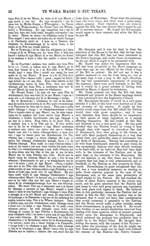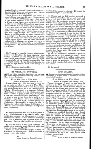 TE WAKA MAORI O NIU TIRANI. tana i mohio ai ; a ko tenei Pire e ki ana me he mea i tika aua whakaritenga me whakamana ano. He tika kia whakaae te Whare ki taua Pire. Ko te HEMARA i ki ko te ahua o taua Pire me te mea e hoki ana tona mana ki muri. Ehara i te mea e hoki ana ki te tau 1873 anake, engari e hoki ana ki te Ture o te tai Rawhiti o te tau 1868. Ka kimikimi te Whare ki nga tikanga e pa ana ki te taha Maori he tika kia ata whakaarohia mariretia aua tikanga. E whakaae ana ia ki nga kupu a nga mema Maori e ki nei e kore e pai nga mema noa atu ki te whaka- puta tikanga hei oranga mo ratou ake ano ; engari ma te Kawanatanga e ata whakaaro taua mea, a ka tuku mai i tetahi tikanga i ata kimihia mariretia. Kaua e ki mai kia rapua e nga mema tenei tu Pire i te mutunga o te Paremete ka tata nei te mutu. Engari me matua tuku taua Pire ki roto ki nga Pakeha me nga Maori, katahi ka taea e ratou te ata whakaaro ki te tikanga e ora ai nga iwi e rua, a ka mahia mariretia taua Pire kia tika ai mo tetahi taha mo tetahi taha. Ka pai ia kia whakakorea taua Pire e te Whare. Ko TAIAROA i ki kaore he wharangi whakamarama i roto i taua Pire, kaore he kupu whakaatu i tona tikanga. E tirohia ana tona tikanga he mea whaka- mana i etahi whakaritenga i mahia i mua ai; engari e mea ana ia he pai kia tangohia atu taua Pire (ara, e te tangata nana). Ka pai kia mahia katoatia nga tikanga mo nga whenua Maori i tera huinga o te Paremete. Heoi, whakarerea ana taua Pire. HE WHARANGI TUWHERA. Ko nga Pakeha matau ki te Reo Maori e tuhi mai ana ki tenei nupepa me tuhi mai a ratou reta ki nga reo e rua—te reo Maori me te reo Pakeha ano. Ki a te Kai Tuhi o te Waka Maori. Putiki, Whanganui, Hanuere 9, 1877. E HOA,—Tena koe. Tena taku reta ka tukua atu na kia utaina atu e koe ki runga ki te Waka Maori : he pouritanga ki to tatou hoa, ki a Ta Tanara Maka- rini, ko ia hoki te Minita mo te iwi Maori me te iwi Pakeha. He nui te pouri ki te matenga o Ta Tanara Makarini, no te mea ko ia te kai-whakahaere o tenei motu. Ka nui te pouri o tenei iwi, o Whanganui e kore rawa e rite tetahi Minita ina whakaritea i muri a ia, no te mea he reo Maori ia, he mohio ia ki te whakaaro o nga Maori. Ki te noho he Minita reo Pakeha anake mo te Maori, e kore e marama tana whakahaere. He manaaki i te tangata, he tohu i te tangata, he whakaora i te tangata te tikanga o ta te Makarini tana whakahaere—he hapai i te rangimarie- tanga i tenei motu. He kupu poroporoaki enei naku ki a ia—Haere ra e pa! Haere i runga i te ara tika; ka waiho i muri nei kia kohi kau ana i au tikanga pai, no te mea ko koe te matua o te iti o te rahi, o te tutua o te ranga- tira. Nau i whakauru nga rangatira Maori ki te Paremete. Haere, e toku hoa, ki te ara o te mate. Ko ahau te tuatahi ki roto ki te Paremete. Ko wai ka hua e whakarite tetahi Minita i tetahi mahi mana hei tika mo nga Maori ? Katahi ano au ka tuhi ki te nupepa; ho aroha nui ki to tatou hoa kua ngaro nei. Kua puta nui ake te mamae i roto i toku ngakau. Na METE KINGI te RANGI-PAETAHI. and honest they should be enforced. He trusted the House would agree to pass the Bill. Mr. HAMLIN said the Bill certainly appeared to have a retrospective effect. It not only went back as far as 1873. but it went back to the East Coast Act of 1868. In considering matters affecting the Natives, it was only right that the House should deal with them calmly and dispassionately. He certainly agreed with the Native members who had spoken that it was wrong for private members of the House to bring forward measures simply to protect them- selves. If an amendment of the law with regard to the Natives was required, it was the duty of the Government to consider the matter, and bring down a well-digested measure. They should not be asked at the last stage of the Session to consider such a Bill as this. It should first of all be circulated amongst Europeans as well as Maoris, and then they would be able fairly to consider the well-being of the two races, and endeavour to make the Bill meet the requirements of each. He thought there was very good ground for the dissension which at present occupied the Native mind. He hoped the House would reject the Bill. Mr. TAIAROA said the Bill contained no preamble, and did not in any way explain its object. Appa- rently, it was introduced to validate certain agree- ments entered into at some former time; but he hoped it would be withdrawn. It would be much better to deal with the whole subject of Native lands next session. Bill discharged. OPEN COLUMN. European correspondents who have a knowledge of Maori are requested to be good enough to forward their communi- cations in both languages. To the Editor of the Waka Maori. Putiki, Whanganui, 9th January, 1877. FRIEND,—Greeting. I send you this letter for insertion in the Waka Maori, because we are sorrow- ing for our friend Sir Donald McLean, who was the Minister for the Maoris and also for the Pakehas. The most poignant grief is felt on account of the death of Sir Donald McLean, because he was the guide and director of this island. The Whanganui people are in great grief; no other Minister who may be appointed to take his place can possibly be equal to him, because he understood the Maori language and was acquainted with the character of the Maori people. If a Minister be appointed for the Maoris who speaks English only, his administra- tion will not be clear and intelligible (to us). The policy of Sir Donald McLean was a beneficent and tolerant one, a policy to promote the well-being of the population and to preserve peace in this country. These are my words of farewell to him,—Depart hence, my friend! Go, follow the straight road before you; let those left behind vainly strive to take up your good works, for you were the father of the small and of the great, of the low born and of the noble. Tou it was who introduced Maori chiefs into the Parliament. Go, my friend, on the death road. I, myself, was the first who entered the Parlia- ment. Who 