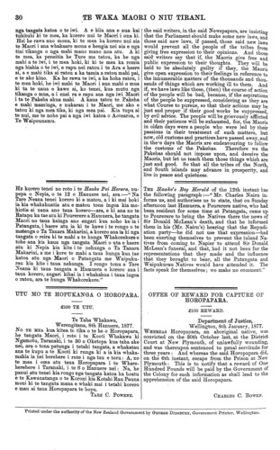 30 TE WAKA MAORI O NIU TIRANI. nga tangata katoa o te iwi. A e kiia ana e aua kai tuhituhi ki te mea, ka korero nui te Maori i ona ki. Hei he rawa ano mona, ki te mea ka korero nui aia te Maori i ana whakaaro mona e hengia nei aia e nga tini tikanga o nga mahi mano mano noa atu. A. ki te mea, ka peneitia he Ture ma tatou, ka he nga mahi a te iwi, i te mea hoki, ki ki te mea ka romia nga hiahia o te iwi, e rapu nei ratou i te Ara e haere ai, a e mahi tika ai ratou a ka tamia a ratou mahi pai, e te ako kino. Ka he rawa te iwi, a ka hoha ratou, i te mea hoki, he iwi mahi te Maori i aua mahi o mua ki ta te uaua e kawe ai, ko tenei, kua mutu nga tikanga o mua, a i enei ra e rapu ana nga iwi Maori i ta te Pakeha ahua mahi. A kaua tatou te Pakeha e mahi maminga, e nukarau i te Maori, me ako e tatou ki nga mea tika, ki nga mea pai. Kia tupu ai te nui, me te noho pai a nga iwi katoa o Aotearoa, o Te Waipounamu. HE korero tenei no roto i te Haake Pei Herara, nu- pepa o Nepia, o te 12 o Hanuere nei, ara:—" Na Tare Neana tenei korero ki a matou, a i ki mai hoki ia kia whakahuatia atu e matou tona ingoa kia mo- hiotia ai nana ano taua korero—ara, e ki ana no te Ratapu ka tae atu ki Pourerere a Hamuera, he tangata Maori no taua kainga ano engari kua noho ke ia i Patangata, i haere atu ia ki te kawe i te rongo o te matenga o Ta Tanara Makarini, a korero ana ia ki nga tangata o reira ki te mahi a te hunga Whakorekore e tohe ana kia kaua nga tangata Maori o uta e haere atu ki Nepia kia kite i te nehunga o Ta Tanara Makarini, a me i kore te mahi a taua hunga kua tae katoa atu nga Maori o Patangata me Waipuku- rau kia kite i taua nehunga. I rongo tonu a Tare Neana ki taua tangata a Hamuera e korero ana i taua korero, engari kihai ia i whakahua i taua ingoa o ratou, ara te hunga Whakorekore." UTU MO TE HOPUKANGA O HOROPARA. £100 TE UTU. Te Taha Whakawa, Werengitana, 8th Hanuere, 1877. No TE MEA kua kitea te: tika o te he o Horopapara, he tangata Maori, i roto i te Kooti Whakawa ki Ngamotu, Taranaki, i te 30 o Oketopa kua taha ake nei, ara o tona patunga i tetahi tangata, a whakatau ana te kupu a te Kooti ki runga ki a ia kia whaka- mahia ia hei herehere i roto i nga tau e toru: A, no te mea i oma atu taua Horopapara i te Whare- herehere i Taranaki, i te 6 o Hanuere nei: Na, he panui atu tenei kia rongo nga tangata katoa ka hoatu e te Kawanatanga o te Koroni kia Kotahi Rau Pauna moni ki te tangata mana e whaki mai i tetahi korero e mau ai taua Horopapara te hopu. TARE C. POWENE. the said writers, in the said Newspapers, are insisting that the Parliament should make some new laws, and those said new laws, if passed, those said new laws would prevent all the people of the tribes from giving free expression to their opinions. And those said writers say that if, the Maoris give free and public expression to their thoughts. They will be held to be absolutely guilty if they, the Maoris give open expression to their feelings in reference to the innumerable matters of the thousands and thou- sands of things which are working ill to them. And if, we have laws like these, (then) the course of action. of the people will be bad, because, if the aspirations of the people be suppressed, considering as they are what Course to pursue, so that their actions may be just and proper if their good works be suppressed, by evil advice. The people will be grievously afflicted and their patience will be exhausted, for, the Maoris in olden days were a people who were led by their passions in their treatment of such matters, but now, old customs and practices have passed away, and in these days the Maoris are endeavouring to follow the customs of the Pakehas. Therefore we the Pakehas should not impose upon, and deceive the Maoris, but let us teach them those things which are just and good. So that all the tribes of the North, and South islands may advance in prosperity, and live in peace and quietness. THE Hawke's Bay Herald of the 12th instant has the following paragraph:—"Mr. Charles Nairn in- forms us, and authorises us to state, that on Sunday afternoon last Hamuera, a Pourerere native, who had been resident for some time at Patangata,, came up to Pourerere to bring the Natives there the news of Sir Donald McLean's death, and that he informed them in his (Mr. Nairn's) hearing that the Repudi- ation party—he did not use that expression—had been exerting themselves to prevent the inland Na- tives from coming to Napier to attend Sir Donald McLean's funeral, and that, had it not been for the representations that they made and the influence that they brought to bear, all the Patangata and Waipukurau Natives would have attended it. The facts speak for themselves ; we make no comment." OFFER OF REWARD FOR CAPTURE OF HOROPAPARA. £100 REWARD. Department o£ Justice, Wellington, 8th January, 1877. WHEREAS Horopapara, an aboriginal native, was convicted on the 30th October last, at the District Court at New Plymouth, of unlawfully wounding, and was thereupon sentenced to penal servitude for three years : And whereas the said Horopapara did, on the 6th instant, escape from the Prison at New Plymouth : This is to notify that a reward of One Hundred Pounds will be paid by the Government of the Colony for such information as shall lead to the apprehension of the said Horopapara. CHARLES C. Printed under the authority of the New Zealand Government by GEORGE DIDSBURY, Government Printer, Wellington-