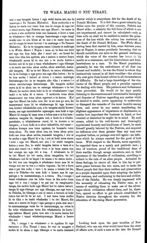 TE WAKA MAORI O NIU TIRANI. nui o nga tangata katoa i nga wahi katoa atu mo te matenga o Ta Tanara Makarini. Kua mohiotia e te katoa he mate nui tenei kua tau ki runga ki nga iwi. o tenei motu, nga Pakeha me nga Maori; he mate ia e kore e ata mohiotia tona nui inaianei, e kore e taea te whakaaro—kei te roanga haeretanga o nga rangi anake ano te ata kitea ai te nui o te mate kua tau nei ki runga ki tenei koroni i te matenga o Ta Tanara Makarini. Ko ia te tangata nana i timata te mahinga o te Waka Maori i Nepia i mua ai, te kau ma toru nei nga tau kua taha ake i muri nei; no konei he mea tino tika kia apitiria atu e matou a matou kupu whakamihi mona ki te reo nui o te motu katoa e korero nei ki te pai o tana whakahaere i nga tikanga o te motu me tona ahua aroha, ahua atawhai, mana- aki tangata. Ki ta te iwi Maori, ta ratou whakaaro, ko ia te huinga o nga pono me nga tika katoa ; ko ia te hoa aroha i tahuri ai ratou i o ratou matenga katoatanga—ko ia te tangata ako tika i a ratou i o ratou rarurarunga katoatanga. He tangata mohio rawa ia ki te ahua me te rerenga whakaaro o te iwi Maori, he mohio rawa hoki ia ki te whakahaere i nga mahi o te taha ki a ratou. I mohiotia tona ahua manawanui me tona ahua ngawari e te katoa. Kei nga hui Maori ka noho noa iho ia ao noa po noa, ka manawanui tonu ki te whakarongo ki nga korero roa, korero whakahoha noa, a te tangata amiki korero mana, me nga tautohetohe ngaungau noa hoki a nga Maori ki runga ki tana mea e tohea ana e ia kia taea; ahakoa tangata iti, tangata nui, e kore ia e whaka- parahako, e whakahawea ranei, ki te korero a te tangata; e kore hoki ia e ahua takawhiti, riri ranei— ahakoa korapa noa tona ngakau, he humarie tonu tona ahua. Na taua ahua ona, na tona ahua pono hoki me tona ahua aroha, manaaki tangata, i nui ai te aroha o nga Maori ki a ia, i nui ai hoki tona mana i roto i nga iwi Maori, nui atu i to etahi tangata katoa o mua iho, to etahi tangata katoa e taea ai a mua ake ranei—a i waiho tonu e ia taua mana ona hei oranga mo nga iwi e rua. I whakaaro ia ki te iwi Maori he iwi maia, ahua rangatira, he iwi whakaaro nui ki te hapai i te mana o to ratou motu ; he iwi toa ona tangata, e whakaaro tonu ana ki te rongo nui me te toa o o ratou tupuna; he iwi e kore ana e pai kia noho i raro i te mana o tetahi iwi ke, ara o te Pakeha—he mea hoki, e kuare ana ki nga painga o te maramatanga, u a ratou. Na, i runga i tenei whakaaro ona ka tohe tonu ia kia noho tonu nga iwi e rua i runga i te pai me te rangimarie- tanga, kia mohio hoki nga Maori kei to ratou tahuri, tanga ki nga ritenga me nga tikanga, me nga ture a te Pakeha, he tikanga e ora ai ratou e tuturu ai hoki ratou hei iwi ki te ao nei. I nui rawa tona mohio ki te tika o te mahi whakaako i te iwi Maori, Ha taea ai e ratou te hopu i nga painga e puta mai ana i te maramatanga raua ko te matauranga, no reira ia ka tohe whakauaua tonu kia whakaturia he kura i nga takiwa Maori puta noa atu i te motu katoa hei whakaako i tenei whakatupuranga Maori e haere ake nei. Na, i runga i te whakaaro o te ngakau ki nga raruraru o Niu Tirani i mua, ko wai te tangata e mohio ki te ahua o nga tikanga o te motu inaianei sorrow which is everywhere felt for the death of Sir Donald McLean. It is felt that a great calamity has fallen upon the people of this country, Pakeha and Maori alike; a calamity the full force of which is not yet experienced, and cannot be calculated—only as time rolls on shall we be enabled to realize the great- ness of the loss which the colony has sustained in the death of Sir Donald McLean. The Waka Maori having been first started by him, some thirteen years ago at Napier, it seems peculiarly becoming that we should contribute our mite to the general testimony which the voice of the country has borne to his merits as a statesman, and his benevolence and kind- heartedness as a man. To the Maori population generally, he was the embodiment of all that was honest and truthful; he was the friend to whom they instinctively turned in all their troubles—the adviser who ever gave them honest advice in all circumstances of difficulty. He had a large knowledge of the cha- racter of the Maori people, and a peculiar capacity for dealing with them. His patience and forbearance were proverbial. He would sit for days quietly listening to the wearisome and interminable harangues and disputes of Natives regarding any matter which he desired to settle, never appearing to undervalue or disregard the remarks of the most humble among them, and never by any means manifesting the slightest appearance of impatience or displeasure, no matter how important the business in hand, or how wearied or disturbed he might be in mind. By such means, added to his well-known and thoroughly appreciated honesty and kindliness of heart, he made himself greatly beloved by the Natives, and acquired an influence over them greater than any man ever acquired before, or perhaps ever will again—an influ- ence which he always exerted for the good of both races. With respect to the Maoris, more especially he regarded them as a manly and patriotic race; a race of warriors, proud of the traditional fame of their warlike though savage ancestors, and, in their ignorance of the benefits of civilization, unwilling to submit to the rule of an alien people. Actuated by these feelings, he strove all that in him lay to pre- serve peace between the two races, and to make the Maori people feel that their welfare and preservation as a people depended upon their adopting the habits and customs, and conforming to the laws and civiliza- tion of the Pakeha. He was deeply impressed with the necessity of educating the Native race, as a means of enabling them to make use of the advan- tages which civilization offered them, and he, there- fore, spared no effort to get schools established in Native districts throughout the country for the education of the rising Maori generation. Looking back upon the past troubles of New Zealand, who can say 