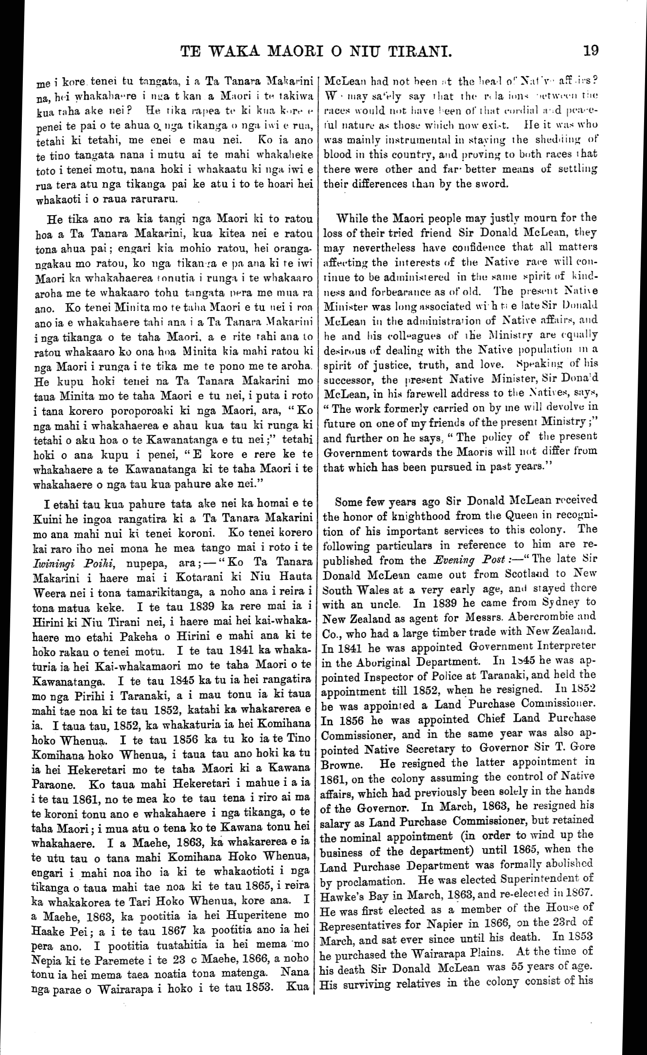 TE WAKA MAORI O NIU TIRANI. 19 me i kore tenei tu tangata, i a Ta Tanara Makarini na, hei whakahaere i nga tikanga Maori i te takiwa kua raha ake nei? He. tika rapea te ki kua korero penei te pai o te ahua o nga tikanga o nga iwi e rua., tetahi ki tetahi, me enei e mau nei. Ko ia ano te tino tangata nana i mutu ai te mahi whakaheke toto i tenei motu, nana hoki i whakaatu ki nga iwi e rua tera atu nga tikanga pai ke atu i to te hoari hei whakaoti i o raua raruraru. He tika ano ra kia tangi nga Maori ki to ratou hoa a Ta Tanara Makarini, kua kitea nei e ratou tona ahua pai; engari kia mohio ratou, hei oranga- ngakau mo ratou, ko nga tikanga e pa ana ki re iwi Maori ka whakahaerea tonutia i runga i te whakaaro aroha me te whakaaro tohu tangata pera me mua ra ano. Ko tenei Minita mo te taha Maori e tu nei i roa ano ia e whakahaere tahi ana i a Ta Tanara Makarini i nga tikanga o te taha Maori, a e rite tahi ana to ratou whakaaro ko ona hoa Minita kia mahi ratou ki nga Maori i runga i te tika me te pono me te aroha. He kupu hoki tenei na Ta Tanara Makarini mo taua Minita mo te taha Maori e tu nei, i puta i roto i tana korero poroporoaki ki nga Maori, ara, " Ko nga mahi i whakahaerea e ahau kua tau ki runga ki tetahi o aku hoa o te Kawanatanga e tu nei;" tetahi hoki o ana kupu i penei, " E kore e rere ke te whakahaere a te Kawanatanga ki te taha Maori i te whakahaere o nga tau kua pahure ake nei." I etahi tau kua pahure tata ake nei ka homai e te Kuini he ingoa rangatira ki a Ta Tanara Makarini mo ana mahi nui ki tenei koroni. Ko tenei korero kai raro iho nei mona he mea tango mai i roto i te Iwiningi Poihi, nupepa, ara; —" Ko Ta Tanara Makarini i haere mai i Kotarani ki Niu Hauta Weera nei i tona tamarikitanga, a noho ana i reira i tona matua keke. I te tau 1839 ka rere mai ia i Hirini ki Niu Tirani nei, i haere mai hei kai-whaka- haere mo etahi Pakeha o Hirini e mahi ana ki te hoko rakau o tenei motu. I te tau 1841 ka whaka- turia ia hei Kai-whakamaori mo te taha Maori o te Kawanatanga. I te tau 1845 ka tu ia hei rangatira mo nga Pirihi i Taranaki, a i mau tonu ia ki taua mahi tae noa ki te tau 1852, katahi ka whakarerea e ia. I taua tau, 1852, ka whakaturia ia hei Komihana hoko Whenua. I te tau 1856 ka tu ko ia te Tino Komihana hoko Whenua, i taua tau ano hoki ka tu ia hei Hekeretari mo te taha Maori ki a Kawana Paraone. Ko taua mahi Hekeretari i mahue i a ia i te tau 1861, no te mea ko te tau tena i riro ai ma te koroni tonu ano e whakahaere i nga tikanga, o te taha Maori; i mua atu o tena ko te Kawana tonu hei whakahaere. I a Maehe, 1863, ka whakarerea e ia te utu tau o tana mahi Komihana Hoko Whenua, engari i mahi noa iho ia ki te whakaotioti i nga tikanga o taua mahi tae noa ki te tau 1865, i reira ka whakakorea te Tari Hoko Whenua, kore ana. I a Maehe, 1863, ka pootitia ia hei Huperitene mo Haake Pei; a i te tau 1867 ka pootitia ano ia hei pera ano. I pootitia tuatahitia ia hei mema mo Nepia ki te Paremete i te 23 e Maehe, 1866, a noho tonu ia hei mema taea noatia tona matenga. Nana nga parae o Wairarapa i hoko i te tau 1853. Kua McLean had not been at the head of Native affairs? We may safely say that the relations between the races would not have been of that cordial and peace- ful nature as those which now exist. He it was who was mainly instrumental in staying the shedding of blood in this country, and proving to both races that there were other and far-better means of settling their differences than by the sword. While the Maori people may justly mourn for the loss of their tried friend Sir Donald McLean, they may nevertheless have confidence that all matters affecting the interests of the Native race will con- tinue to be administered in the same spirit of kind- ness and forbearance as of old. The present Native Minister was long associated with the late Sir Donald McLean in the administration of Native affairs, and he and his colleagues of the Ministry are equally desirous of dealing with the Native population in a spirit of justice, truth, and love. Speaking of his successor, the present Native Minister, Sir Donald McLean, in his farewell address to the Natives, says, " The work formerly carried on by me will devolve in future on one of my friends of the present Ministry;" and farther on he says; " The policy of the present Government towards the Maoris will not differ from that which has been pursued in past years." Some few years ago Sir Donald McLean received the honor of knighthood from the Queen in recogni- tion of his important services to this colony. The following particulars in reference to him are re- published from the Evening Post:—" The late Sir Donald McLean came out from Scotland to New South Wales at a very early age, and stayed there with an uncle. In 1839 he came from Sydney to New Zealand as agent for Messrs. Abercrombie and Co., who had a large timber trade with New Zealand. In 1841 he was appointed Government Interpreter in the Aboriginal Department. In 1845 he was ap- pointed Inspector of Police at Taranaki, and held the appointment till 1852, when he resigned. In 1852 he was appointed a Land Purchase Commissioner. In 1856 he was appointed Chief Land Purchase Commissioner, and in the same year was also ap- pointed Native Secretary to Governor Sir T. Gore Browne. He resigned the latter appointment in 1861, on the colony assuming the control of Native affairs, which had previously been solely in the hands of the Governor. In March, 1863, he resigned his salary as Land Purchase Commissioner, but retained the nominal appointment (in order to wind up the business of the department) until 1865, when the Land Purchase Department was formally abolished by proclamation. He was elected Superintendent of Hawke's Bay in March, 1863, and re-elected in 1867. He was first elected as a member of the House of Representatives for Napier in 1866, on the 23rd of March, and sat ever since until his death. In 1853 he purchased the Wairarapa Plains. At the time of his death S