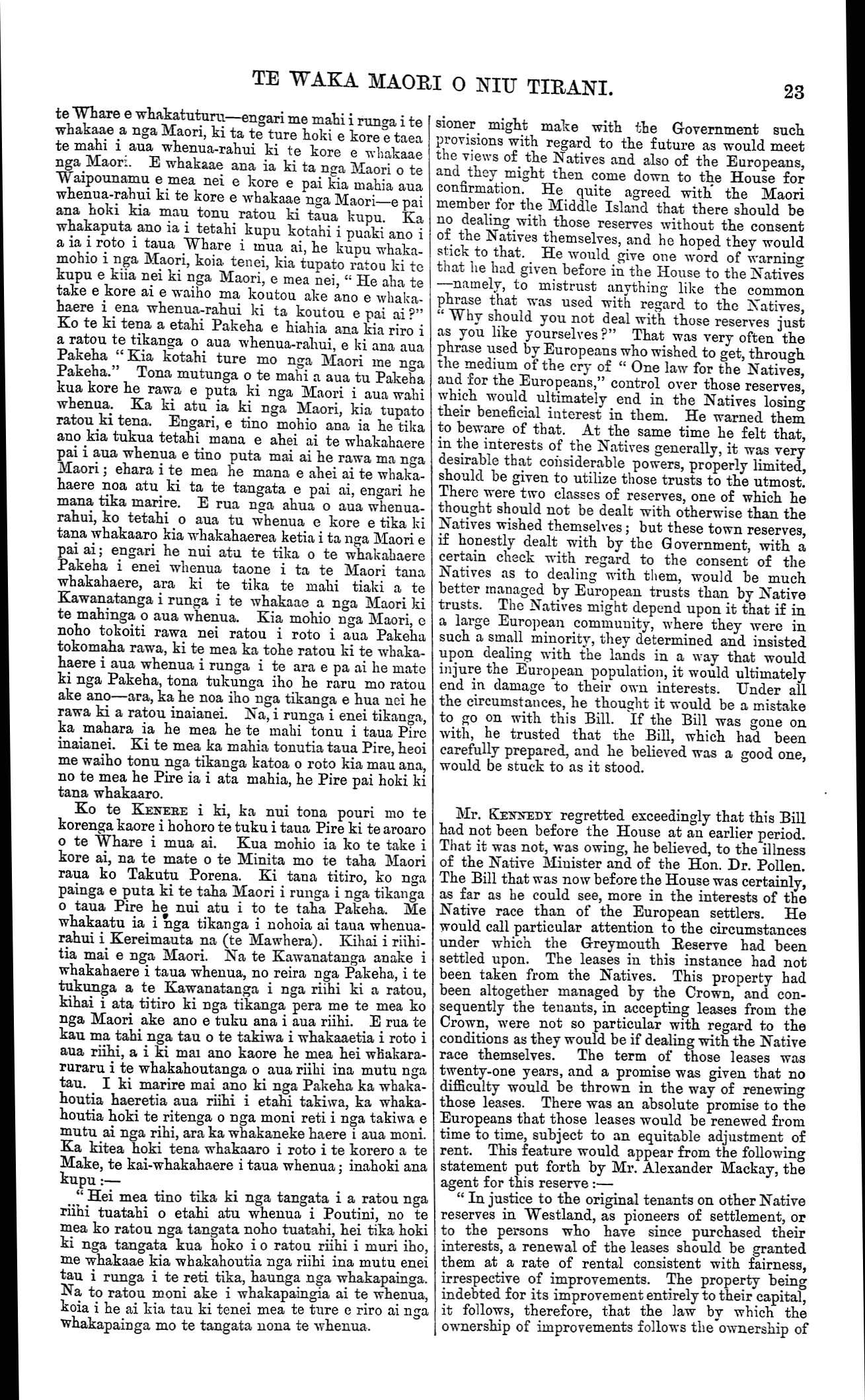 TE WAKA MAORI O NIU TIRANI. 23 te Whare e whakatuturu—engari me mahi i runga i te whakaae a nga Maori, ki ta te ture hoki e kore e taea te mahi i aua whenua-rahui ki te kore e whakaae nga Maori. E whakaae ana ia ki ta nga Maori o te Waipounamu e mea nei e kore e pai kia mahia aua whenua-rahui ki te kore e whakaae nga Maori—e pai ana hoki kia mau tonu ratou ki taua kupu. Ka whakaputa ano ia i tetahi kupu kotahi i puaki ano i a ia i roto i taua Whare i mua ai, he kupu whaka- mohio i nga Maori, koia tenei, kia tupato ratou ki te kupu e kiia nei ki nga Maori, e mea nei, " He aha te take e kore ai e waiho ma koutou ake ano e whaka- haere i ena whenua-rahui ki ta koutou e pai ai ?" Ko te ki tena a etahi Pakeha e hiahia ana kia riro i a ratou te tikanga o aua whenua-rahui, e ki ana aua Pakeha "Kia kotahi ture mo nga Maori me nga Pakeha." Tona mutunga o te mahi a aua tu Pakeha kua kore he rawa e puta ki nga Maori i aua wahi whenua. Ka ki atu ia ki nga Maori, kia tupato ratou ki tena. Engari, e tino mohio ana ia he tika ano kia tukua tetahi mana e ahei ai te whakahaere pai i aua whenua e tino puta mai ai he rawa ma nga Maori; ehara i te mea he mana e ahei ai te whaka- haere noa atu ki ta te tangata e pai ai, engari he mana tika marire. E rua nga ahua o aua whenua- rahui, ko tetahi o aua tu whenua e kore e tika ki tana whakaaro kia whakahaerea ketia i ta nga Maori e pai ai; engari he nui atu te tika o te whakahaere Pakeha i enei whenua taone i ta te Maori tana whakahaere, ara ki te tika te mahi tiaki a te Kawanatanga i runga i te whakaae a nga Maori ki te mahinga o aua whenua. Kia mohio nga Maori, e noho tokoiti rawa nei ratou i roto i aua Pakeha tokomaha rawa, ki te mea ka tohe ratou ki te whaka- haere i aua whenua i runga i te ara e pa ai he mate ki nga Pakeha, tona tukunga iho he raru mo ratou ake ano—ara, ka he noa iho nga tikanga e hua nei he rawa ki a ratou inaianei. Na, i runga i enei tikanga, ka mahara ia he mea he te mahi tonu i taua Pire inaianei. Ki te mea ka mahia tonutia taua Pire, heoi me waiho tonu nga tikanga katoa o roto kia mau ana, no te mea he Pire ia i ata mahia, he Pire pai hoki ki tana whakaaro. Ko te KENERE i ki, ka nui tona pouri mo te korenga kaore i hohoro te tuku i taua Pire ki te aroaro o te Whare i mua ai. Kua mohio ia ko te take i kore ai, na te mate o te Minita mo te taha Maori raua ko Takutu Porena. Ki tana titiro, ko nga painga e puta ki te taha Maori i runga i nga tikanga o taua Pire he nui atu i to te taha Pakeha. Me whakaatu ia i nga tikanga i nohoia ai taua whenua- rahui i Kereimauta na (te Mawhera). Kihai i riihi - tia mai e nga Maori. Na te Kawanatanga anake i whakahaere i taua whenua, no reira nga Pakeha, i te tukunga a te Kawanatanga i nga riihi ki a ratou, kihai i ata titiro ki nga tikanga pera me te mea ko nga Maori ake ano e tuku ana i aua riihi. E rua te kau ma tahi nga tau o te takiwa i whakaaetia i roto i aua riihi, a i ki mai ano kaore he mea hei whakara- ruraru i te whakahoutanga o aua riihi ina mutu nga tau. I ki marire mai ano ki nga Pakeha ka whaka- houtia haeretia aua riihi i etahi takiwa, ka whaka- houtia hoki te ritenga o nga moni reti i nga takiwa e mutu ai nga rihi, ara ka whakaneke haere i aua moni. Ka kitea hoki tena whakaaro i roto i te korero a te Make, te kai-whakahaere i taua whenua; inahoki ana kupu:— " Hei mea tino tika ki nga tangata i a ratou nga riihi tuatahi o etahi atu whenua i Poutini, no te mea ko ratou nga tangata noho tuatahi, hei tika hoki ki nga tangata kua hoko i o ratou riihi i muri iho, me whakaae kia whakahoutia nga riihi ina mutu enei tau i runga i te reti tika, haunga nga whakapainga. Na to ratou moni ake i whakapangia ai te whenua, koia i he ai kia tau ki tenei mea te ture e riro ai nga whakapainga mo te tangata nona te whenua. sioner might make with the Government such provisions with regard to the future as would meet the views of the Natives and also of the Europeans, and they might then come down to the House for confirmation. He quite agreed with the Maori member for the Middle Island that there should be no dealing with those reserves without the consent of the Natives themselves, and he hoped they would stick to that. He would give one word of warning that he had given before in the House to the Natives —namely, to mistrust anything like the common phrase that was used with regard to the Natives, " Why should you not deal with those reserves just as you like yourselves?" That was very often the phrase used by Europeans who wished to get, through the medium of the cry of " One law for the Natives, and for the Europeans," control over those reserves, which would ultimately end in the Natives losing their beneficial interest in them. He warned them to beware of that. At the same time he felt that, in the interests of the Natives generally, it was very desirable that considerable powers, properly limited, should be given to utilize those trusts to the utmost. There were two classes of reserves, one of which he thought should not be dealt with otherwise than the Natives wished themselves; but these town reserves, if honestly dealt with by the Government, with a certain check with regard to the consent of the Natives as to dealing with them, would be much better managed by European trusts than by Native trusts. The Natives might depend upon it that if in a large European community, where they were in such a small minority, they determined and insisted upon dealing with the lauds in a way that would injure the European population, it would ultimately end in damage to their own interests. Under all the circumstances, he thought it would be a mistake to go on with this Bill. If the Bill was gone on with, he trusted that the Bill, which had been carefully prepared, and he believed was a good one, would be stuck to as it stood. Mr. KENNEDY regretted exceedingly that this Bill had not been before the House at an earlier period. That it was not, was owing, he believed, to the illness of the Native Minister and 