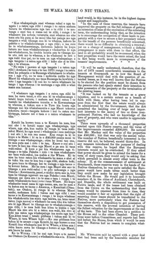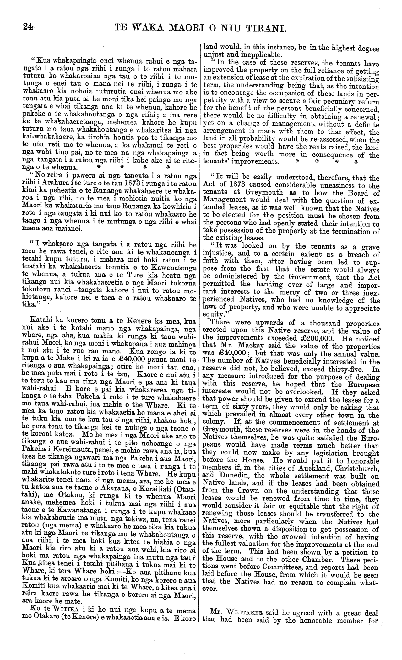 TE WAKA MAORI O NIU TIRANI. "Kua whakapaingia enei whenua rahui e nga ta- ngata i a ratou nga riihi i runga i to ratou mahara tuturu ka whakaroaina nga tau o te riihi i te mu- tunga o enei tau e mana nei te riihi, i runga i te whakaaro kia nohoia tuturutia enei whenua mo ake tonu atu kia puta ai he moni tika hei painga mo nga tangata e whai tikanga ana ki te whenua, kahore he pakeke o te whakahoutanga o nga riihi; a ina rere ke te whakahaeretanga, mehemea kahore he kupu tuturu mo taua whakahoutanga e whakaritea ki nga kai-whakahaere, ka tirohia houtia pea te tikanga mo te utu reti mo te whenua, a ka whakanui te reti o nga wahi tino pai, no te mea na nga whakapainga a nga tangata i a ratou nga riihi i kake ake ai te rite- nga o te whenua. * * * * . "No reira i pawera ai nga tangata i a ratou nga riihi i Arahura i te ture o te tau 1873 i runga i ta ratou kimi ka peheatia e te Runanga whakahaere te whaka- roa i nga rihi, no te mea i mohiotia nuitia ko nga Maori ka whakaturia mo taua Runanga ka kowhiria i roto i nga tangata i ki nui ko to ratou whakaaro he tango i nga whenua i te mutunga o nga riihi e whai mana ana inaianei. " I whakaaro nga tangata i a ratou nga riihi he mea he rawa tenei, e rite ana ki te whakanoanga i tetahi kupu tuturu, i mahara mai hoki ratou i te tuatahi ka whakahaerea tonutia e te Kawanatanga te whenua, a tukua ana e te Ture kia hoatu nga tikanga nui kia whakahaeretia e nga Maori tokorua tokotoru ranei—tangata kahore i nui to ratou mo- hiotanga, kahore nei e taea e o ratou whakaaro te tika." Katahi ka korero tonu a te Kenere ka mea, kua nui ake i te kotahi mano nga whakapainga, nga whare, nga aha, kua mahia ki runga ki taua wahi- rahui Maori, ko nga moni i whakapaua i aua mahinga i nui atu i te rua rau mano. Kua rongo ia ki te kupu a te Make i ki ra ia e £40,000 pauna moni te ritenga o aua whakapainga; otira he moni tau ena, he mea puta mai i roto i te tau, Kaore e nui atu i te toru te kau ma rima nga Maori e pa ana ki taua wahi-rahui. E kore e pai kia whakarerea nga ti- kanga o te taha Pakeha i roto i te ture whakahaere mo taua wahi-rahui, ina mahia e the Whare. Ki te mea ka tono ratou kia whakaaetia he mana e ahei ai te tuku kia ono te kau tau o nga riihi, ahakoa hoki, he pera tonu te tikanga kei te nuinga o nga taone o te koroni katoa. Me he mea i nga Maori ake ano te tikanga o aua wahi-rahui i te pito nohoanga o nga Pakeha i Kereimauta, penei, e mohio rawa ana ia, kua taea he tikanga ngawari ma nga Pakeha i aua Maori, tikanga pai rawa atu i to te mea e taea i ranga i te mahi whakatakoto ture i roto i tena Whare. He kupu whakarite tenei nana ki nga mema, ara, me he mea e tu katoa ana te taone o Akarana, o Karaitiati (Otau- tahi), me Otakou, ki runga ki te whenua Maori anake, mehemea hoki i tukua mai nga riihi i aua taone e te Kawanatanga i runga i te kupu whakaae kia whakahoutia ina mutu nga takiwa, na, tena ranei ratou (nga mema) e whakaaro he mea tika kia tukua atu ki nga Maori te tikanga mo te whakahoutanga o aua riihi, i te mea hoki kua kitea te hiahia o nga Maori kia riro atu ki a ratou aua wahi, kia riro ai hoki ma ratou nga whakapainga ina mutu nga tau ? Kua kitea tenei i tetahi pitihana i tukua mai ki te Whare, ki tera Whare hoki:—Ko aua pitihana kua tukua ki te aroaro o nga Komiti, ko nga korero a aua Komiti kua whakaaria mai ki te Whare, a kitea ana i reira kaore rawa he tikanga e korero ai nga Maori, ara kaore he mate. Ko te WITIKA. i ki he nui nga kupu a te mema mo Otakaro (te Kenere) e whakaaetia ana e ia. E kore land would, in this instance, be in the highest degree unjust and inapplicable. " In the case of these reserves, the tenants have improved the property on the full reliance of getting an extension of lease at the expiration of the subsisting term, the understanding being that, as the intention is to encourage the occupation of these lands in per- petuity with a view to secure a fair pecuniary return for the benefit of the persons beneficially concerned, there would be no difficulty in obtaining a renewal; yet on a change of management, without a definite arrangement is made with them to that effect, the land in all probability would be re-assessed, when the best properties would have the rents raised, the land in fact being worth more in consequence of the tenants' improvements. * * * * " It will be easily understood, therefore, that the Act of 1873 caused considerable uneasiness to the tenants at Greymouth as to how the Board of Management would deal with the question of ex- tended leases, as it was well known that the Natives to be elected for the position must be chosen from the persons who had openly stated their intention to take possession of the property at the termination of the existing leases. "It was looked on by the tenants as a grave injustice, and to a certain extent as a breach of faith with them, after having been led to sup- pose from the first that the estate would always be administered by the Government, that the Act permitted the handing over of large and impor- tant interests to the mercy of two or three inex- perienced Natives, who had no knowledge of the laws of property, and who were unable to appreciate equity." There were upwards of a thousand properties erected upon this Native reserve, and the value of the improvements exceeded £200,000. He noticed that Mr. Mackay said the value of the properties was £40,000; but that was only the annual value. The number of Natives beneficially interested in the reserve did not, he believed, exceed thirty-five. In any measure introduced for the purpose of dealing with this reserve, he hoped that the European interests would not be overlooked. If they asked that power should be given to extend the leases for a term of sixty years, they would only be asking that which prevailed in almost every other town in the colony. If, at the commencement of settlement at Greymouth, these reserves were in the hands of the Natives themselves, he was quite satisfied the Euro- peans would ha