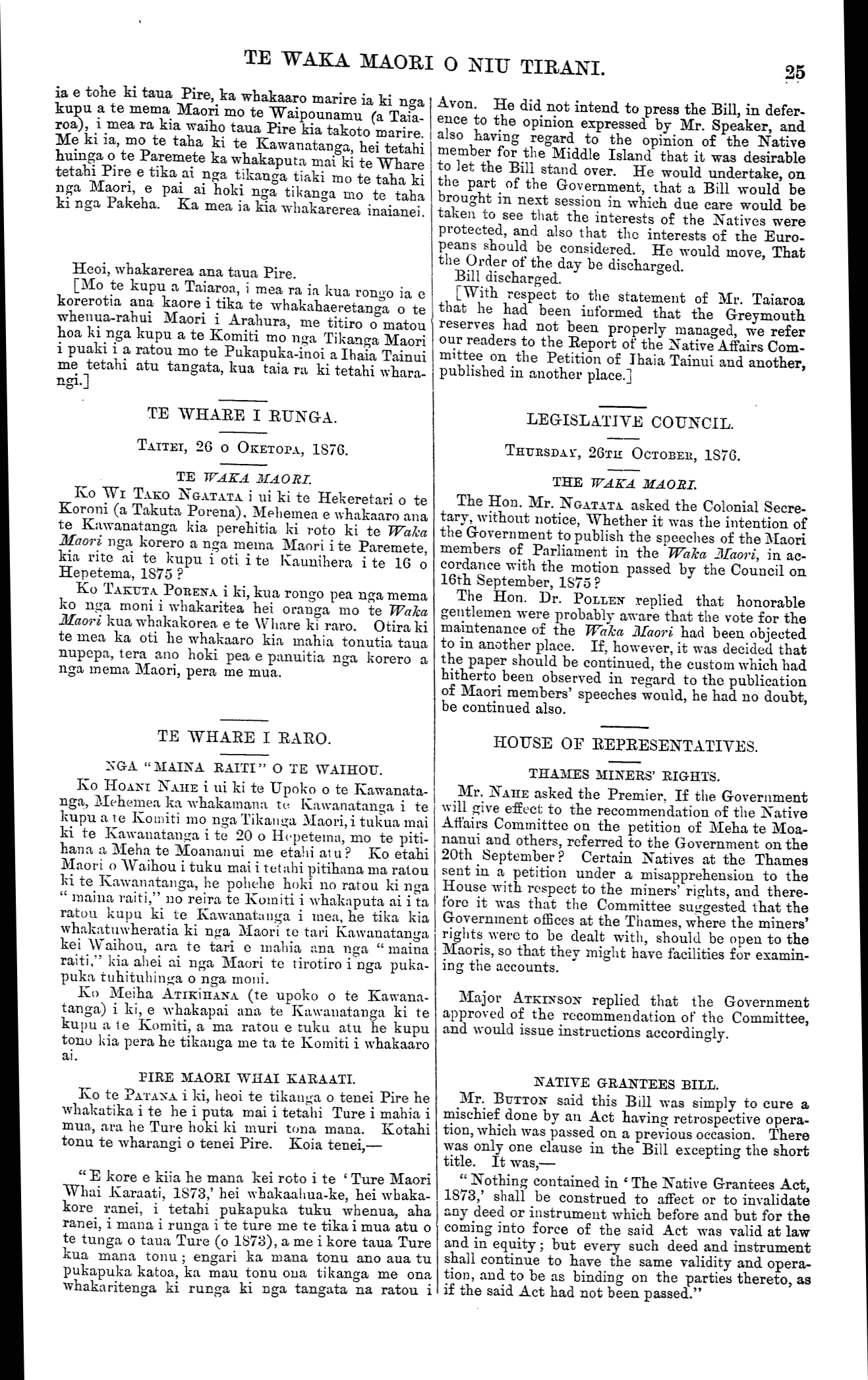 TE WAKA MAORI O NIU TIRANI. ia e tohe ki taua Pire, ka whakaaro marire ia ki nga kupu a te mema Maori mo te Waipounamu (a Taia- roa), i mea ra kia waiho taua Pire kia takoto marire. Me ki ia, mo te taha ki te Kawanatanga, hei tetahi huinga o te Paremete ka whakaputa mai ki te Whare tetahi Pire e tika ai nga tikanga tiaki mo te taha ki nga Maori, e pai ai hoki nga tikanga mo te taha ki nga Pakeha. Ka mea ia kia whakarerea inaianei. Heoi, whakarerea ana taua Pire. [Mo te kupu a Taiaroa, i mea ra ia kua rongo ia e korerotia ana kaore i tika te whakahaeretanga o te whenua-rahui Maori i Arahura, me titiro o matou hoa ki nga kupu a te Komiti mo nga Tikanga Maori i puaki i a ratou mo te Pukapuka-inoi a Ihaia Tainui me tetahi atu tangata, kua taia ra ki tetahi whara- ngi-] TE WHARE I RUNGA. TAITEI, 26 o OKETOPA, 1876. TE WAKA MAORI. Ko WI TAKO NGATATA i ui ki te Hekeretari o te Koroni (a Takuta Porena), Mehemea e whakaaro ana te Kawanatanga kia perehitia ki roto ki te Waka Maori nga korero a nga mema Maori i te Paremete, kia rite ai te kupu i oti i te Kaunihera i te 16 o Hepetema, 1875 ? Ko TAKUTA PORENA i ki, kua rongo pea nga mema ko nga moni i whakaritea hei oranga mo te Waka Maori kua whakakorea e te Whare ki raro. Otira ki te mea ka oti he whakaaro kia mahia tonutia taua nupepa, tera ano hoki pea e panuitia nga korero a nga mema Maori, pera me mua. TE WHARE I RARO. NGA "MAINA RAITI" O TE WAIHOU. Ko HOANI NAHE i ui ki te Upoko o te Kawanata- nga, Mehemea ka whakamana to Kawanatanga i te kupu a re Komiti mo nga Tikanga Maori, i tukua mai ki te Kawanatanga i te 20 o Hepetema, mo te piti- hana a Meha te Moananui me etahi atu? Ko etahi Maori o Waihou i tuku mai i tetahi pitihana ma ratou ki te Kawanatanga, he pohehe hoki no ratou ki nga " maina raiti," no reira te Komiti i whakaputa ai i ta ratou kupu ki te Kawanatanga i mea, he tika kia whakatuwheratia ki nga Maori te tari Kawanatanga kei Waihou, ara te tari o mahia ana nga " maina raiti," kia ahei ai nga Maori te tirotiro i nga puka- puka tuhituhinga o nga moni. Ko Meiha ATIKIHANA (te upoko o te Kawana- tanga) i ki, e whakapai ana te Kawanatanga ki te kupu a te Komiti, a ma ratou e tuku atu he kupu tono kia pera he tikanga me ta te Komiti i whakaaro ai. PIRE MAORI WHAI KARAATI. Ko te PATANA i ki, heoi te tikanga o tenei Pire he whakatika i te he i puta mai i tetahi Ture i mahia i mua, ara he Ture hoki ki muri tona mana. Kotahi tonu te wharangi o tenei Pire. Koia tenei,— " E kore e kiia he mana kei roto i te ' Ture Maori Whai Karaati, 1873,' hei whakaahua-ke, hei whaka- kore ranei, i tetahi pukapuka tuku whenua, aha ranei, i mana i runga i te ture me te tika i mua atu o te tunga o taua Ture (o 1873), a me i kore taua Ture kua mana tonu ; engari ka mana tonu ano aua tu pukapuka katoa, ka mau tonu ona tikanga me ona whakaritenga ki runga ki nga tangata na ratou i Avon. He did not intend to press the Bill, in defer- ence to the opinion expressed by Mr. Speaker, and also having regard to the opinion of the Native member for the Middle Island" that it was desirable to let the Bill stand over. He would undertake, on the part of the Government, that a Bill would be brought in next session in which due care would be taken to see that the interests of the Natives were protected, and also that the interests of the Euro- peans should be considered. He would move, That the Order of the day be discharged. Bill discharged. [With respect to the statement of Mr. Taiaroa that he had been informed that the Greymouth reserves had not been properly managed, we refer our readers to the Report of the Native Affairs Com- mittee on the Petition of Ihaia Tainui and another, published in another place.] LEGISLATIVE COUNCIL. THURSDAY, 26TH OCTOBER, 1876. THE WAKA MAORI. The Hon. Mr. NGATATA, asked the Colonial Secre- tary, without notice, Whether it was the intention of the Government to publish the speeches of the Maori members of Parliament in the Waka Maori, in ac- cordance with the motion passed by the Council on 16th September, l875 ? The Hon. Dr. POLLEN replied that honorable gentlemen were probably aware that the vote for the maintenance of the Waka Maori had been objected to in another place. If, however, it was decided that the paper should be continued, the custom which had hitherto been observed in regard to the publication of Maori members' speeches would, he had no doubt, be continued also. HOUSE OF REPRESENTATIVES. THAMES MINERS' RIGHTS. Mr. NAHE asked the Premier, If the Government will give effect to the recommendation of the Native Affairs Committee on the petition of Meha te Moa- nanui and others, referred to the Government on the 20th September? Certain Natives at the Thames sent in a petition under a misapprehension to the House with respect to the miners' rights, and there- fore it was that the Committee suggested that the Government offices at the Thames, where the miners' rights were to be dealt with, should be open to the Maoris, so that they might have facilities for examin- ing the accounts. Major ATKINSON replied that the Government approved of the recommendation of the Committee, and would issue instructions accordingly. NATIVE GRANTEES BILL. Mr. BUTTON said this Bill was simply to cure a mischief done by an Act having retrospective opera- tion, which was passed on a previous occasion. There was only one clause in the Bill excepting the short title. It was,— " Nothing contained in ' The Native Grantees Act, 1873,' shall be construed to affect or to invalidate any deed or instrument which before and but for the coming into force of the said Act was valid at law and in equity; but every such deed and instrument shall continue to have the same validity and opera- tion, and to be as binding on the parties thereto, as if the said Act had not been passed."