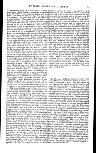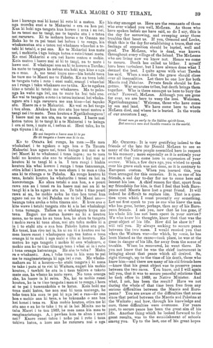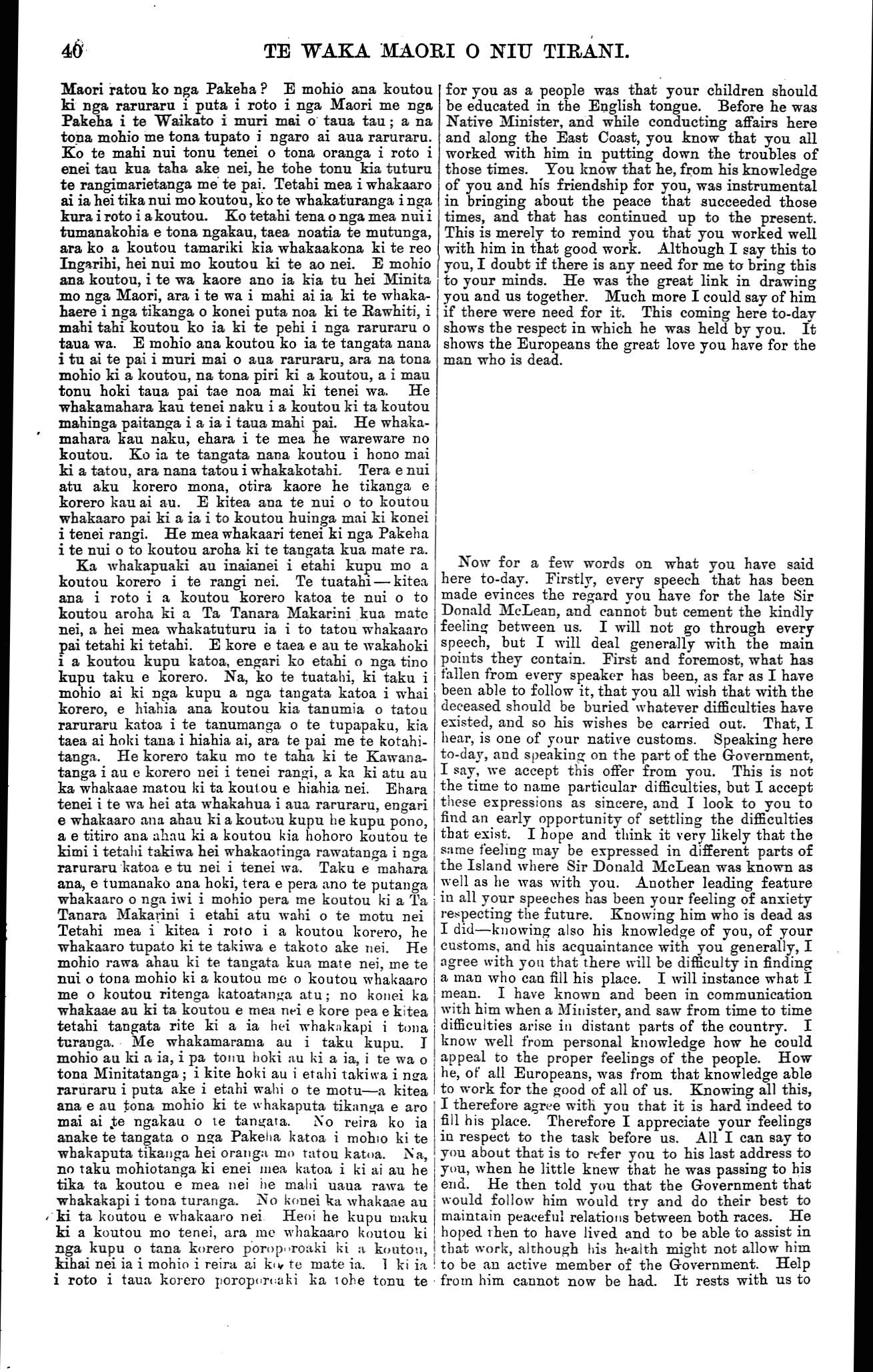 TE WAKA MAORI O NIU TIRANI. Maori ratou ko nga Pakeha ? E mohio ana koutou ki nga raruraru i puta i roto i nga Maori me nga Pakeha i te Waikato i muri mai o taua taua na tona mohio me tona tupato i ngaro ai aua raruraru. Ko te mahi nui tonu tenei o tona oranga i roto i enei tau kua taha ake nei, he tohe tonu kia tuturu te rangimarietanga me te pai. Tetahi mea i whakaaro ai ia hei tika nui mo koutou, ko te whakaturanga i nga kura i roto i a koutou. Ko tetahi tena o nga mea nui i tumanakohia e tona ngakau, taea noatia te mutunga, ara ko a koutou tamariki kia whakaakona ki te reo Ingarihi, hei nui mo koutou ki te ao nei. E mohio ana koutou, i te wa kaore ano ia kia tu hei Minita mo nga Maori, ara i te wa i mahi ai ia ki te whaka- haere i nga tikanga o konei puta noa ki te Rawhiti, i mahi tahi koutou ko ia ki te pehi i nga raruraru o taua wa. E mohio ana koutou ko ia te tangata nana i tu ai te pai i muri mai o aua raruraru, ara na tona mohio ki a koutou, na tona piri ki a koutou, a i mau tonu hoki taua pai tae noa mai ki tenei wa. He whakamahara kau tenei naku i a koutou ki ta koutou mahinga paitanga i a ia i taua mahi pai. He whaka- mahara kau naku, ehara i te mea he wareware no koutou. Ko ia te tangata nana koutou i hono mai ki a tatou, ara nana tatou i whakakotahi. Tera e nui atu aku korero mona, otira kaore he tikanga e korero kau ai au. E kitea ana te nui o to koutou whakaaro pai ki a ia i to koutou huinga mai ki konei i tenei rangi. He mea whakaari tenei ki nga Pakeha i te nui o to koutou aroha ki te tangata kua mate ra. Ka whakapuaki au inaianei i etahi kupu mo a koutou korero i te rangi nei. Te tuatahi — kitea ana i roto i a koutou korero katoa te nui o to koutou aroha ki a Ta Tanara Makarini kua mate nei, a hei mea whakatuturu ia i to tatou whakaaro pai tetahi ki tetahi. E kore e taea e au te wakahoki i a koutou kupu katoa, engari ko etahi o nga tino kupu taku e korero. Na, ko te tuatahi, ki taku i mohio ai ki nga kupu a nga tangata katoa i whai korero, e hiahia ana koutou kia tanumia o tatou raruraru katoa i te tanumanga o te tupapaku, kia taea ai hoki tana i hiahia ai, ara te pai me te kotahi- tanga. He korero taku mo te taha ki te Kawana- tanga i au e korero nei i tenei rangi, a ka ki atu au ka whakaae matou ki ta koutou e hiahia nei. Ehara tenei i te wa hei ata whakahua i aua raruraru, engari e whakaaro ana ahau ki a koutou kupu he kupu pono, a e titiro ana ahau ki a koutou kia hohoro koutou te kimi i tetahi takiwa hei whakaotinga rawatanga i nga raruraru katoa e tu nei i tenei wa. Taku e mahara ana, e tumanako ana hoki, tera e pera ano te putanga whakaaro o nga iwi i mohio pera me koutou ki a Ta Tanara Makarini i etahi atu wahi o te motu nei Tetahi mea i kitea i roto i a koutou korero, he whakaaro tupato ki te takiwa e takoto ake nei. He mohio rawa ahau ki te tangata kua mate nei, me te nui o tona mohio ki a koutou me o koutou whakaaro me o koutou ritenga katoatanga atu; no konei ka whakaae au ki ta koutou e mea nei e kore pea e kitea tetahi tangata rite ki a ia hei whakakapi i tona turanga. Me whakamarama au i taku kupu. I mohio au ki a ia, i pa tonu hoki au ki a ia, i te wa o tona Minitatanga ; i kite hoki au i etahi takiwa i nga raruraru i puta ake i etahi wahi o te motu—a kitea ana e au tona mohio ki te whakaputa tikanga e aro mai ai te ngakau o te tangata. No reira ko ia anake te tangata o nga Pakeha katoa i mohio ki te whakaputa tikanga hei oranga mo tatou katoa. Na, no taku mohiotanga ki enei mea katoa i ki ai au he tika ta koutou e mea nei he mahi uaua rawa te whakakapi i tona turanga. No konei ka whakaae au ki ta koutou e whakaaro nei Heoi he kupu maku ki a koutou mo tenei, ara me whakaaro koutou ki nga kupu o tana korero poroporoaki ki a koutou, kihai nei ia i mohio i reira ai ko te mate ia. 1 ki ia i roto i taua korero poroporoaki ka tohe tonu te for you as a people was that your children should be educated in the English tongue. Before he was Native Minister, and while conducting affairs here and along the East Coast, you know that you all worked with him in putting down the troubles of those times. Tou know that he, from his knowledge of you and his friendship for you, was instrumental in bringing about the peace that succeeded those times, and that has continued up to the present. This is merely to remind you that you worked well with him in that good work. Although I say this to you, I doubt if there is any need for me ta bring this to your minds. He was the great link in drawing you and us together. Much more I could say of him if there were need for it. This coming here to-day shows the respect in which he was held by you. ft shows the Europeans the great love you have for the man who is dead. Now for a few words on what you have said here to-day. Firstly, every speech that has been made evinces the regard you have for the late Sir Donald McLean, and cannot but cement the kindly feeling between us. I will not go through every speech, but I will deal generally with the main points they contain. First and foremost, what has fallen from every speaker has been, as far as I have been able to follow it, that you all wish that with the deceased should be buried whatever difficulties have existed, and so his wishes be carried out. That, I hear, is one of your native customs. Speaking here to-day, and speaking on the part of the Government, I say, we accept this offer from you. This is not the time to name particular difficulties, but I accept these expressions as sincere, and I look to you to find an early opportunity of settling the difficulties that exist. I hope and think it very likely that the same feeling may be expressed in different parts of the Island where Sir Donald McLean was known as well as he was with you. Another leading feature in all your speeches has been your feeling of anxiety respecting the future. Knowing him who is dead as I did—knowing also his knowledge of you, of your customs, and his acquaintance with you generally, I agree with you th