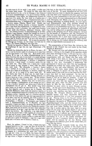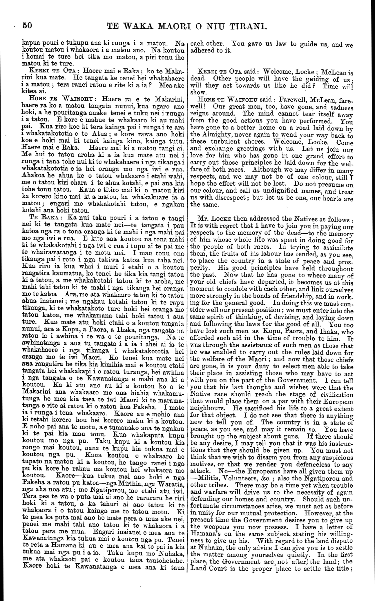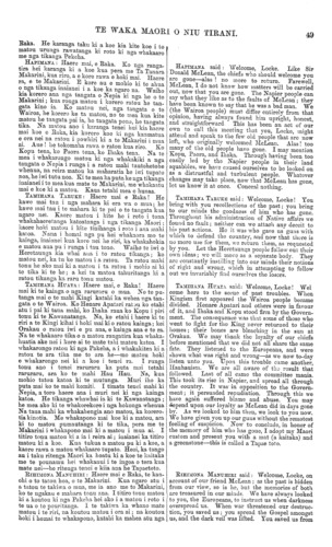 TE WAKA MAORI O NIU TIRANI. Kaka. He karanga taku ki a koe kia kite koe i to matou urunga rawatanga ki roto ki nga whakaaro me nga tikanga Pekeha. HAPIMANA : Haere mai, e Raka. Ko nga ranga- tira hei karanga ki a koe kua pera me Ta Tanara Makarini, kua riro, a e kore rawa e hoki mai. Haere ra, e te Makarini. E kore au e mohio ki te ahua o nga tikanga inaianei i a koe ka ngaro na. Waiho kia korero ana nga tangata o Nepia ki nga he o te Makarini; kua ronga matou i korero ratou he tan- gata kino ia. Ko matou nei, nga tangata o te Wairoa, he korero ke ta matou, no te mea kua kite matou he tangata pai ia, he tangata pono, he tangata tika. Na matou ano i karanga tenei hui kia haere mai koe e Ruka, kia korero koe ki nga kaumatua e ora nei na ratou i powhiri ki a te Makarini i mua ai. Aue ! be tokomaha rawa o ratou kua riro. Ko Kopu tena, ko Paora tena, ko Ihaka tena. Na te mea i whakarongo matou ki nga whakakiki a nga tangata o Nepia i runga i a ratou mahi tautohetohe whenua, na reira matou ka maharatia he iwi tupato noa, he iwi tutu noa. Ki te mea ka puta ke nga tikanga inaianei i te mea kua mate te Makarini, me whakaatu mai e koe ki a matou. Kaua tetahi mea e hunga TAMIHANA TARUKE : Haere mai e Raka! He kawe mai tau i nga mahara ki era wa o mua; he kawe mai tau i to mahara ki te pai o te tangata kua ngaro nei. Kaore matou i kite ho i roto i tona whakahaeretanga katoatanga i nga tikanga Maori; kaore hoki matou i kite tinihanga i roto i ana mahi katoa. Nana i Komai nga pu hei whakaora mo te kainga, inaianei kua kore nei he riri, ka whakahokia e matou aua pu i runga i tau tono. Waiho to iwi o Heretaunga kia whai aua i to ratou tikanga; ko matou nei, ka tu ke matou i a ratou. Ta ratou mahi tonu he ako mai ki a matou i ta ratou i mohio ai ki te tika ki te he; a kei ta matou tahuritanga ki a ratou tikanga ka raru tonu matou. TAMIHANA HUATA : Haere mai, e Raka! Haere mai ki te kainga o nga raruraru o mua. No te pu- tanga mai o te mahi Kingi katahi ka wehea nga tan- gata o te Wairoa. Ko Henare Apatari ratou ko etahi atu i pai ki taua mahi, ko Ihaka raua ko Kopu i piri tonu ki te Kawanatanga. Na, ko etahi i haere ki te riri a te Kingi kihai i hoki mai ki o ratou kainga; kei Orakau o ratou iwi e pu ana, e kainga ana e te ra. Na te whakaaro tika o a matou rangatira kua whaka- huatia ake nei i kore ai te mate tahi matou katoa. whakarongo ratou ki nga Pakeha, a i whakakitea ki a ratou te ara tika me to ara he—mo matou hoki e whakarongo nei ki a koe i tenei ra. I runga tonu ano i tenei raruraru ka puta mai tetahi raruraru, ara ko te mahi Hau Hau. Na, kua mohio tatou katoa ki te mutunga. Muri iho ka puta mai ko te mahi komiti. I timata tenei mahi ki Nepia, a toro haere ana i muri nei ki nga kainga katoa. He tikanga whawhai ia ki te Kawanatanga ; he mea ako ki te whakorekore i nga hokonga whenua Na taua mahi ka whakahengia ano matou, ka korero- tia kinotia. Me whakapono mai koe ki a matou, ara ki to matou pumautanga ki te tika, pera me te Makarini i whakapono mai ki a matou i mua ai. I titiro tonu matou ki a ia i reira ai; inaianei ka titiro matou ki a koe. Kua tukua a matou pu ki a koe, a kaore rawa a matou whakaaro tupato. Heoi, ka tango au i taku ritenga Maori ka hoatu ki a koe te kaitaka me te pounamu hei whakanui i te ingoa o tera kua mate nei—he ritenga tenei e kiia ana he Tapaetoto. RIHIMONA MANUHIRI : Haere mai e Raka, te kan- ohi o to tatou hoa, o te Makarini. Kua ngaro atu i a tatou te takiwa o mua, me ia ano me te Makarini, ko te ngakau e mahara tonu ana. I titiro tonu matou ki a koutou ki nga Pakeha hei ako i a matou i roto i te ua o te pouritanga, I te takiwa ka whano mate matou i te riri, na koutou matou i ora ai; na koutou hoki i homai te whakapono, katahi ka mahea atu nga HAPIMANA said: Welcome, Locke. Like Sir Donald McLean, the chiefs who should welcome you aro gone—alas ! no more to return. Farewell, McLean, I do not know how matters will be carried out, now that you are gone. The Napier people can say what they like as to the faults of McLean; they have been known to say that he was a bad man. We (the Wairoa people) must differ entirely from that opinion, having always found him upright, honest, and straightforward. This has been an act of our own to call this meeting that you, Locke, might attend and speak to the few old people that arc now left, who originally welcomed McLean. Alas! too many of the old people have gone. I may mention Kopu, Paora, and Ihaka. Through having been too easily led by the Napier people in their land squabbles, we have caused ourselves to be looked on as a distrustful and turbulent people. Whatever changes may take place, now that McLean has gone, let us know it at once. Conceal nothing. TAMIHANA TARUKE said: Welcome, Locke! You bring with you recollections of the past; you bring to our minds the goodness of him who has gone. Throughout his administration of Native affairs we found no fault; neither can we attach any deceit to his past actions. He it was who gave us guns with winch to defend the country, and now that there is no more use for them, wo return them, as requested by you. Let the Heretaunga people follow out their own ideas; we will move as a separate body. They arc constantly instilling into our minds their notions of right and wrong, which in attempting to follow out we invariably find ourselves the losers. TAMIHANA HUATA, said: Welcome, Locke! Wel come here to the scene of past troubles. When Kingism first appeared the Wairoa people became divided. Henare Apatari and others were in favour of it, and Ihaka and Kopu stood firm by the Govern- ment. The consequence was that some of those who went to fight for the King never returned to their homes; their bones are bleaching in the sun at Orakau. We may thank the loyalty of our chiefs before mentioned that we did not all share the same fate. They listened to the Europeans, and were shown what was right and wrong—as we now to-day listen unto you. Upon this trouble came another, Hauhauism We are