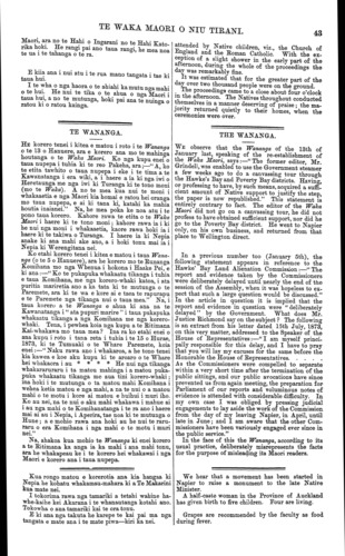 TE WAKA MAORI O NIU TIRANI. 43 Maori, ara no te Hahi o Ingarani no te Hahi Kato- rika hoki. He rangi pai ano taua rangi, he mea noa te ua i te tahanga o te ra. E kiia ana i nui atu i te rua mano tangata i tae ki taua hui. I te wha o nga haora o te ahiahi ka mutu nga mahi o te hui. He nui te tika o te ahua o nga Maori i taua hui, a no te mutunga, hoki pai ana te nuinga o ratou ki o ratou kainga. TE WANANGA. HE korero tenei i kitea e matou i roto i te Wananga o te 13 o Hanuere, ara e korero ana mo te mahinga houtanga o te Waka Maori. Ko nga kupu enei o taua nupepa i tuhia ki te reo Pakeha, ara;—"A, ko te etita tawhito o taua nupepa i eke i te tima a te Kawanatanga i era wiki, a i haere a ia ki nga iwi o Heretaunga me nga iwi ki Turanga ki te tono moni (mo te Waka). A no te mea kua nui te moni i whakaaetia e nga Maori kia homai e ratou hei oranga mo taua nupepa, e ai ki tana ki, katahi ka mahia houtia inaianei." Na, he mea poka ke noa atu i te pono taua korero. Kahore rawa te etita o te Waka Maori i haere ki te tono moni; kahore rawa ia i ki he nui nga moni i whakaaetia, kaore rawa hoki ia i haere ki te takiwa o Turanga. I haere ia ki Nepia anake ki ana mahi ake ano, a i hoki tonu mai ia i Nepia ki Werengitana nei. Ko etahi korero tenei i kitea e matou i taua Wana- nga (o te 5 o Hanuere), ara he korero mo te Runanga Komihana mo nga Whenua i hokona i Haake Pei, e ki ana:—" Ko te pukapuka whakaatu tikanga i tuhia e taua Komihana, me nga korero-whaki katoa, i ata puritia mariretia ano a ka tata ki te mutunga o te Paremete, ara ki te wa e kore ai e taea te rapurapu e te Paremete nga tikanga nui o taua mea." Na, i taua korero a te Wananga e ahua ki ana na te Kawanatanga i " ata pupuri marire " i taua pukapuka whakaatu tikanga a nga Komihana me nga korero- whaki. Tena, i pewhea koia nga kupu a te Ritimana Kai-whakawa mo taua mea ? Ina ra ko etahi enei o ana kupu i roto i tana reta i tuhia i te 15 o Hurae, 1873, ki te Tumuaki o te Whare Paremete, koia enei:—" Naku rawa ano i whakaroa, a he tono tenei kia kawea e koe aku kupu ki te aroaro o te Whare hei whakaora i au * * * * He nui nga tikanga whakararuraru i ta matou mahinga i a matou puka- puka whakaatu tikanga me aua tini korero-whaki; ina hoki i te mutunga o ta matou mahi Komihana i wehea ketia matou e nga mahi, a na te nui o a matou mahi o te motu i kore ai matou e huihui i muri iho. Ko au nei, na te nui o aku mahi whakawa i mahue ai i au nga mahi o te Komihanatanga i te ra ano i haere mai ai au i Nepia, i Aperira, tae noa ki te mutunga o Hune; a e mohio rawa ana hoki au he nui te raru- raru o era Komihana i nga mahi o te motu i muri nei." Na, ahakoa kua mohio te Wananga ki enei korero a te Ritimana ka anga ia ka mahi i ana mahi tonu, ara he whakapeau ke i te korero hei whakawai i nga Maori e korero ana i taua nupepa. Kua rongo matou e korerotia ana kia hangaa ki Nepia he kohatu whakamau-mahara ki a Te Makarini kua mate nei. I tokorima rawa nga tamariki a tetahi wahine ha- whe-kaihe kei Akarana i te whanautanga kotahi ano. Tokowha o aua tamariki kai te ora tonu. E ki ana nga takuta he karepe te kai pai ma nga tangata e mate ana i te mate piwa—kiri ka nei. attended by Native children, viz., the Church of England and the Roman Catholic. With the ex- ception of a slight shower in the early part of the afternoon, during the whole of the proceedings the day was remarkably fine. It was estimated that for the greater part of the day over two thousand people were on the ground. The proceedings came to a close about four o'clock in the afternoon. The Natives throughout conducted themselves in a manner deserving of praise; the ma- jority returned quietly to their homes, when the ceremonies were over. THE WANANGA. WE observe that the Wananga of the 13th of January last, speaking of the re-establishment of the Waka Maori, says:—"The former editor, Mr. Grindell, was enabled to use the Government steamer a few weeks ago to do a canvassing tour through the Hawke's Bay and Poverty Bay districts. Having, or professing to have, by such means, acquired a suffi- cient amount of Native support to justify the step, the paper is now republished." This statement is entirely contrary to fact. The editor of the Waka Maori did not go on a canvassing tour, he did not profess to have obtained sufficient support, nor did he go to the Poverty Bay district. He went to Napier only, on his own business, and returned from that place to Wellington direct. In a previous number too (January 5th), the following statement appears in reference to the Hawke's Bay Land Alienation Commission:—" The report and evidence taken by the Commissioners were deliberately delayed until nearly the end of the session of the Assembly, when it was hopeless to ex- pect that such a large question would be discussed." In the article in question it is implied that the report and evidence in question were " deliberately delayed" by the Government. What does Mr. Justice Richmond say on the subject ? The following is an extract from his letter dated 15th July, 1873, on this very matter, addressed to the Speaker of the House of Representatives:—" I am myself princi- pally responsible for this delay, and I have to pray that you will lay my excuses for the same before the Honorable the House of Representatives. As the Commissioners were compelled to separate within a very short time after the termination of the public sittings, and our public avocations have since prevented us from again meeting, the preparation for Parliament of our reports and voluminous notes of evidence is attended with considerable difficulty. In my own case I was obliged by pressing judicial engagements to lay aside the work of the Commission from the day of my leaving Napier, in April, until late in June; and I am aware that the other Com- missioners have been variously engaged ever since in the public service." In the face of this the Wananga, according to its usual practice, deliberately misrepresents the facts for the p